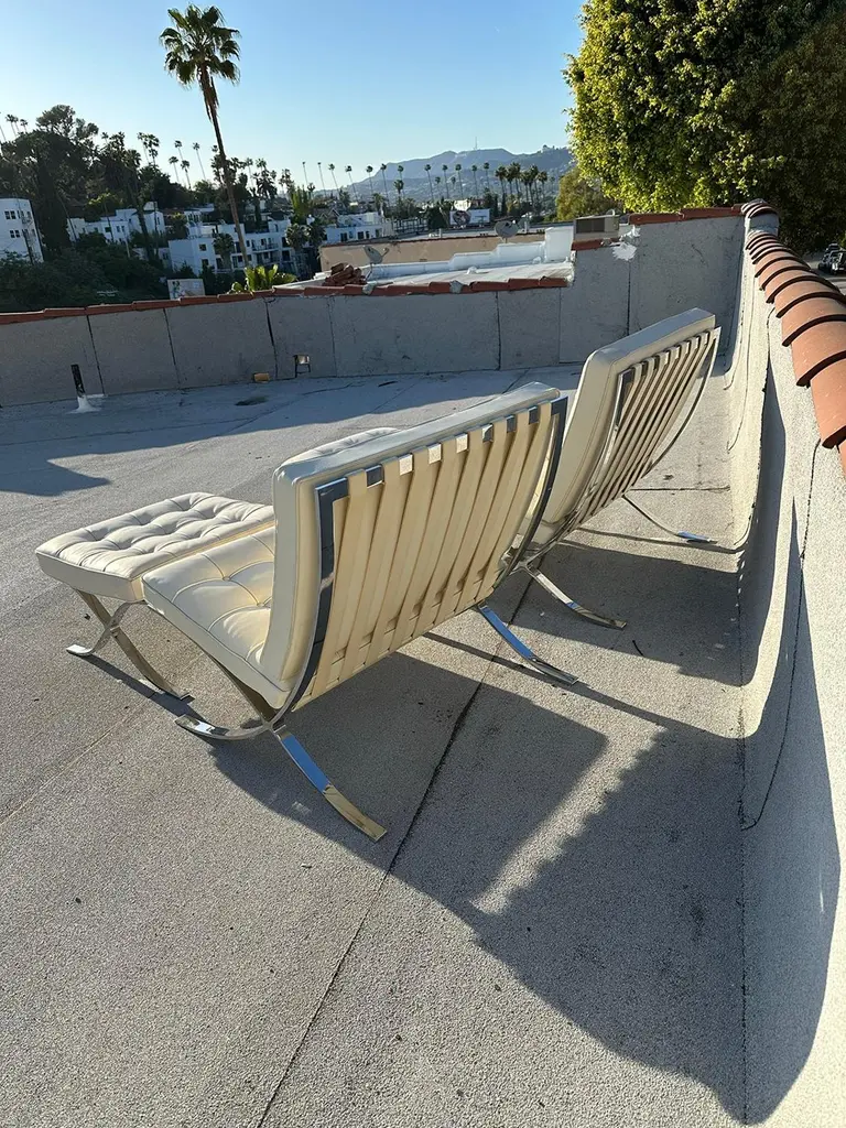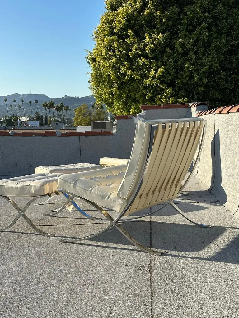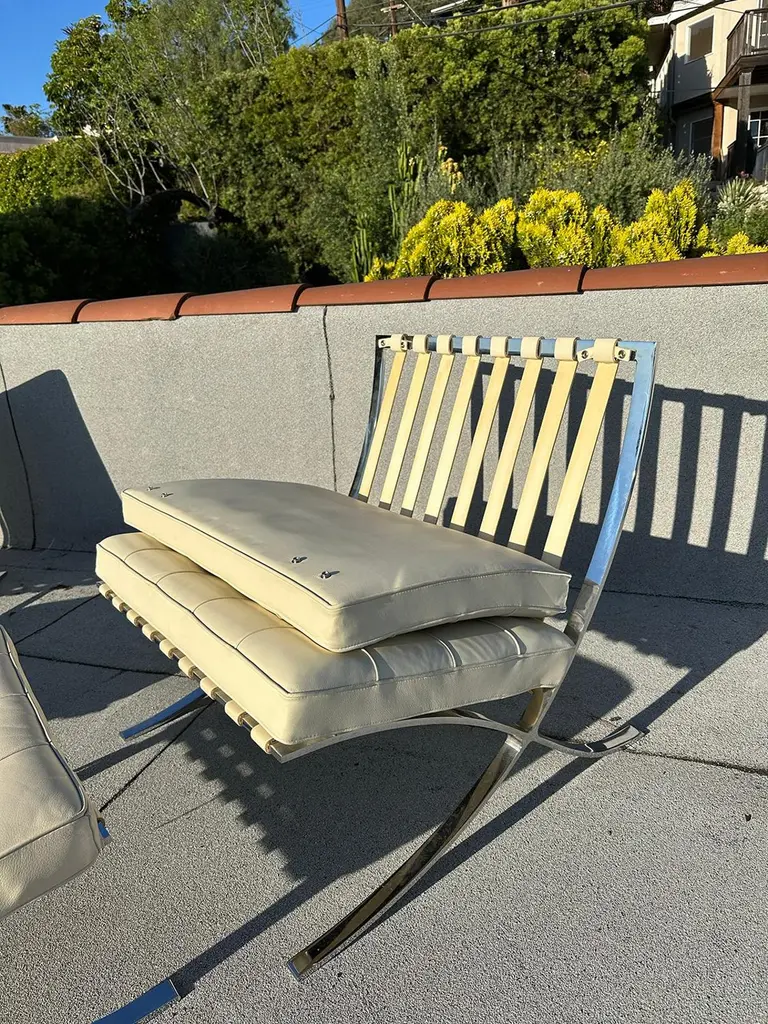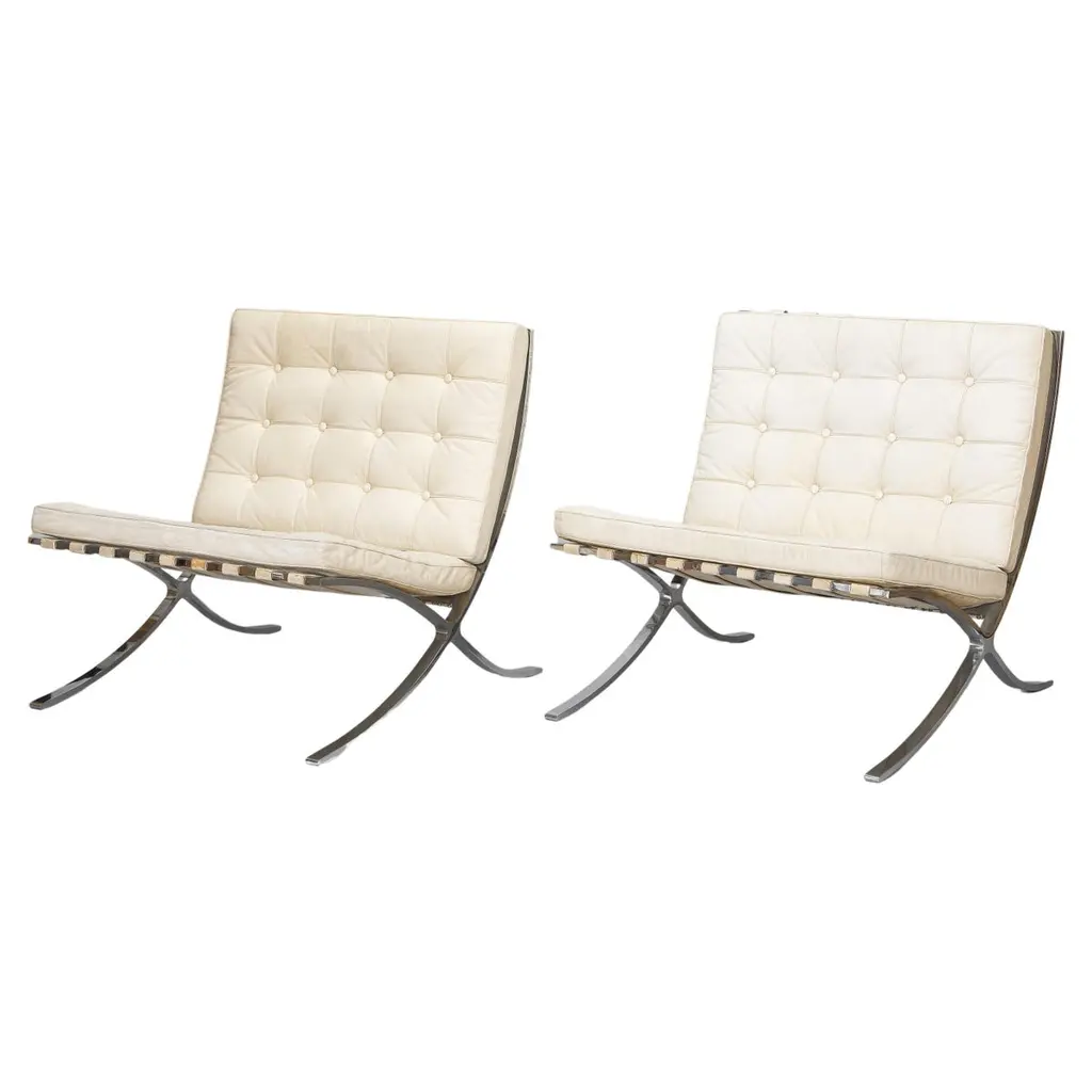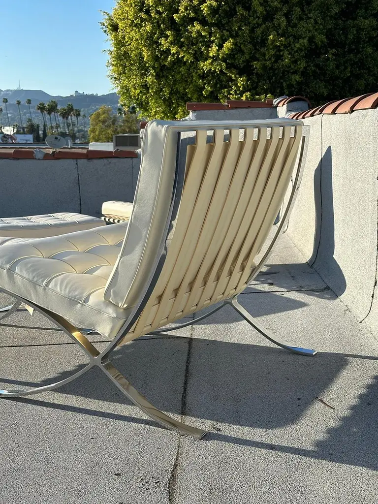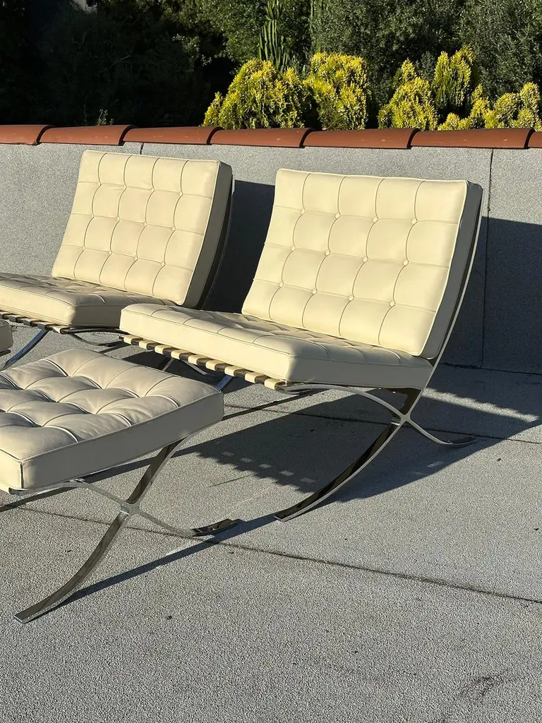 Ludwig Mies van der Rohe's Barcelona Chair, designed in 1929 for the German Pavilion at the International Exposition in Barcelona, is a timeless icon of modernist furniture. The color of these chairs is clean and soft in the off-white tone which is hard to come by. Might entertain selling these individually.Please note: one of the chairs is signed and the other is not. They are an almost identical pair and in lovely condition! Exceptional quality and construction. And very very minimal wear simply consistent with the fact that they are not brand new.Created in collaboration with designer Lilly Reich, the chair embodies Mies’s minimalist ethos—"less is more"—through its sleek lines and elegant materials. Inspired by ancient Roman curule chairs, the Barcelona Chair combines classical form with modern functionality. It features a stainless steel frame with leather cushions, representing a harmonious balance between craftsmanship and industrial design. Though originally intended for Spanish royalty, the chair has become a symbol of sophisticated taste and architectural refinement. Its enduring popularity reflects Mies’s vision of combining form and function in perfect unity, making the Barcelona Chair a masterpiece that continues to influence furniture design to this dayMarked with: Knoll Studio, Mies van der Rohe signature to rear right leg.Knoll tag to underside of seat, Knoll logo fabric on underside of seat.Matching chair and two ottomans each unsigned15 x 23 x 21 1/2 inches each ottoman