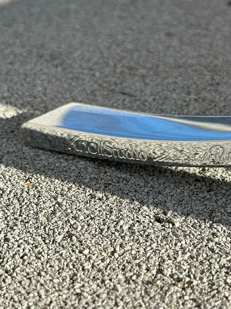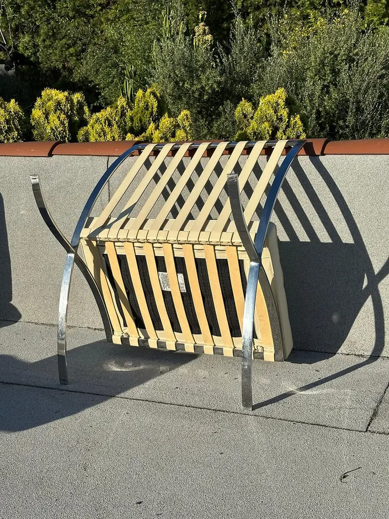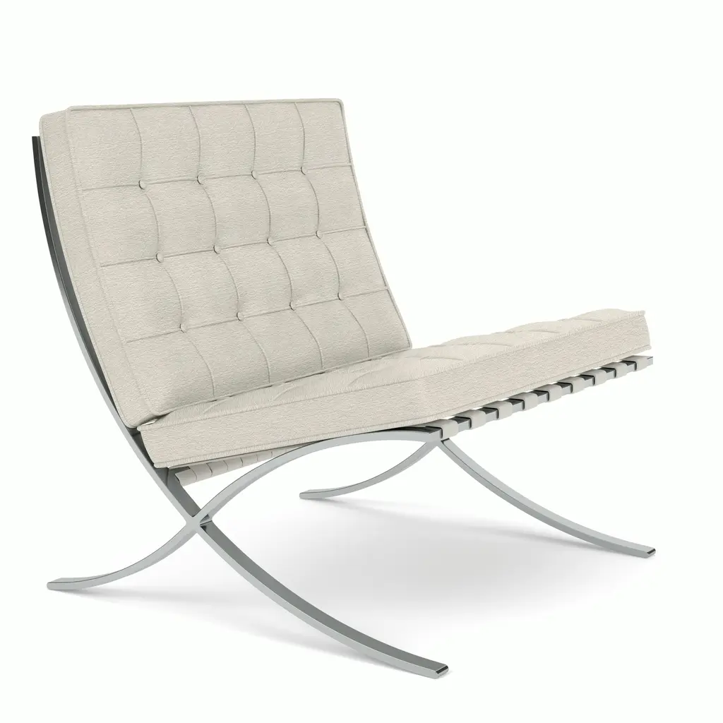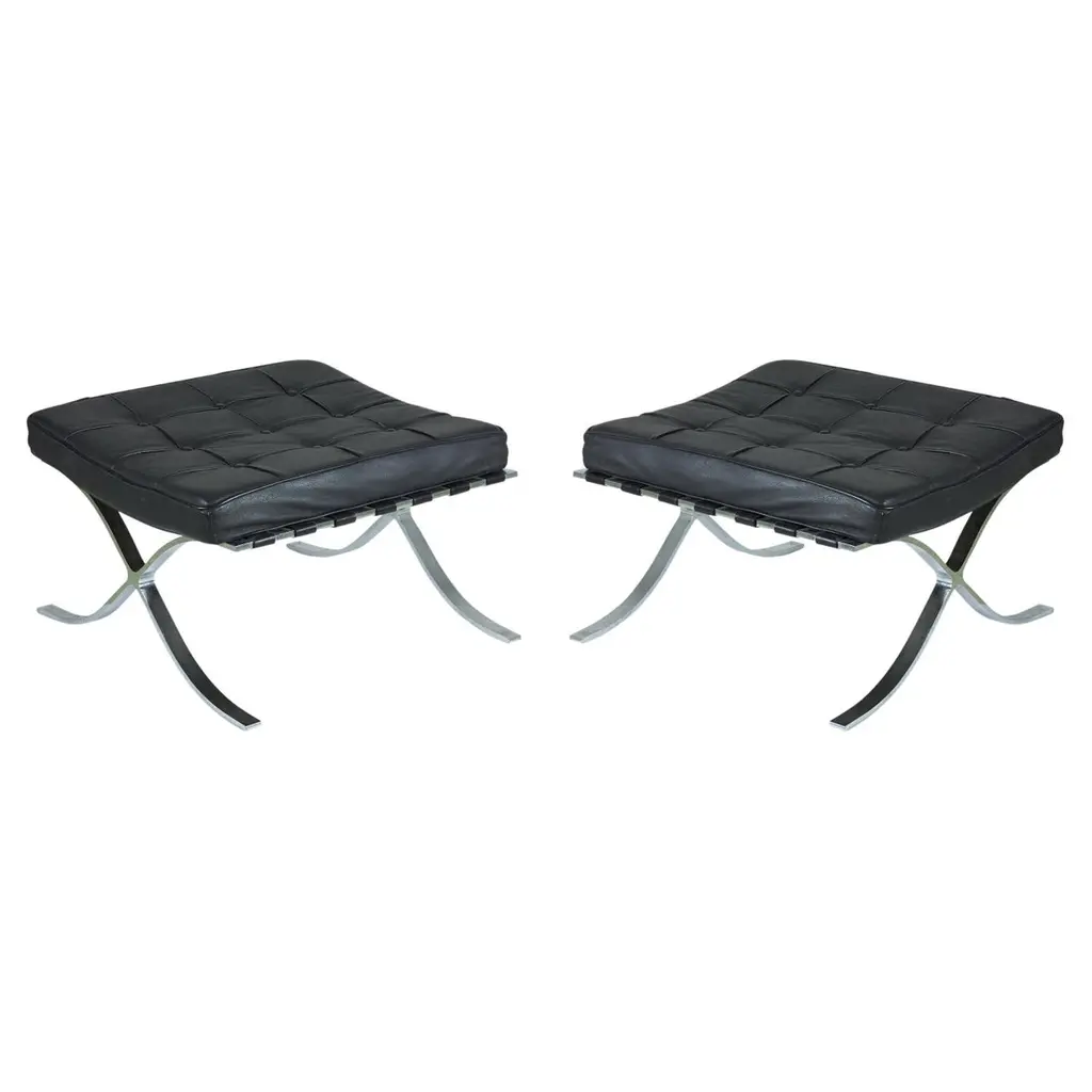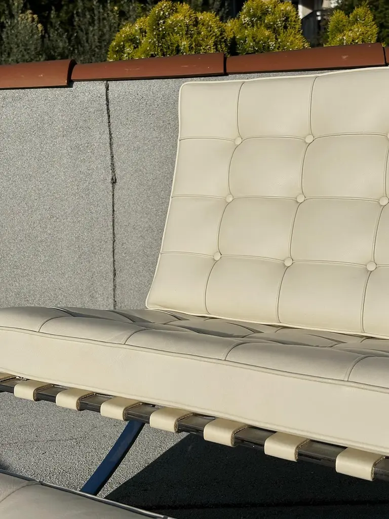 Ludwig Mies van der Rohe's Barcelona Chair, designed in 1929 for the German Pavilion at the International Exposition in Barcelona, is a timeless icon of modernist furniture. The color of these chairs is clean and soft in the off-white tone which is hard to come by. Might entertain selling these individually.Please note: one of the chairs is signed and the other is not. They are an almost identical pair and in lovely condition! Exceptional quality and construction. And very very minimal wear simply consistent with the fact that they are not brand new.Created in collaboration with designer Lilly Reich, the chair embodies Mies’s minimalist ethos—"less is more"—through its sleek lines and elegant materials. Inspired by ancient Roman curule chairs, the Barcelona Chair combines classical form with modern functionality. It features a stainless steel frame with leather cushions, representing a harmonious balance between craftsmanship and industrial design. Though originally intended for Spanish royalty, the chair has become a symbol of sophisticated taste and architectural refinement. Its enduring popularity reflects Mies’s vision of combining form and function in perfect unity, making the Barcelona Chair a masterpiece that continues to influence furniture design to this dayMarked with: Knoll Studio, Mies van der Rohe signature to rear right leg.Knoll tag to underside of seat, Knoll logo fabric on underside of seat.Matching chair and two ottomans each unsigned15 x 23 x 21 1/2 inches each ottoman