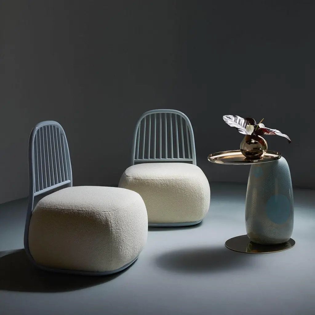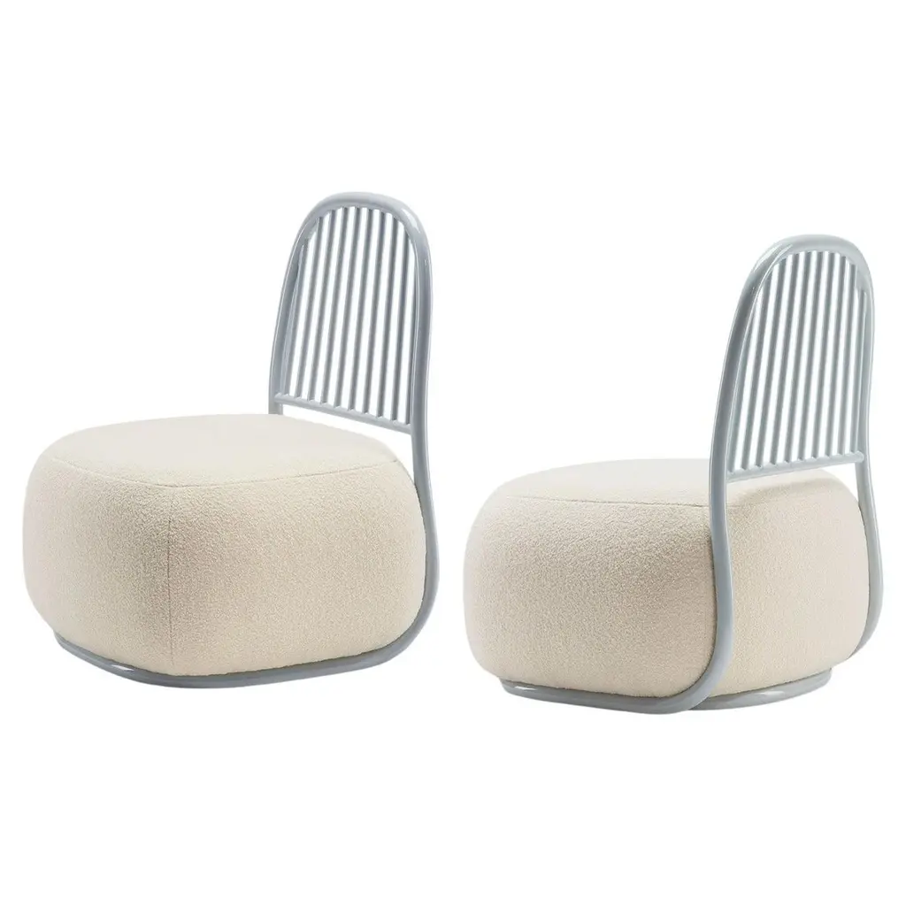 Pair of Contemporary Ivory Upholstered Lounge Chairs - Circe by Ini ArchibongInviting and almost animated, the Circe Lounge Chair has a playful personality. With a deep upholstered seat and harp-like back, Archibong says that it “provides character as well as comfort.”Design: Ini ArchibongFrame upholstered in Dedar Karakorum fabric. Available also in a choice of leathers or fabrics, or in customer’s own material or leather.Lacquered steel frame (available also in any RAL K7 Classic Color).Please contact us directly to find out more about all the color options available.These items were part of exhibition. They are new but might have minor signs of use. Dimensions: 63W x 57D x 82H cmMade by hand, in SloveniaSé:When Sé began in 2007, director and founder Pavlo Schtakleff had a goal – to reclaim the glamour and quality of 20th century furniture and to become a dynamic and innovative presence in the world of contemporary luxury design. Sé’s vision was to invite some of the world’s best design talent to produce collections, akin to an art gallery or a couture house, the ultimate object being to build a catalogue of highly-crafted and beautifully-finished objects, made of the finest, noble materials, by the best craftspeople in Europe. With timeless forms, a curvaceous aesthetic and a spirit of play, Sé pieces are now feted for their characterful, sculptural profiles, and their ability to captivate the senses.Since its beginnings, this European design brand has stayed true to its founding ethos and to date, Sé has created three editions from the French designer Damien Langlois-Meurinne, the Spanish-born Jaime Hayon and Slovenia-based Nika Zupanc, all of which have been highly acclaimed.Under Sé’s stewardship, each designer brings their own sensibility and character, while harnessing a personality, polish and sheer sense of finish that is undeniably Sé. All our pieces are the products of the most exacting collaborations. They are sensual, tactile and cerebral, inviting the gaze and the touch as well as engaging the mind.Headquartered in London and fabricated across Europe to the highest technical standards, Sé aims to make furniture that not only delights, but that will also become tomorrow’s heirlooms.COLLECTION IVCollection IV created with designer Ini Archibong, continues and extends Sé's founding principles of producing furniture that is sumptuous and sculptural, restrained yet expressive, and made to last from the finest noble materials such as bronze and marble. Equally this partnership reflects Sé's passion for working with emerging designers who share its principles and aesthetic tendencies: the intention being to produce characterful heirloom pieces of exceptional finish.Entitled Below the Heavens: a reference to the threshold between earth and heaven; in historical lore, a place of serenity, beauty and celestial perfection and for Archibong a place he feels encompasses the spirit of Sé; a spirit of sensual beauty and sensitive fragility.It was important that Sé and Archibong understood each other before embarking on the design process. “It’s been four years since Collection III but we wanted to wait for the right designer,” said Sé co-founder Pavlo Schtakleff. “To me, Sé occupies a special place in the spectrum of luxury furniture,” added Archibong. “This collaboration feels like a perfect fit and it’s an honour to be invited to create the fourth collection.”Archibong not only shared with Sé a sensibility of understated luxury, but also a fascination with materials and production methods – two vital pillars of Sé’s methodology.To inform Below the Heavens, Schtakleff and Archibong took to the road, visiting Sé’s hand-picked European manufacturers and researching the noble materials that are part of the company’s principles. Educated in luxury design and craftsmanship and with a truly global background, Los Angeles-raised Archibong found many things in common with Schtakleff and Sé. Their journeys are now feeding into the development of the collection, reigniting the essence of Sé and generating new materials and ideas that will help map the future of luxury furniture.Archibong’s recent work has shown a great interest in both form and materials, using glass, marble and brass to express themes drawn from mythology and spirituality and Below the Heavens is the largest undertaking of his career so far. “My aim is to push Sé's fascination for exploring noble and new materials even further, and use them with simple silhouettes and decorative elements to create a memorable collection.”An instinctive choice for Sé, Archibong’s work builds upon Sé’s three previous milestone collections with Damien Langlois-Meurinne, Jaime Hayon and Nika Zupanc respectively. “With Ini, we have found a designer who has an innate grasp of timeless luxury, a passion for investigating materials and production techniques,” says Schtakleff. “Together we will enrich Sé’s offering and make Collection IV an exciting and significant body of work in our 10th anniversary year.”