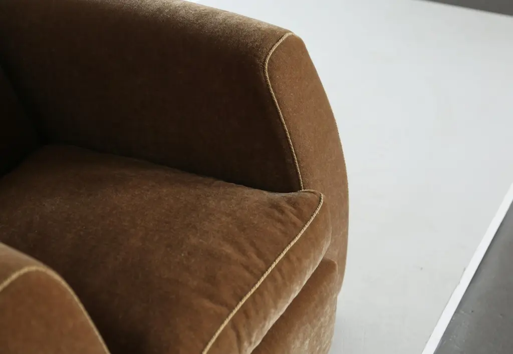 An elegant, luxurious and comfortable pair of modern curved arm club chairs / armchairs. Beech frames, feather cushions and sprung seats. Newly upholstered in a premium golden brown, soft, pure mohair fabric with French Samuel and Sons cord. Handmade in England. Also available in COM. Fast shipping worldwide.