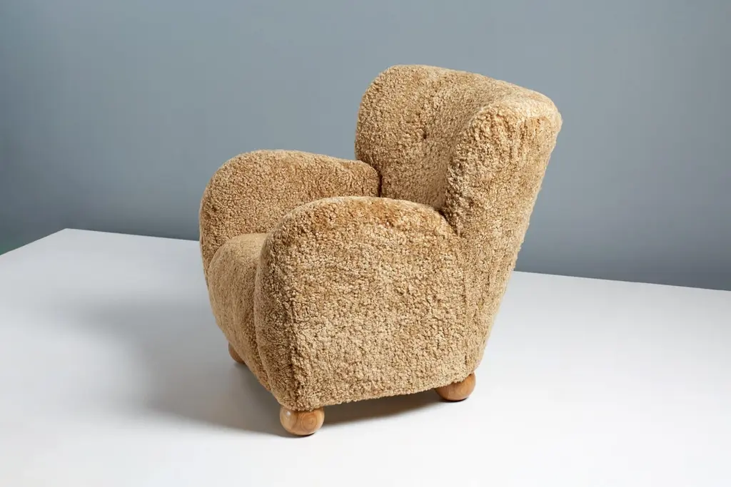 Dagmar design - Karu lounge chairA pair of custom-made lounge chairs developed & produced at our workshops in London using the highest quality materials. These examples are upholstered in ‘Maple’ shearling with oiled oak ball feet. The Karu Chair is available to order in a range of different shearlings and fabrics with a choice of 4 legs finishes. Please contact us for more information.Examples shown are upholstered in Maple sheepskin with oiled oak ball feet. Each chairs measures:height of back 85 cmwidth at arms 84 cmtotal depth 90 cmseat height 43 cm.