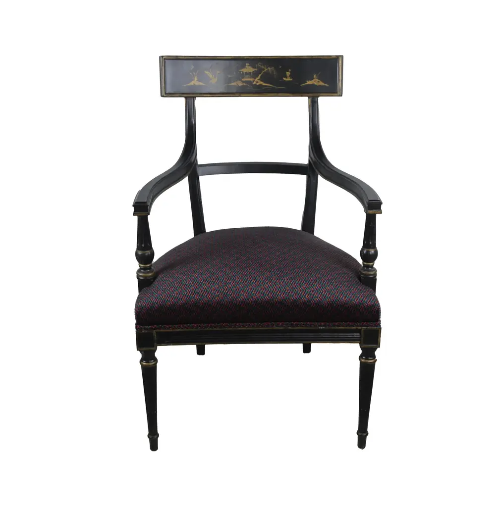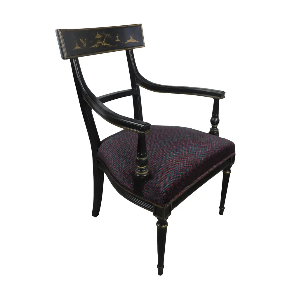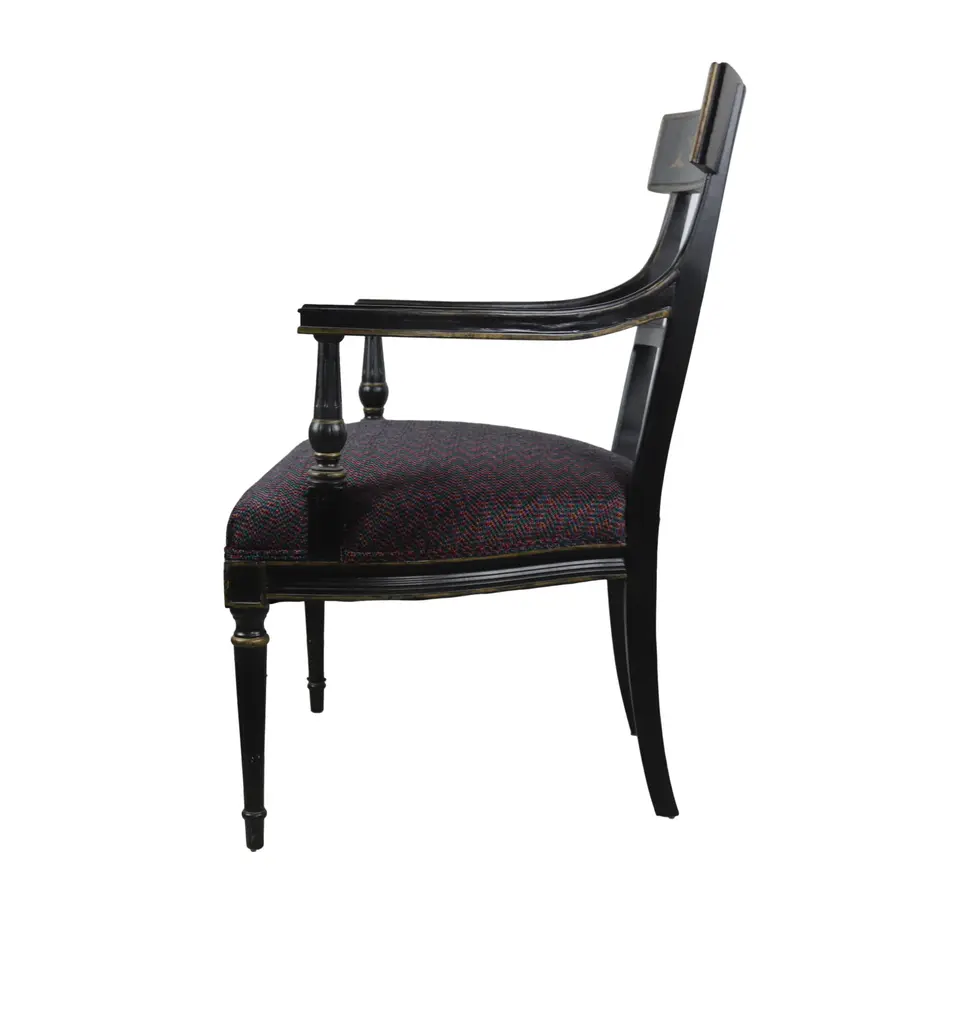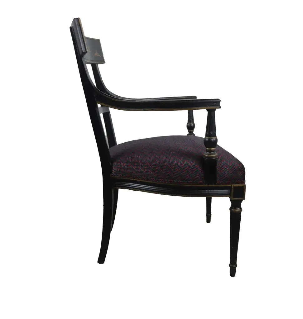 Embrace the enchantment of our Pair of English Regency Armchairs adorned with Chinoiserie, where history meets contemporary beauty. These black armchairs feature luxurious fabric in captivating red and blue tones, accentuated by Chinoiserie details painted in resplendent gold. Crafted with meticulous attention to detail, these armchairs beckon you to journey through time. The Chinoiserie details pay homage to a rich artistic tradition, adding an air of sophistication to the design. The red and blue tones of the fabric create a harmonious backdrop for the intricate gold accents, ensuring a blend of aesthetics and comfort. These armchairs are not just pieces of furniture; they are a bridge between history and the modern living space. Placing them in your home creates an inviting atmosphere where you can relax and appreciate the fusion of art and comfort.