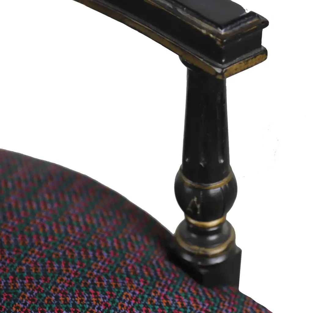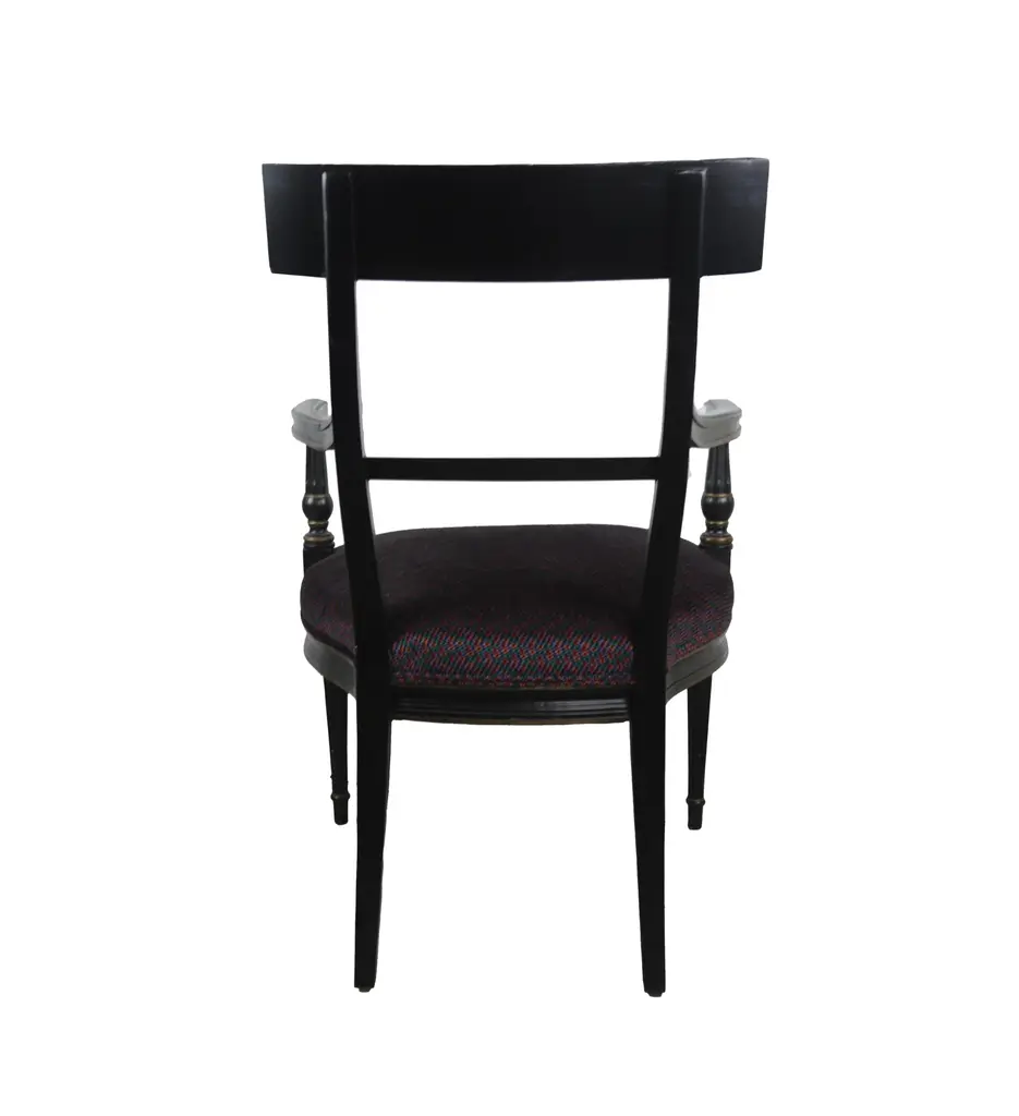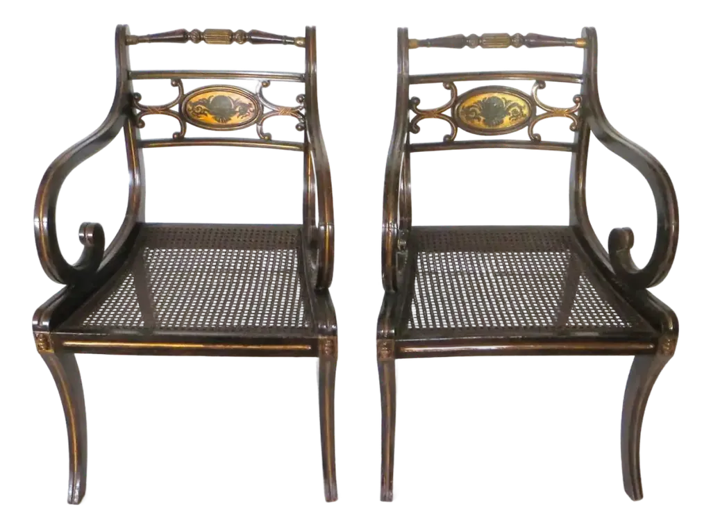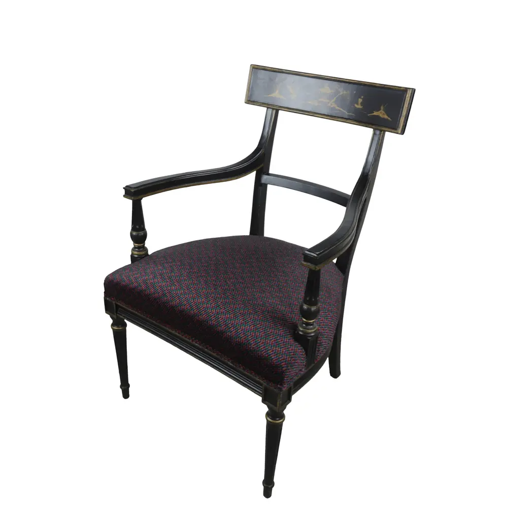 Embrace the enchantment of our Pair of English Regency Armchairs adorned with Chinoiserie, where history meets contemporary beauty. These black armchairs feature luxurious fabric in captivating red and blue tones, accentuated by Chinoiserie details painted in resplendent gold. Crafted with meticulous attention to detail, these armchairs beckon you to journey through time. The Chinoiserie details pay homage to a rich artistic tradition, adding an air of sophistication to the design. The red and blue tones of the fabric create a harmonious backdrop for the intricate gold accents, ensuring a blend of aesthetics and comfort. These armchairs are not just pieces of furniture; they are a bridge between history and the modern living space. Placing them in your home creates an inviting atmosphere where you can relax and appreciate the fusion of art and comfort.