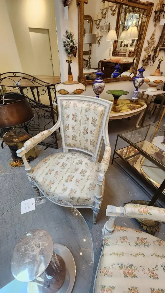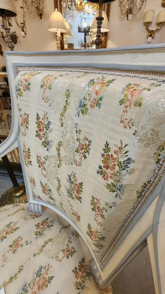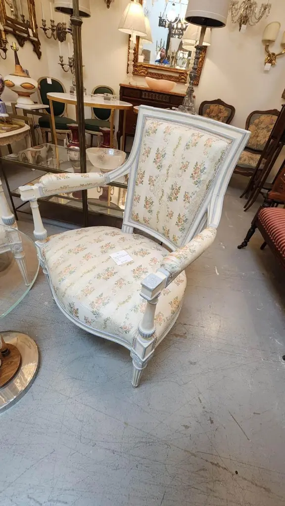 This listing features a pair of Rococo style floral armchairs. These chairs come in a beautiful white and blue color with dainty floral fabric on the cushions and back cushions. Would make a wonderful addition to any study or living room.