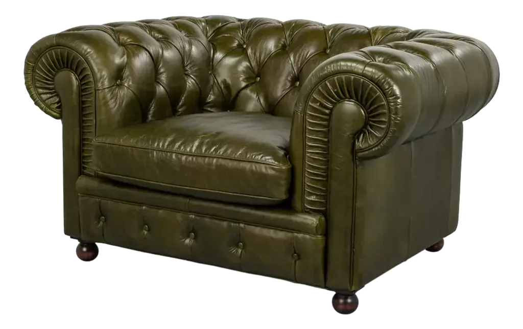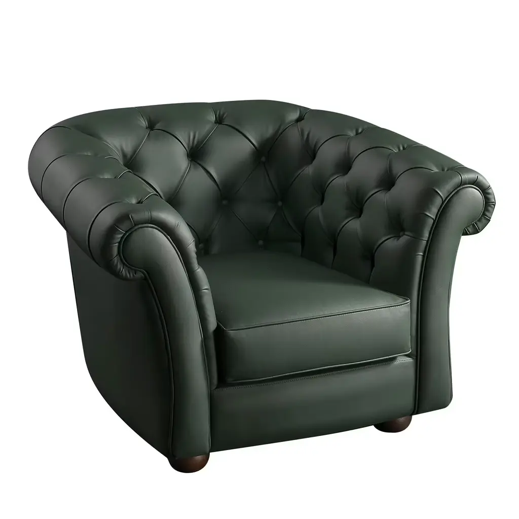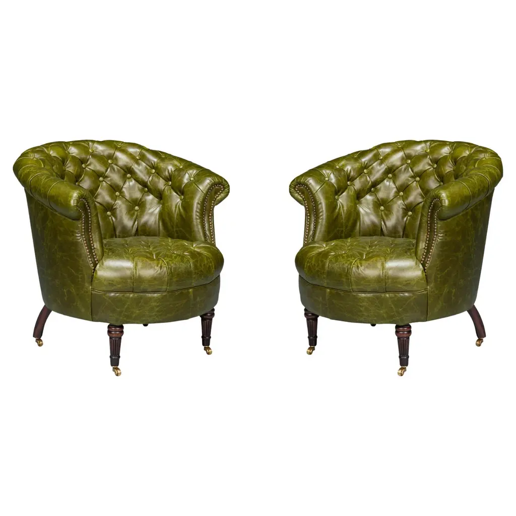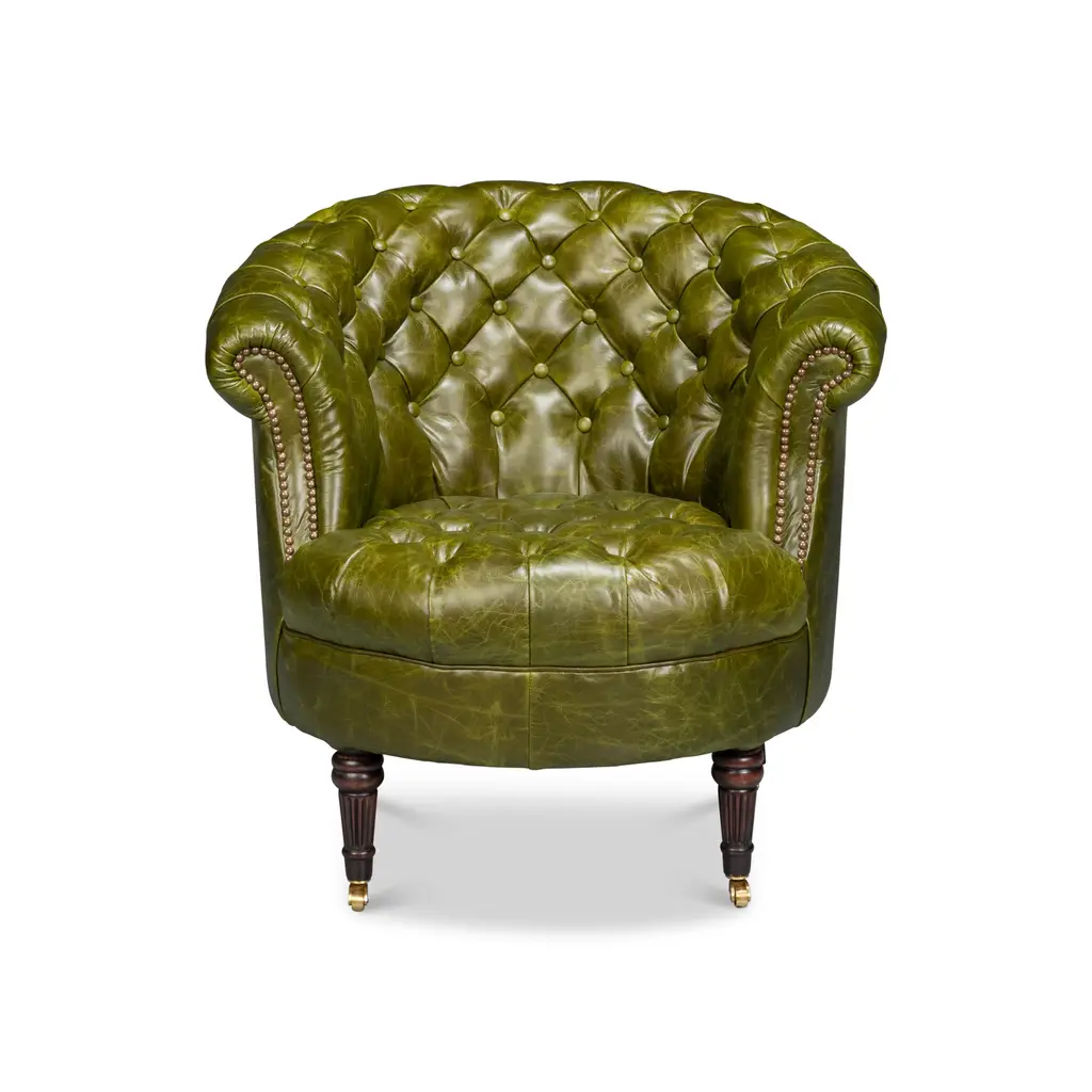 Upholstered in rich, top-grain British Green leather, its elegantly curved barrel back is adorned with deep button tufting, exuding timeless sophistication. Set on turned, tapered, and fluted legs, this chair is as functional as it is beautiful. Brass caster feet add both elegance and effortless mobility. Ideal for living rooms, studies, or reading nooks, this chair combines vintage charm with modern comfort. Elevate your space with a sophisticated piece that seamlessly blends style and tradition. Dimensions: 33" W x 33" D x 31" H Seat - 16" Arm - 25"