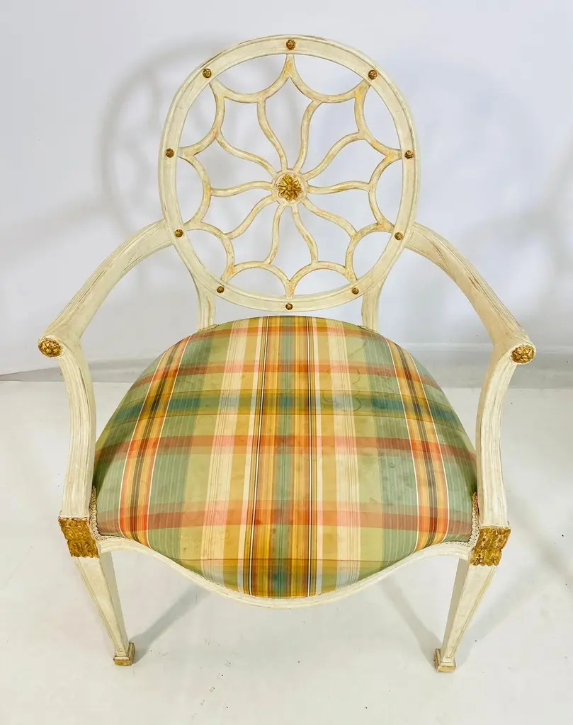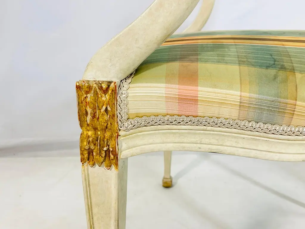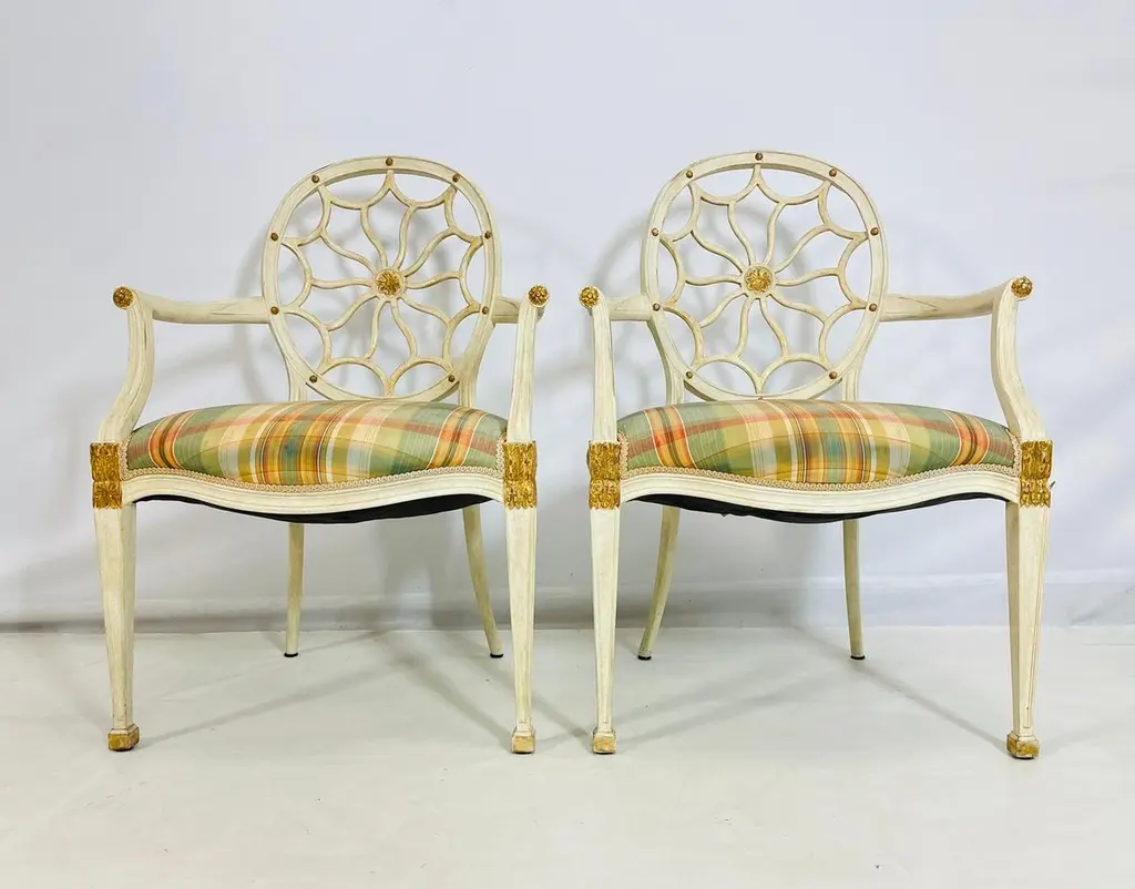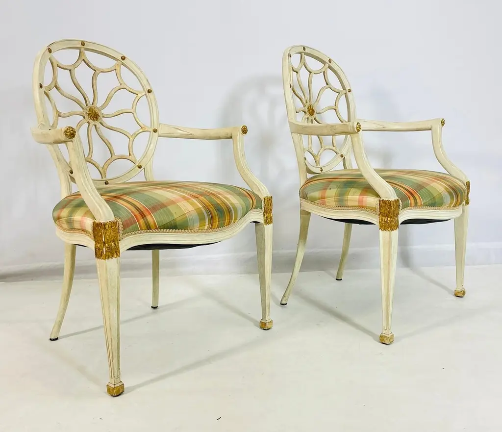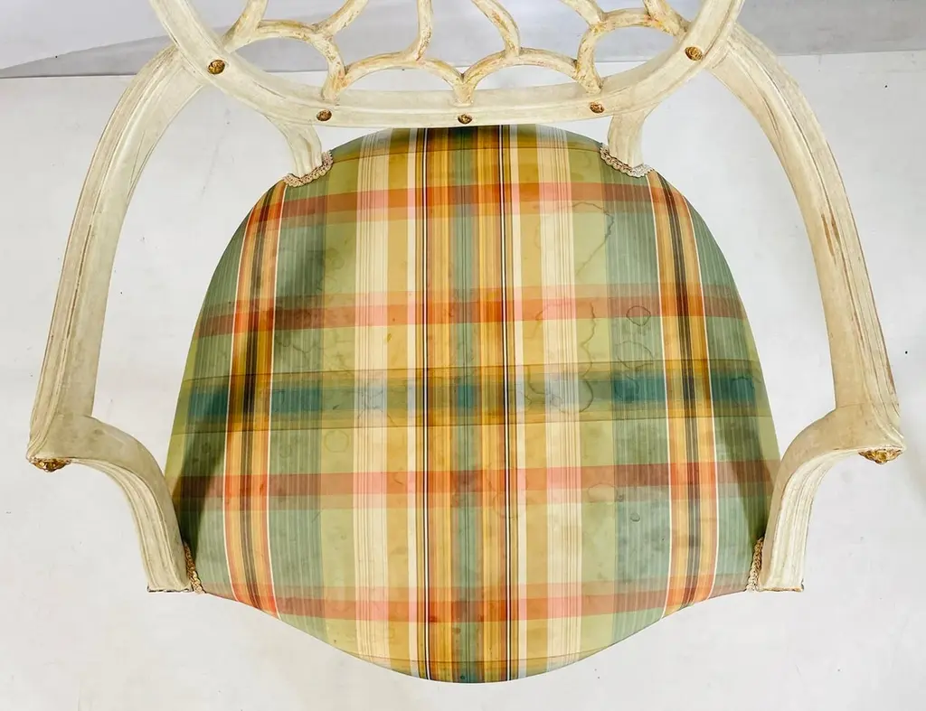A distinguished pair of Hollywood Regency carved armchairs by Dennis & Leen, handcrafted in Los Angeles, California. These elegant chairs feature carved balloon backs with a radiating sunburst floral motif and round medallion accents, highlighted in giltwood for added sophistication.The frames are finished in a warm antique ivory patina, giving the pieces a timeworn yet refined appeal. The plaid upholstered seats bring a vibrant mix of green, ochre, and sienna tones—perfect for blending traditional interiors with vintage designer seating. The fluted legs and tapered lines reflect Neoclassical Revival influences, while the gilt floral carvings at the knees and arms add signature Hollywood Regency flair.Made by Dennis & Leen, a company known for heirloom-quality craftsmanship and French and Italian neoclassical reproductions, these chairs embody timeless style and superior construction.Condition: Good vintage condition with patina to finish and staining to upholstery (visible in photos). Structurally sound.Measurements:Height: 38.25 inWidth: 25 inDepth: 26.50 inArm Height: 27 inSeat Height: 20.50 inDesigner/Manufacturer: Dennis & LeenOrigin: Los Angeles, California, USAPeriod: Late 20th CenturyStyle: Hollywood Regency, Neoclassical RevivalMaterials: Hand-carved wood, gilt accents, plaid upholstery