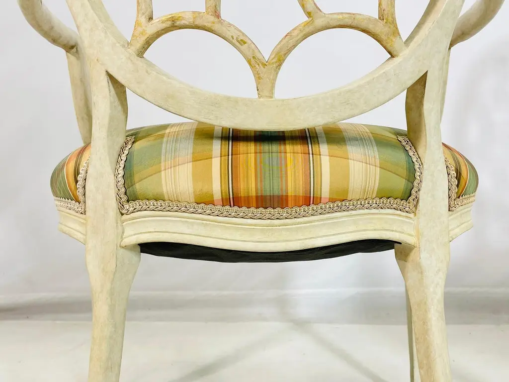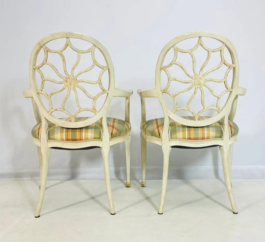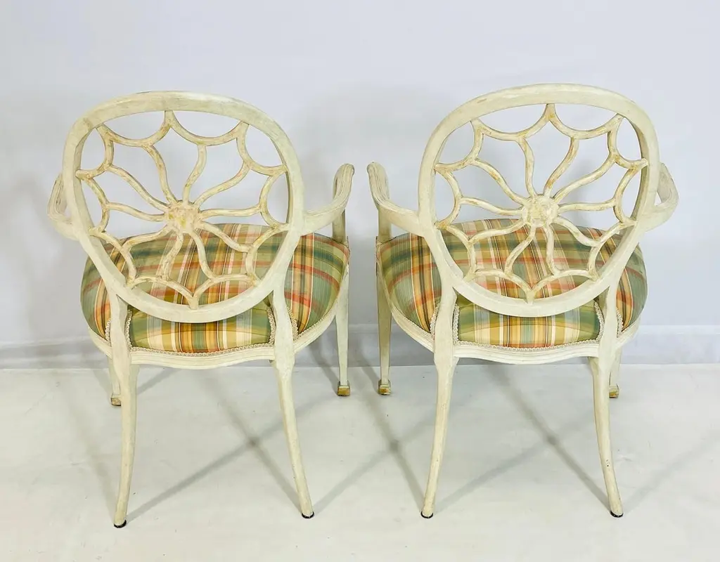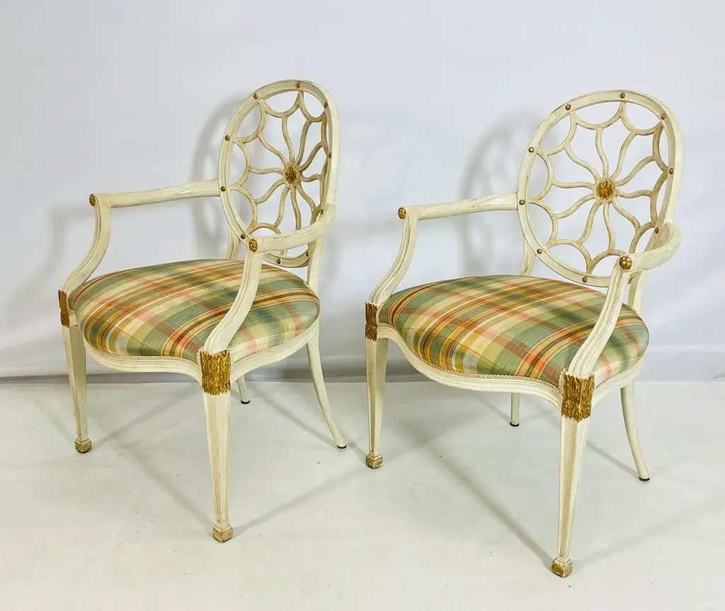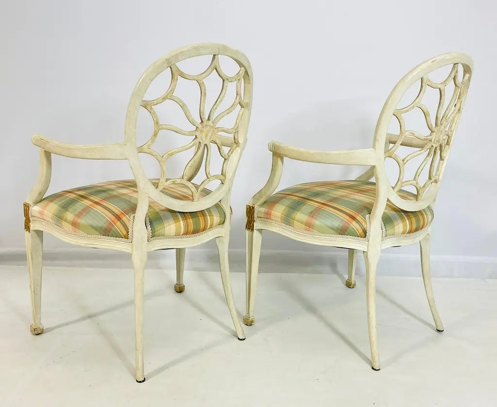 A distinguished pair of Hollywood Regency carved armchairs by Dennis & Leen, handcrafted in Los Angeles, California. These elegant chairs feature carved balloon backs with a radiating sunburst floral motif and round medallion accents, highlighted in giltwood for added sophistication.The frames are finished in a warm antique ivory patina, giving the pieces a timeworn yet refined appeal. The plaid upholstered seats bring a vibrant mix of green, ochre, and sienna tones—perfect for blending traditional interiors with vintage designer seating. The fluted legs and tapered lines reflect Neoclassical Revival influences, while the gilt floral carvings at the knees and arms add signature Hollywood Regency flair.Made by Dennis & Leen, a company known for heirloom-quality craftsmanship and French and Italian neoclassical reproductions, these chairs embody timeless style and superior construction.Condition: Good vintage condition with patina to finish and staining to upholstery (visible in photos). Structurally sound.Measurements:Height: 38.25 inWidth: 25 inDepth: 26.50 inArm Height: 27 inSeat Height: 20.50 inDesigner/Manufacturer: Dennis & LeenOrigin: Los Angeles, California, USAPeriod: Late 20th CenturyStyle: Hollywood Regency, Neoclassical RevivalMaterials: Hand-carved wood, gilt accents, plaid upholstery