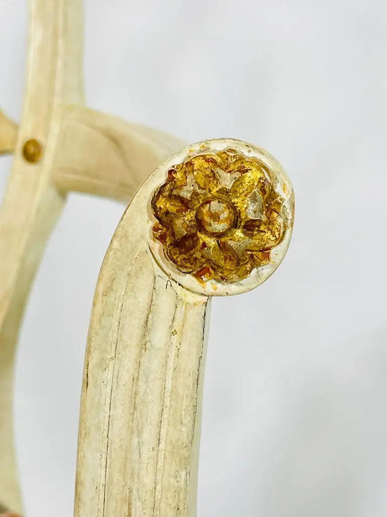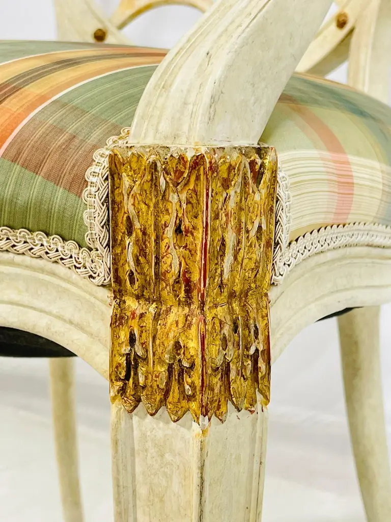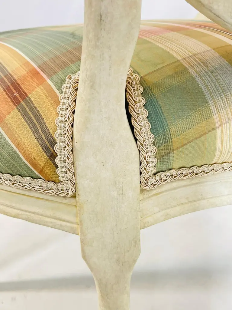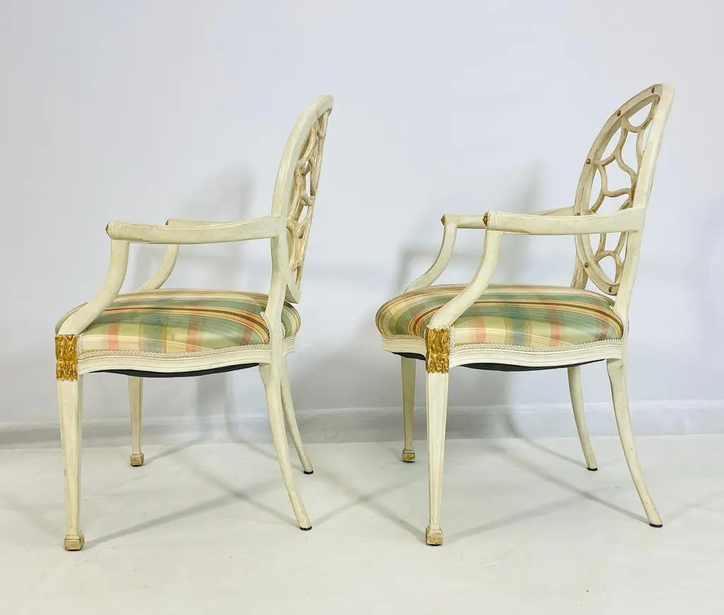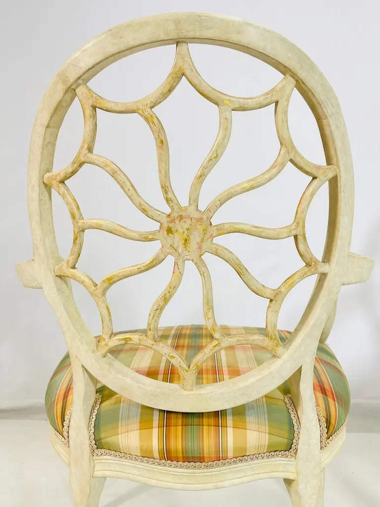A distinguished pair of Hollywood Regency carved armchairs by Dennis & Leen, handcrafted in Los Angeles, California. These elegant chairs feature carved balloon backs with a radiating sunburst floral motif and round medallion accents, highlighted in giltwood for added sophistication.The frames are finished in a warm antique ivory patina, giving the pieces a timeworn yet refined appeal. The plaid upholstered seats bring a vibrant mix of green, ochre, and sienna tones—perfect for blending traditional interiors with vintage designer seating. The fluted legs and tapered lines reflect Neoclassical Revival influences, while the gilt floral carvings at the knees and arms add signature Hollywood Regency flair.Made by Dennis & Leen, a company known for heirloom-quality craftsmanship and French and Italian neoclassical reproductions, these chairs embody timeless style and superior construction.Condition: Good vintage condition with patina to finish and staining to upholstery (visible in photos). Structurally sound.Measurements:Height: 38.25 inWidth: 25 inDepth: 26.50 inArm Height: 27 inSeat Height: 20.50 inDesigner/Manufacturer: Dennis & LeenOrigin: Los Angeles, California, USAPeriod: Late 20th CenturyStyle: Hollywood Regency, Neoclassical RevivalMaterials: Hand-carved wood, gilt accents, plaid upholstery