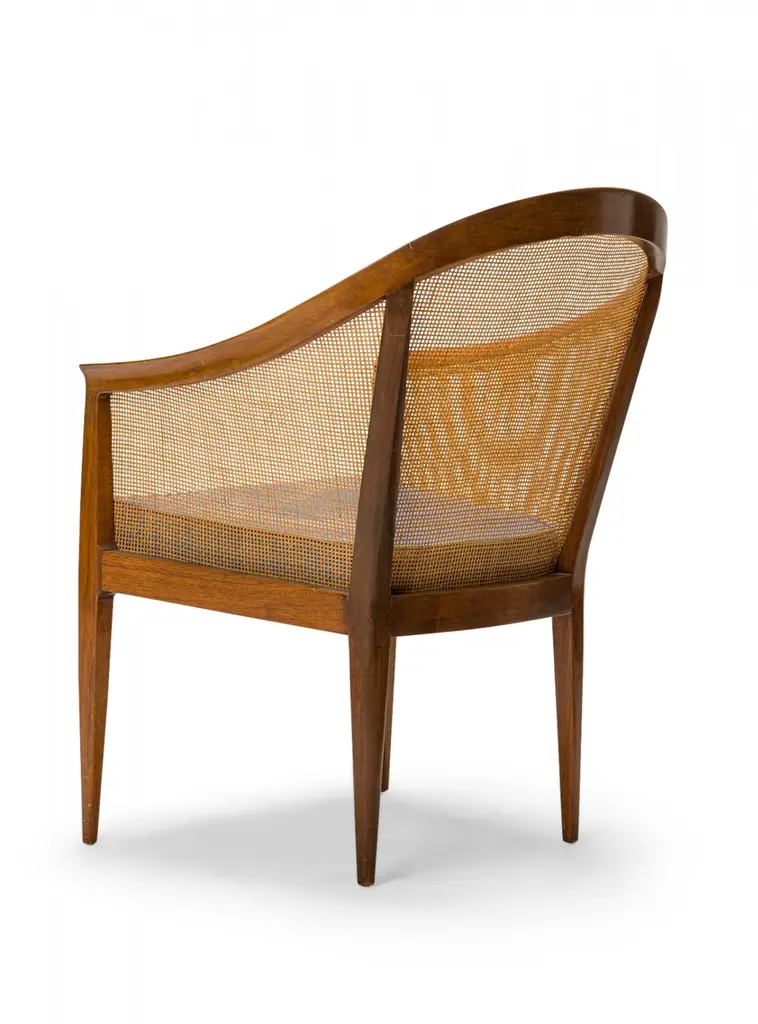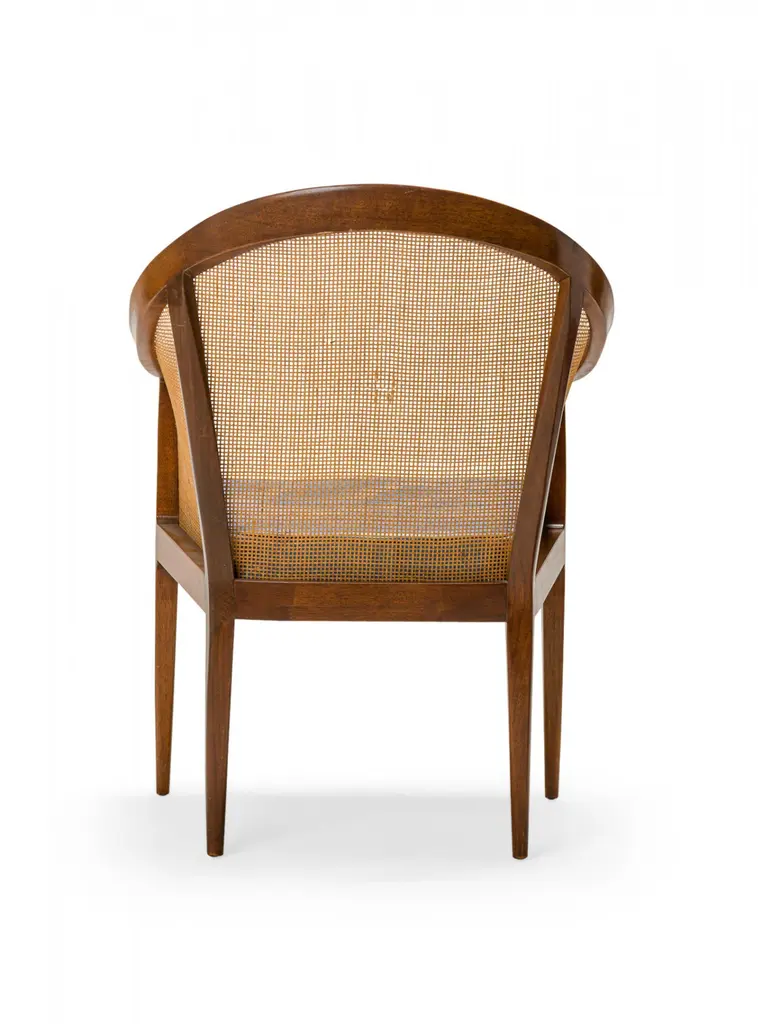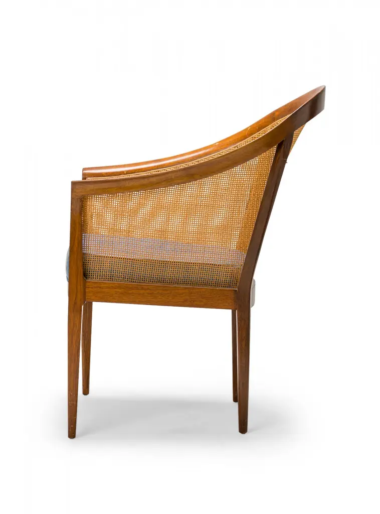 Pair of American Mid-Century pull up chairs with rounded back walnut frames with caned backs and sides and blue leather seat cushions, resting on four tapered legs. (KIPP STEWART FOR DIRECTIONAL)(PRICED AS Pair)Peeling and fraying of cane in several sections.
