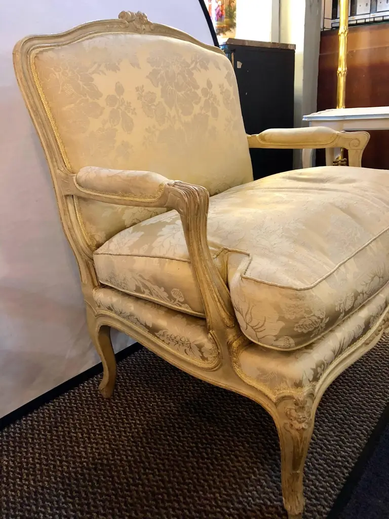 A pair of Louis XV style lounge chairs attributed to Maison Jansen in their original fabric. A finely carved pair of chairs having a distressed finish with open side arms. Each in a clean floral designed fabric with down cushions.