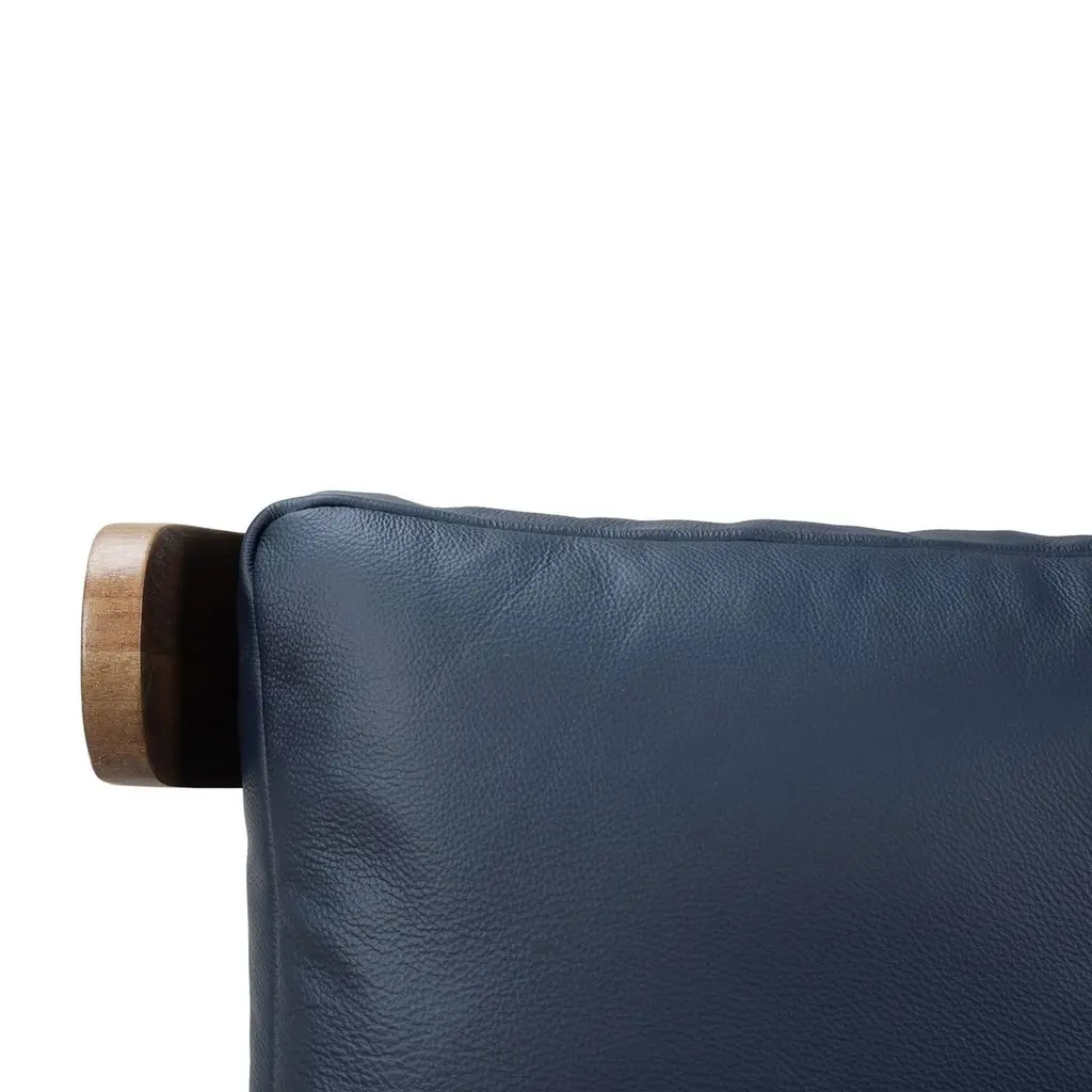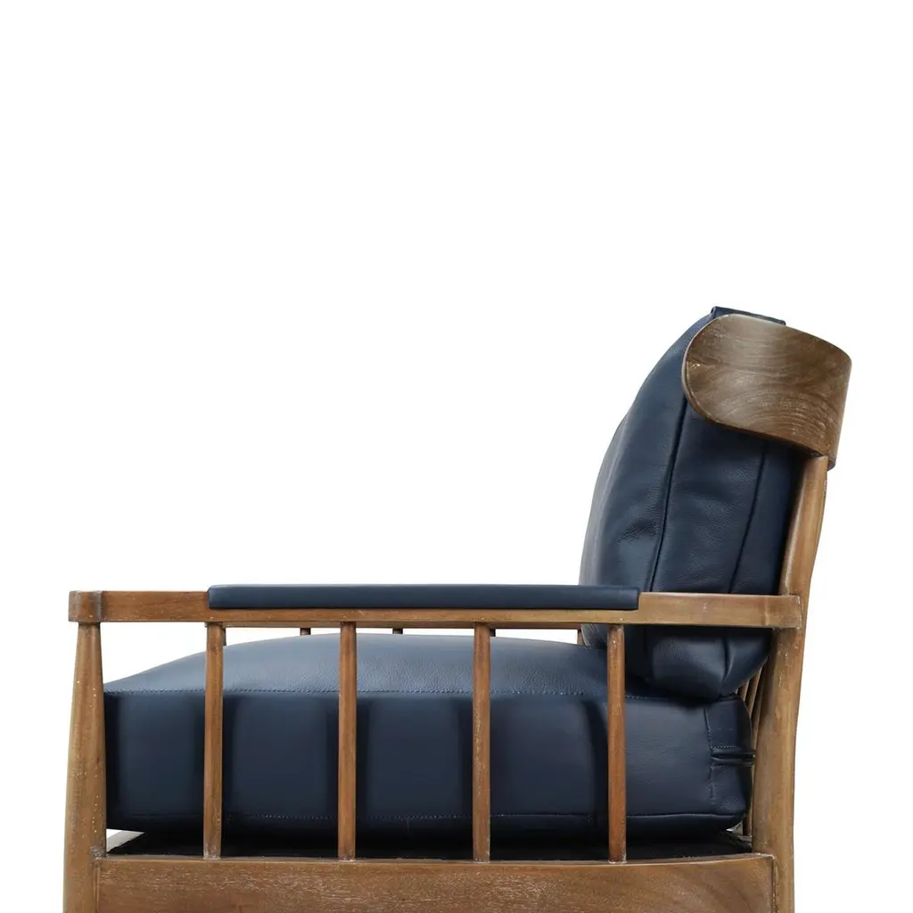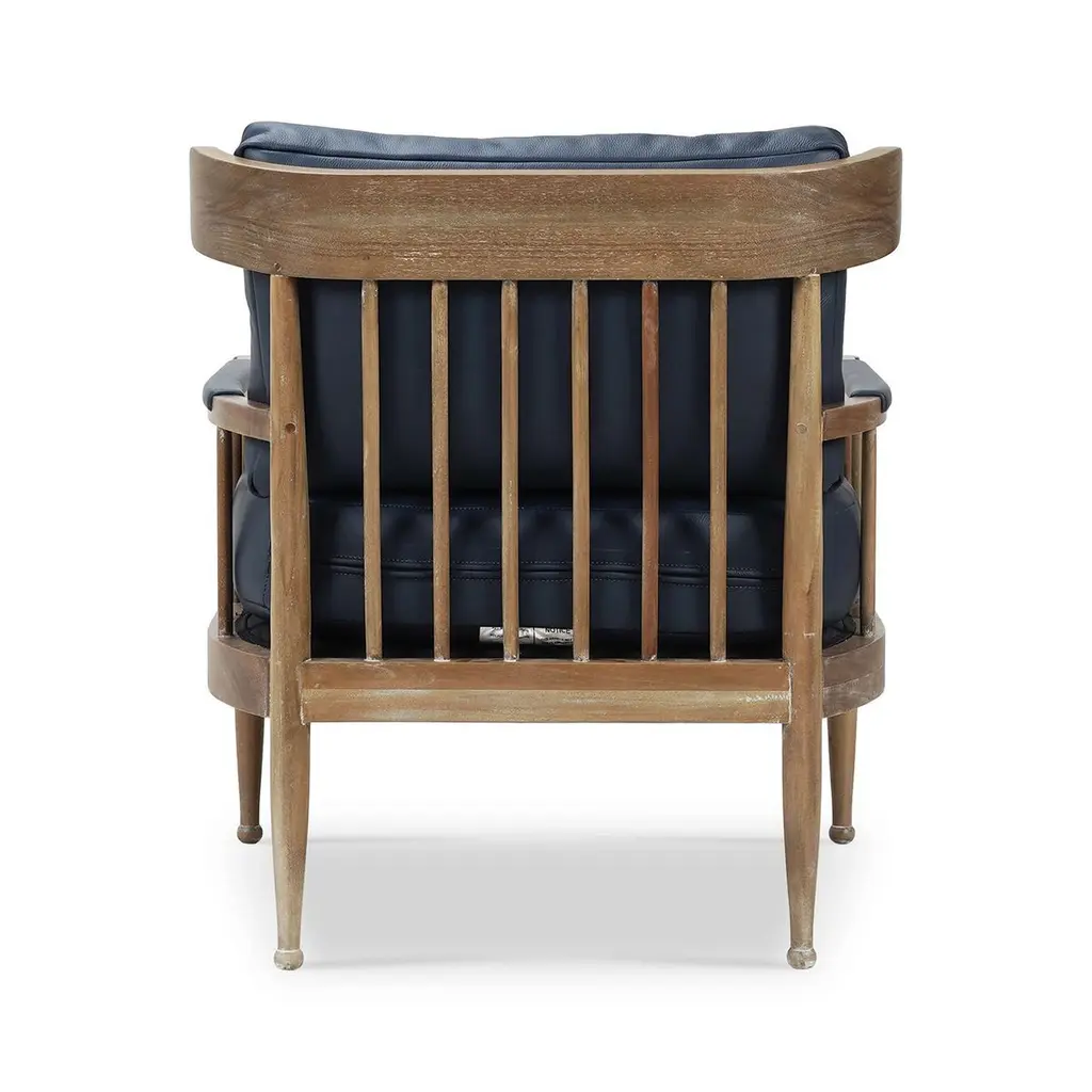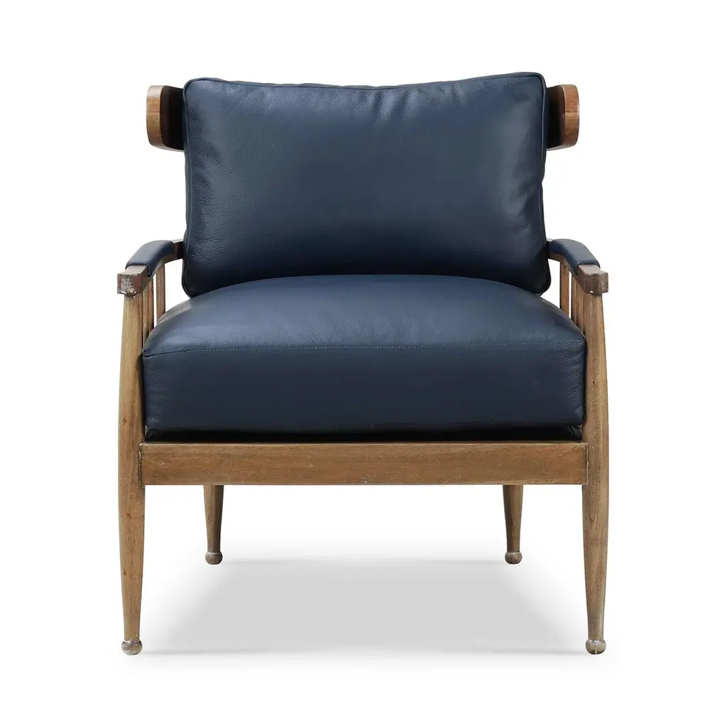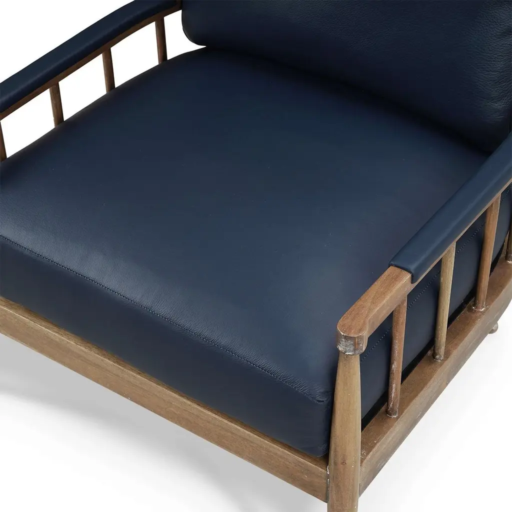 A masterful blend of contemporary design and luxurious comfort. This exquisite armchair features a solid wood frame finished in a warm straw wash, showcasing its natural beauty and durability. The sleek spindle backrest and tapered legs add a touch of mid-century modern elegance, making it a standout piece in your home decor.The plush cushions are upholstered in premium Blue de Malte leather, offering a rich, sophisticated look and superior comfort. The ergonomic design ensures optimal support, making it an ideal addition to living rooms, bedrooms, or stylish office spaces.Dimensions: 28" W x 32" D x 31" HSeat - 19" HArm - 22" HCustom finish options are also available. Contact us to learn more.Lead time is 20 - 24 weeks.