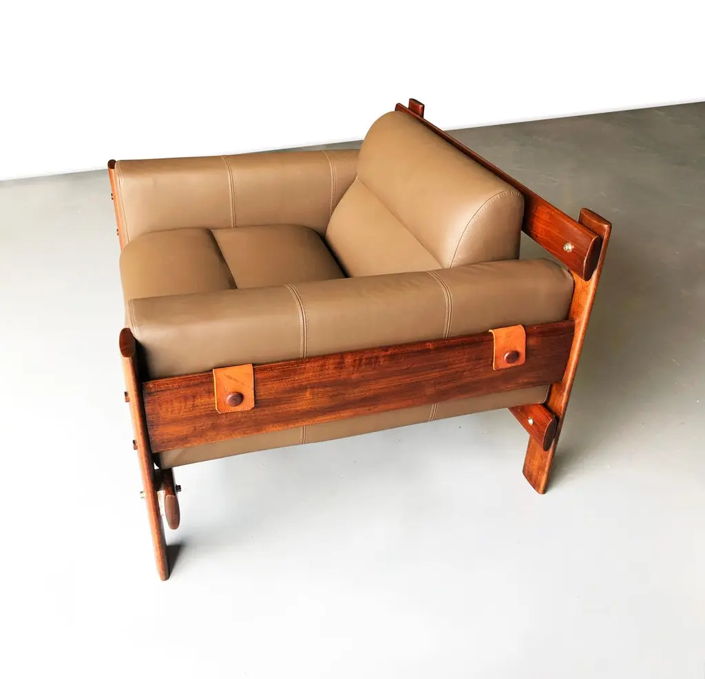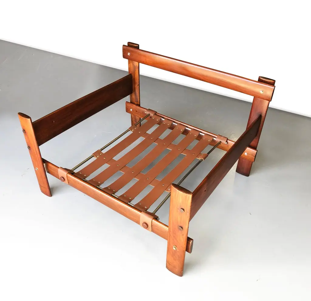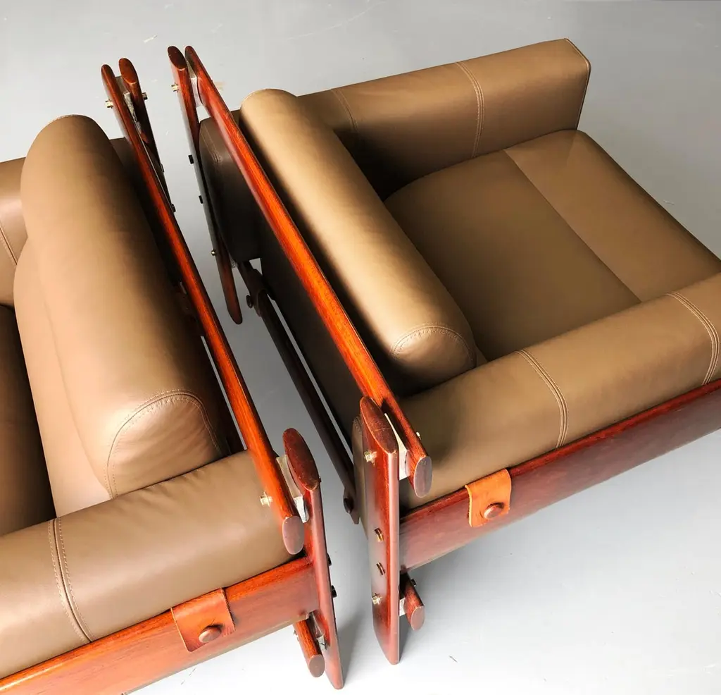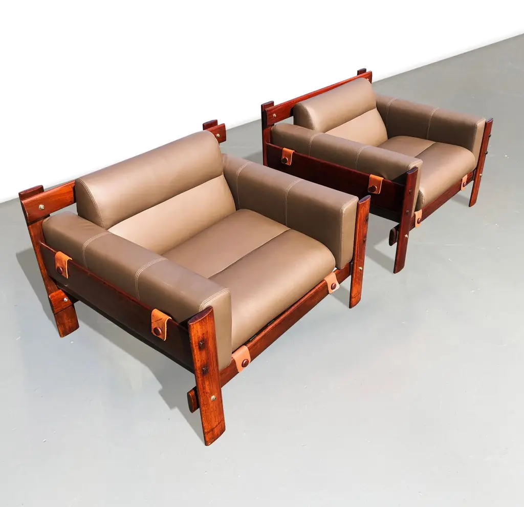 A rare model of armchair by Percival Lafer, our stunning pair of MP-51 have their structure entirely made out of solid Jatobá wood - Brazilian cherry. The seat base has been redone with new natural leather straps. These straps are part of the overall aesthetics of the piece. The wood on both chairs has been sanded and matt varnished, revealing the beautiful colour and grain of Jatobá. The wood surfaces look stunning. The chairs have a new brown natural leather upholstery, done in Brazil. These MP51 are very comfortable, and ours are in excellent condition. We have two chairs available. A common trait amongst Lafer pieces is that they are very comfortable and also unique: they have a hard-achieved simplicity about them. Lafer studied architecture at São Paulo’s Universidade Mackenzie. After he graduated, his father passed away suddenly, leaving a furniture business that Lafer took over with his brothers.Lafer then made the jump from architecture to furniture design in 1961, putting a focus on thoughtfully designed pieces available at affordable prices. In the same year he introduced the amazing MP-1 chair, a plush piece of furniture made with iron and wood- and since then has had a prolific career.The silhouettes of his lounge chairs, armchairs and other seating were were a step away from the streamlined American and European mid-century modernism being designed at the time, taking on casual, puffed forms thanks to the use of polyurethane layers as padding. He combined such contemporary industrial materials with local natural ones, namely Brazilian hardwoods, which delighted customers around the world as Lafer became one of the country’s leading exporters of furniture.Lafer has continued to design furniture throughout his career, branching into sofas, tables and lighting. He was at the forefront of mechanical furniture movements, debuting the MP-7 sofa, which could turn into a twin bed, in 1965, the first such piece on the market. One of his most intriguing projects was the MP Lafer, a two-seat fiberglass roadster designed to emulate British sports cars. Some 4,300 units were produced over its 16-year manufacturing run in the ’70s and ’80s, with several ending up in the collections of major car museums.