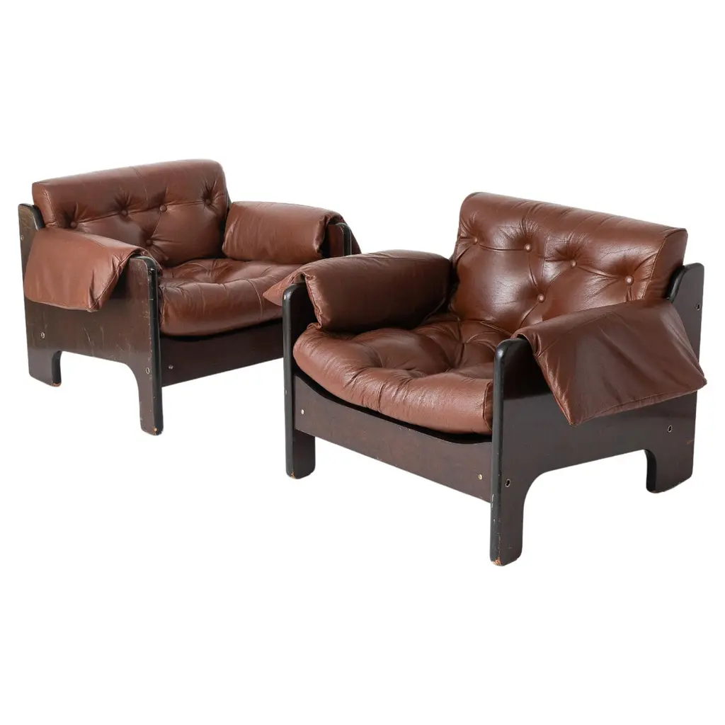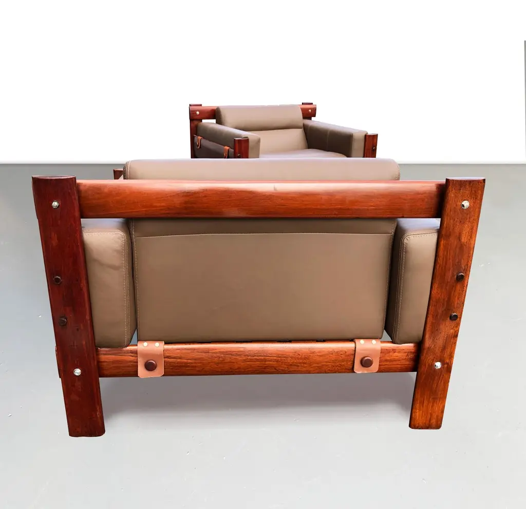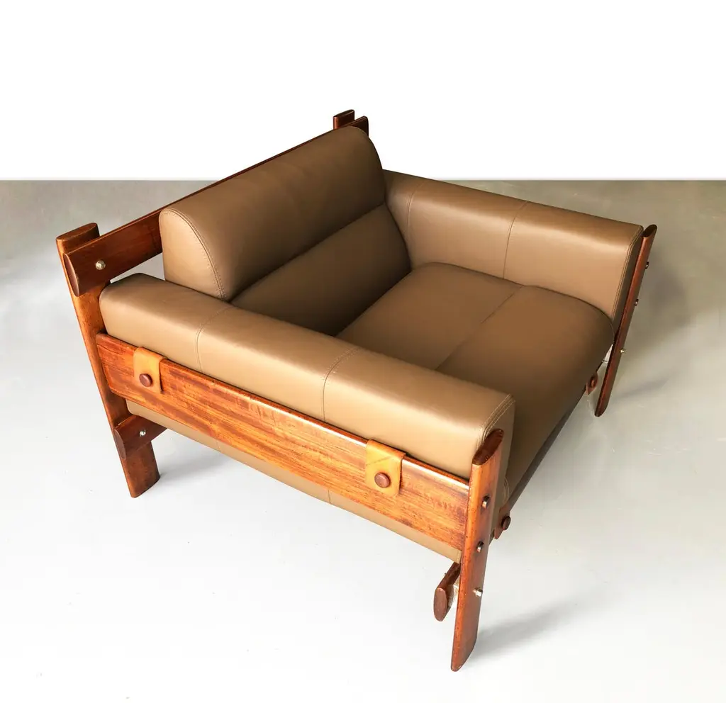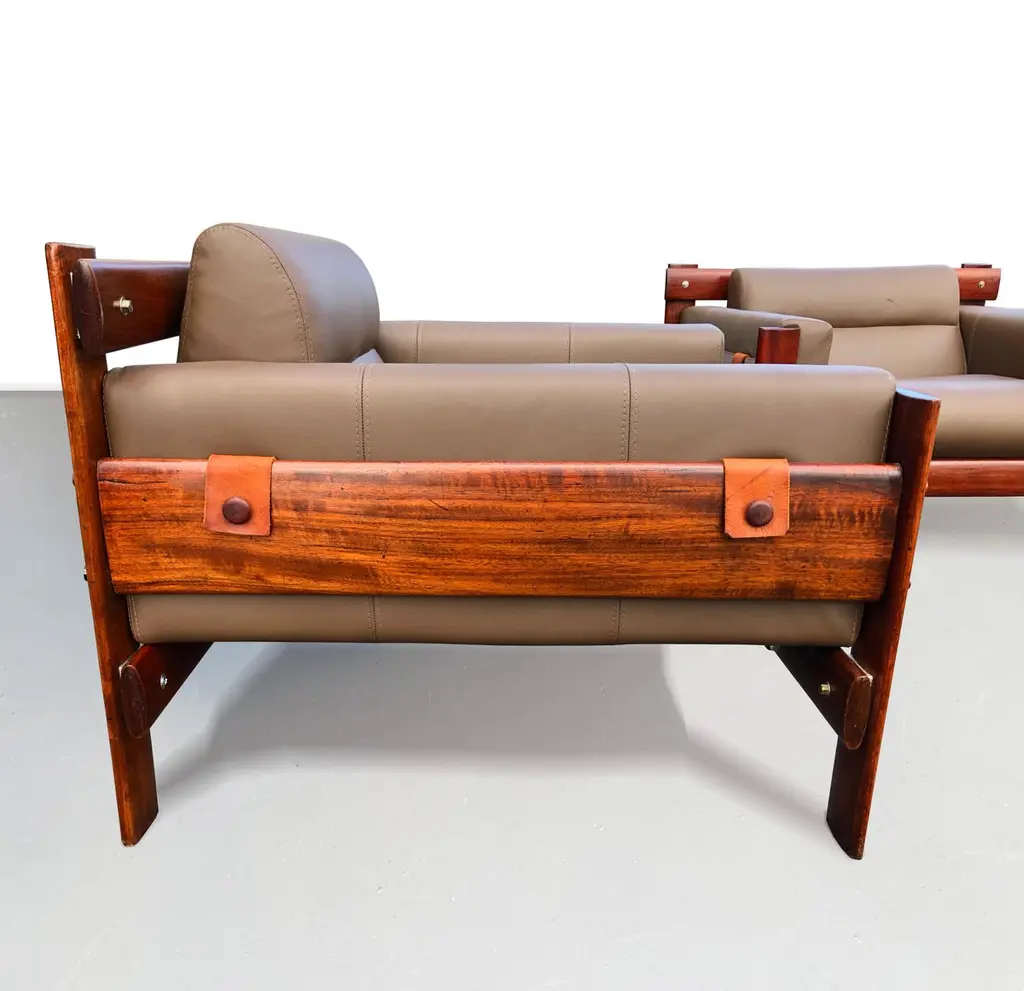 A rare model of armchair by Percival Lafer, our stunning pair of MP-51 have their structure entirely made out of solid Jatobá wood - Brazilian cherry. The seat base has been redone with new natural leather straps. These straps are part of the overall aesthetics of the piece. The wood on both chairs has been sanded and matt varnished, revealing the beautiful colour and grain of Jatobá. The wood surfaces look stunning. The chairs have a new brown natural leather upholstery, done in Brazil. These MP51 are very comfortable, and ours are in excellent condition. We have two chairs available. A common trait amongst Lafer pieces is that they are very comfortable and also unique: they have a hard-achieved simplicity about them. Lafer studied architecture at São Paulo’s Universidade Mackenzie. After he graduated, his father passed away suddenly, leaving a furniture business that Lafer took over with his brothers.Lafer then made the jump from architecture to furniture design in 1961, putting a focus on thoughtfully designed pieces available at affordable prices. In the same year he introduced the amazing MP-1 chair, a plush piece of furniture made with iron and wood- and since then has had a prolific career.The silhouettes of his lounge chairs, armchairs and other seating were were a step away from the streamlined American and European mid-century modernism being designed at the time, taking on casual, puffed forms thanks to the use of polyurethane layers as padding. He combined such contemporary industrial materials with local natural ones, namely Brazilian hardwoods, which delighted customers around the world as Lafer became one of the country’s leading exporters of furniture.Lafer has continued to design furniture throughout his career, branching into sofas, tables and lighting. He was at the forefront of mechanical furniture movements, debuting the MP-7 sofa, which could turn into a twin bed, in 1965, the first such piece on the market. One of his most intriguing projects was the MP Lafer, a two-seat fiberglass roadster designed to emulate British sports cars. Some 4,300 units were produced over its 16-year manufacturing run in the ’70s and ’80s, with several ending up in the collections of major car museums.