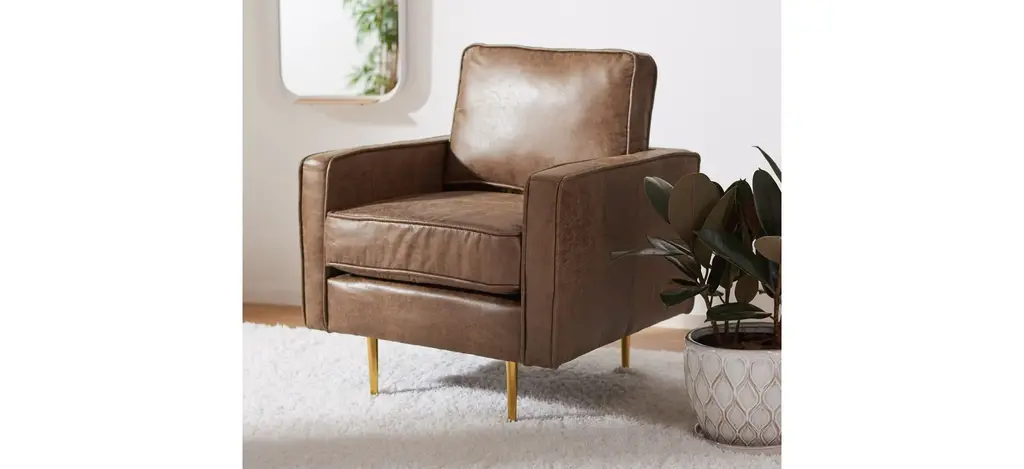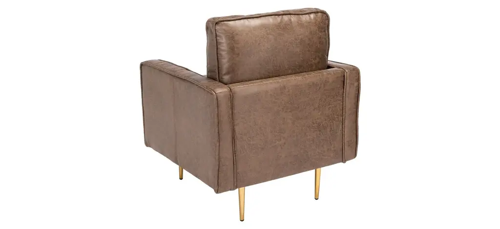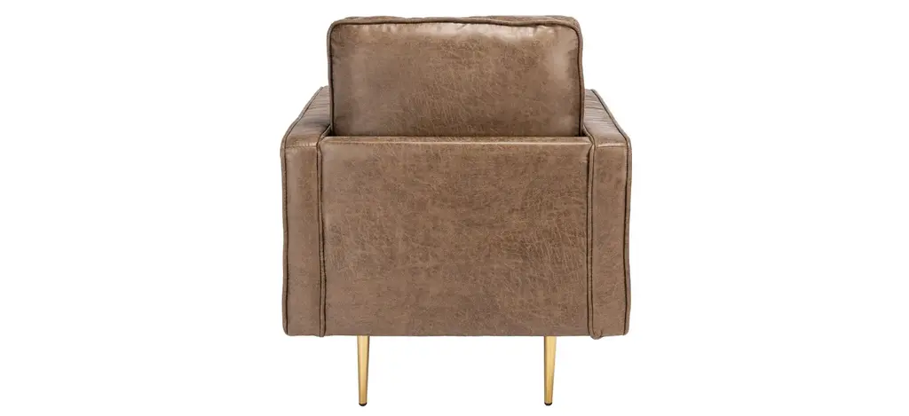Traditional-style comfort is given a sleek modern upgrade in this phenomenal Paityn Accent Chair. Paityn's classic silhouette in plush rustic brown upholstery reaches new glamorous heights with shining gold metal legs, emanating a distinct designer look.