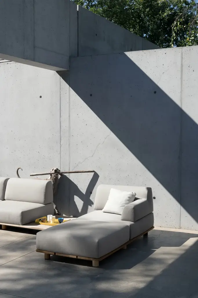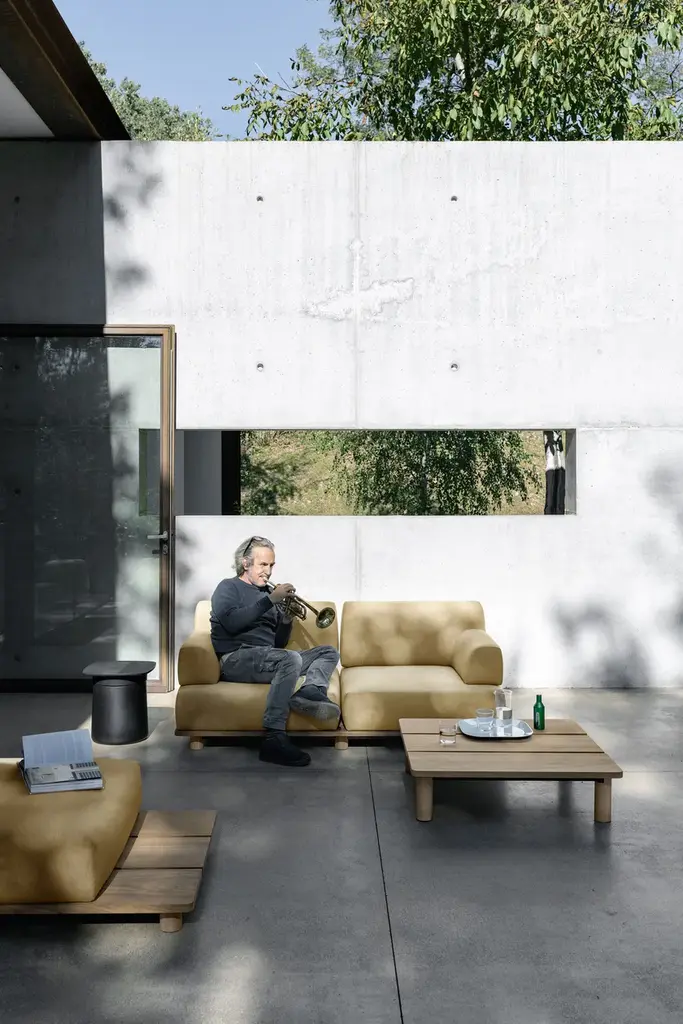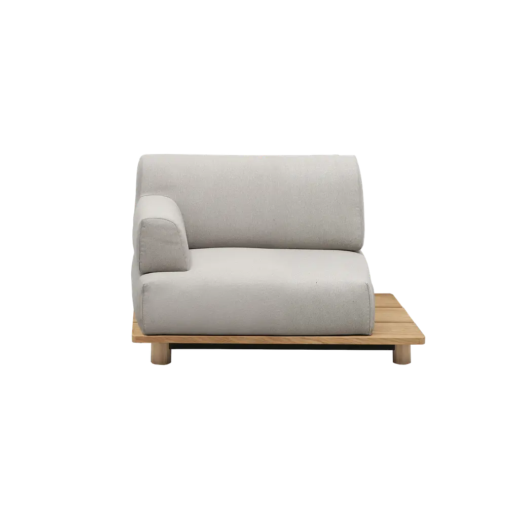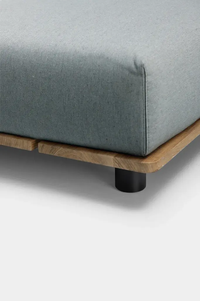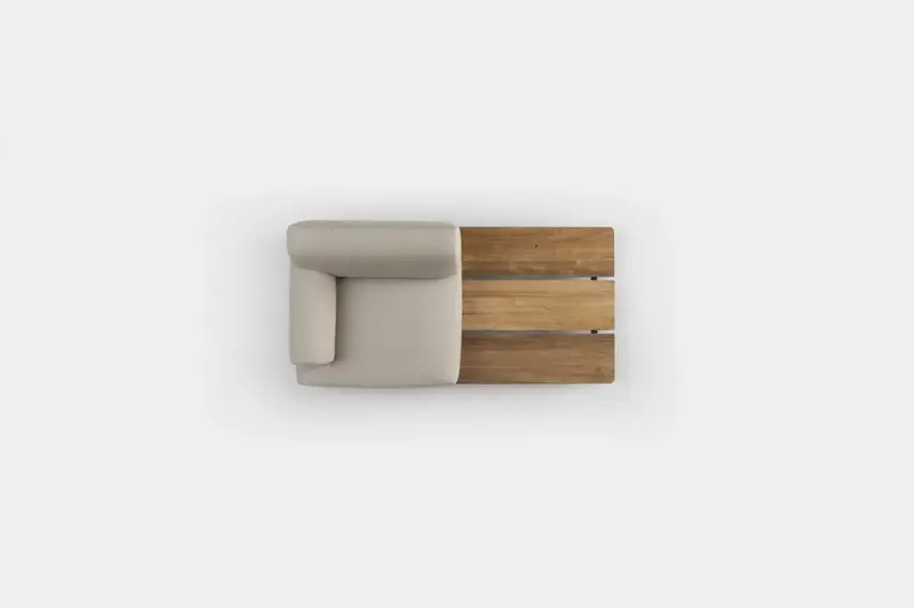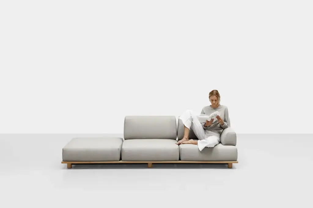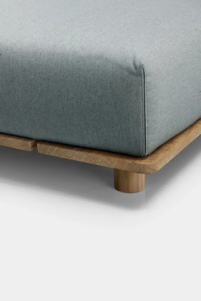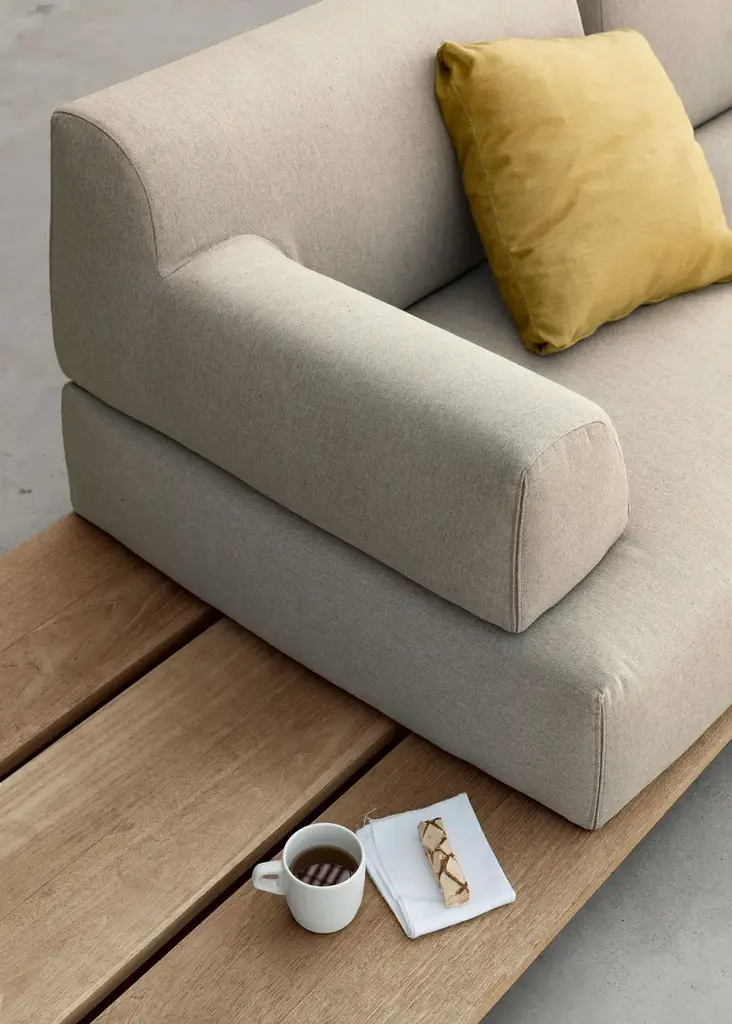 Palco is a sectional fabric garden armchair.Sam Hecht and Kim Colin, founders of the London-based Industrial Facility, are internationally renowned for the beauty and gracefulness of their designs, which almost always feature the most common everyday objects. For Kristalia, they designed Palco, an outdoor seating system inspired by pallets, slatted tables and classic outdoor decking. The ideal location recommended by Kristalia for Palco is on covered and semi-covered verandas and terraces. In addition to the version with teak wood slatted top, which can be treated with oil or left natural to make it take on its characteristic silver color over time, Palco is now also available with a platform in drawn aluminum, also with slats. The aluminum version is 100% recyclable and requires no maintenance.Frame finish: teak/aluminumBeams finish: black painted steelFeet finish: teak / black painted steel/aluminumUpholstery finish: Natté - Heritage (Sunbrella®) fabric / Patio (Kvadrat®) fabric