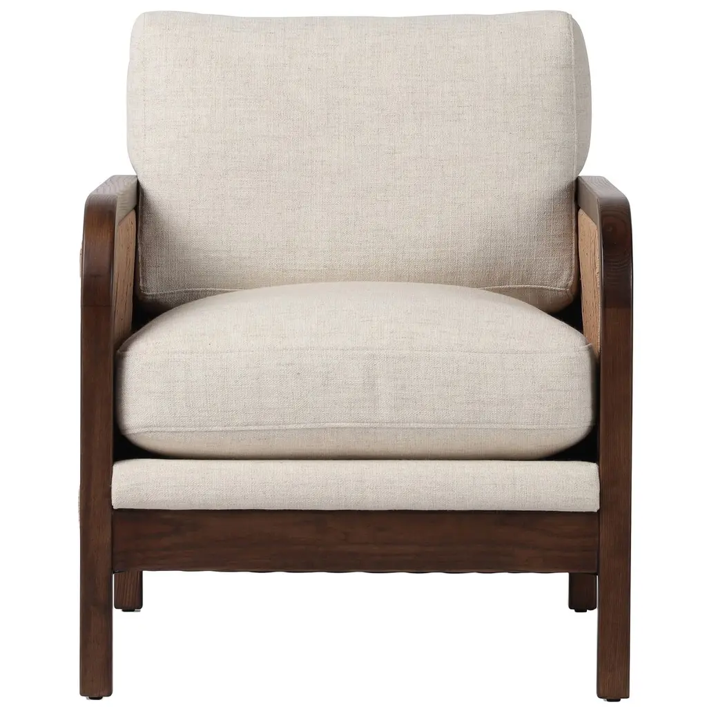 Side panels of woven paper rush bring an unexpected tropical breeziness to this chair's bold silhouette. The dark finish of the durable hardwood frame provides a dramatic contrast not only to the rush but also to the pale stain-resistant performance-fabric upholstery. S-spring seat construction and generous feather-blend cushion fill ensure long-lasting comfort.