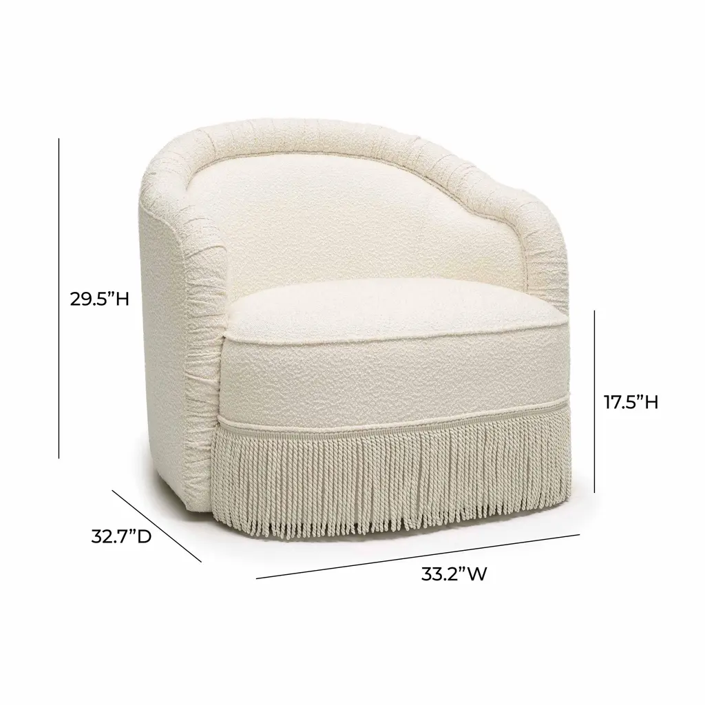 Introducing the Pamela Tassel Lounge Chair, a grandmillennial dream come true, available in luxurious Cream Boucle, serene Faded Blue Recycled Fabric, or a stunning Spring Floral print. This sumptuous armchair boasts exquisite English ruched pleating, accented with high-end tassels that add the perfect decorative element to your space. Its incredibly comfortable design beckons you to unwind and relax, reassured by the fact that its soft, textured appearance is crafted from commercial-grade, environmentally-friendly fabrics made from upcycled plastic bottles.
