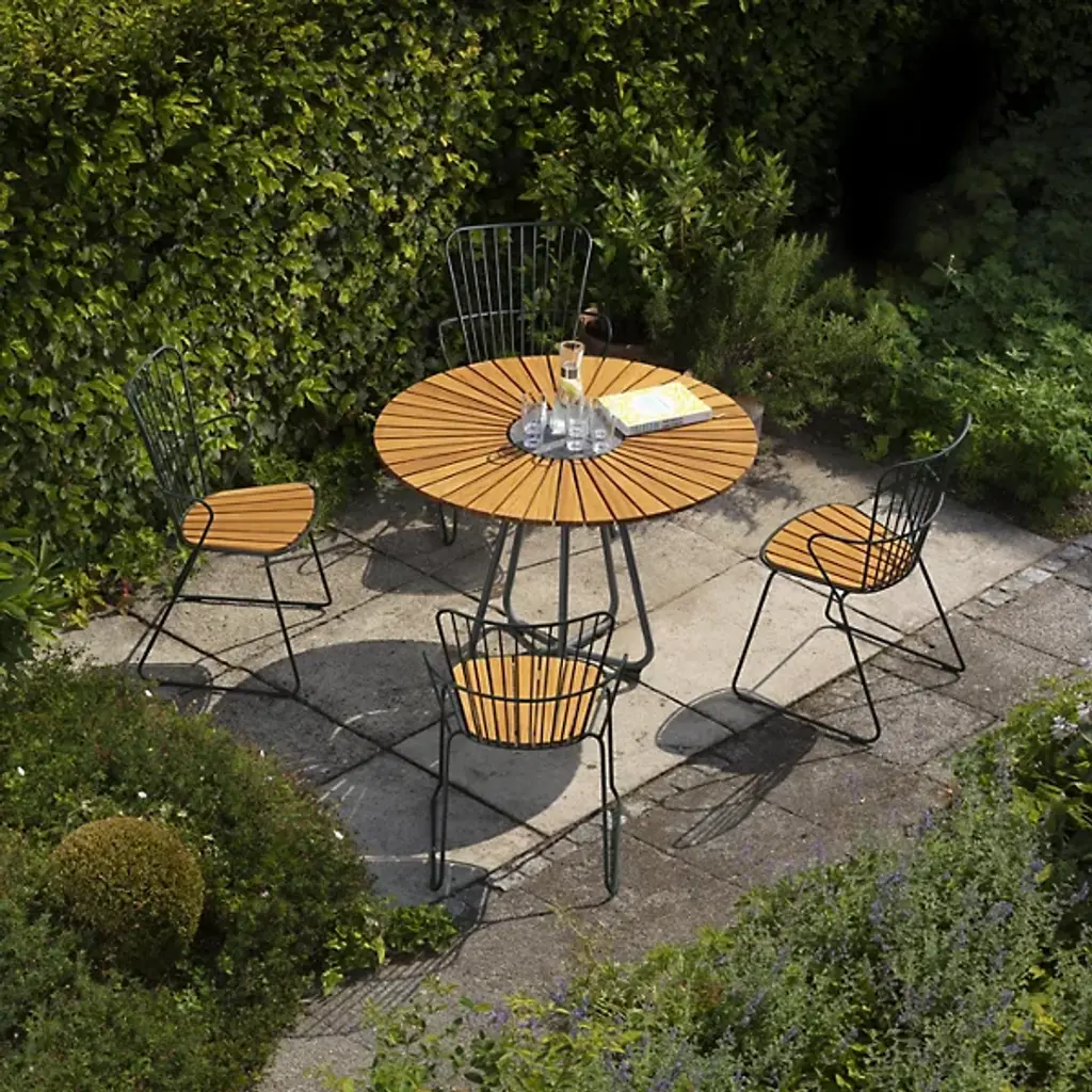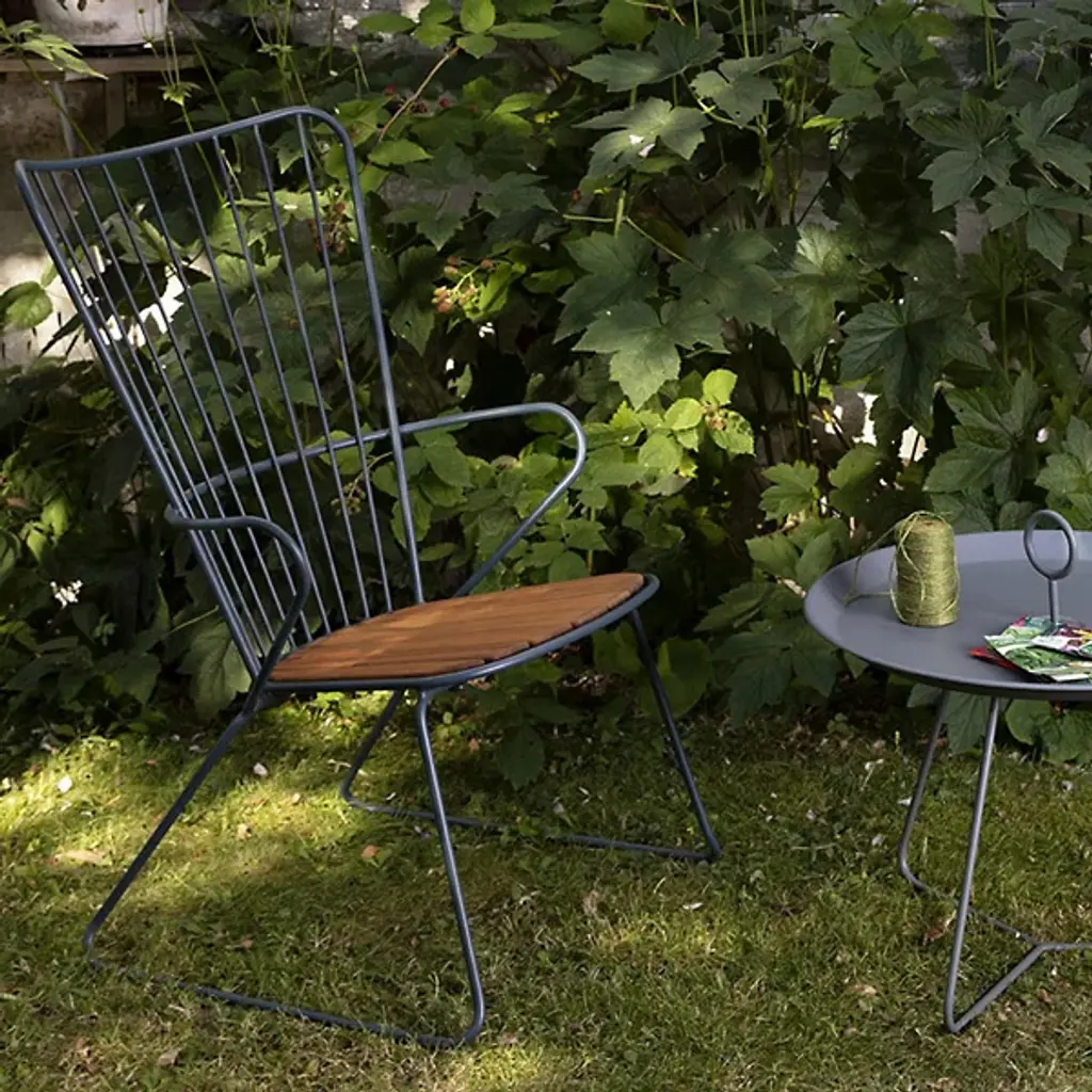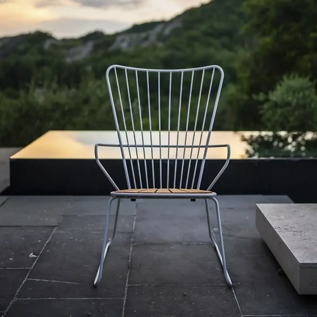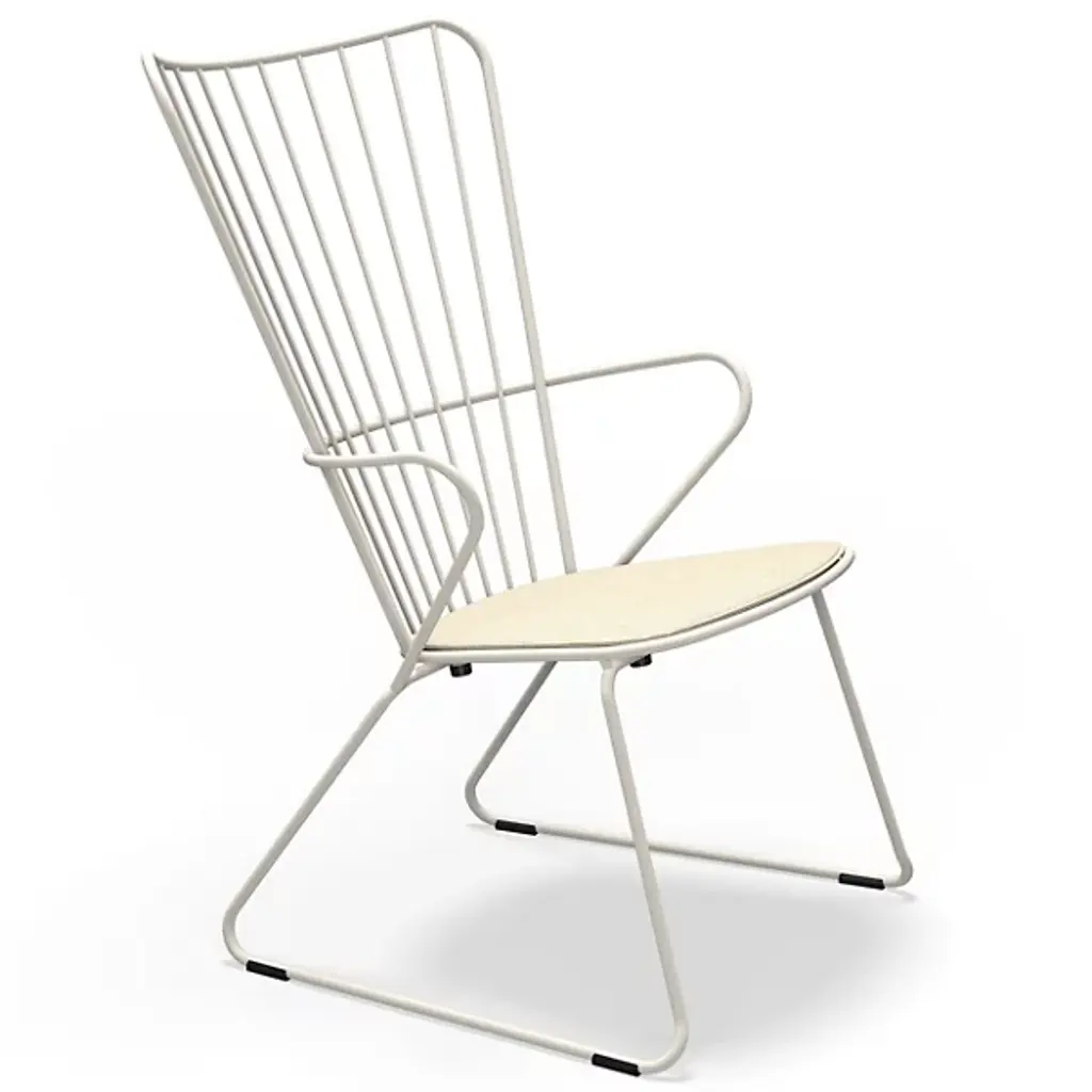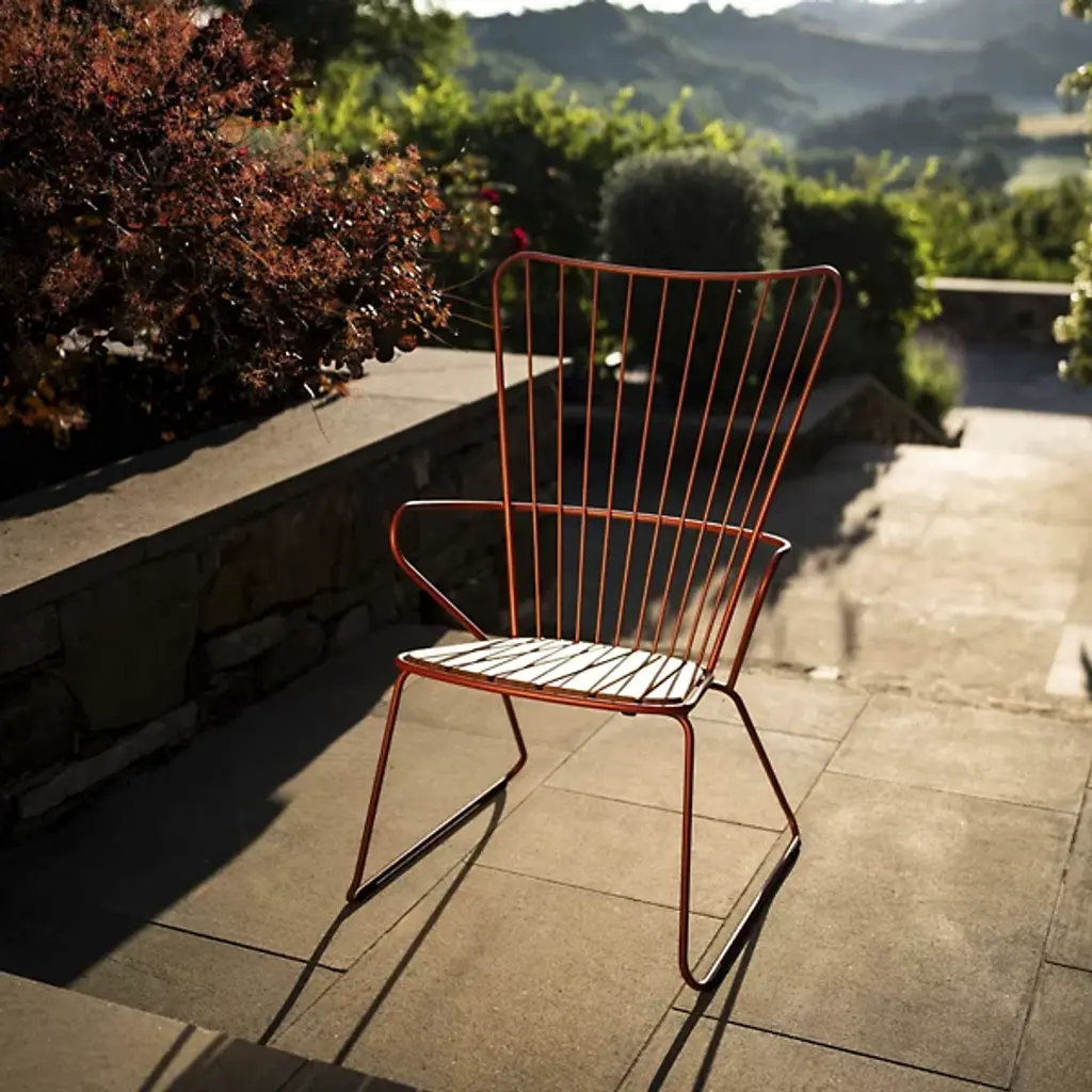 The Paon Outdoor Lounge Chair from Houe embraces the body with airy, sculptural curves modeled after Scandinavian and French Victorian aesthetics. It shows its French Victorian side with the fluidity of its steel structure. Steel rods taper upwards to create a stable base and a gestural armrest. The tall backrest produces radiating lines like a beautiful seashell. These lines are evenly spaced so comfortable air can pass through. This artful backrest curves to cradle the body. The seat rest wraps the piece up with a comfortable yet low-profile shape.
