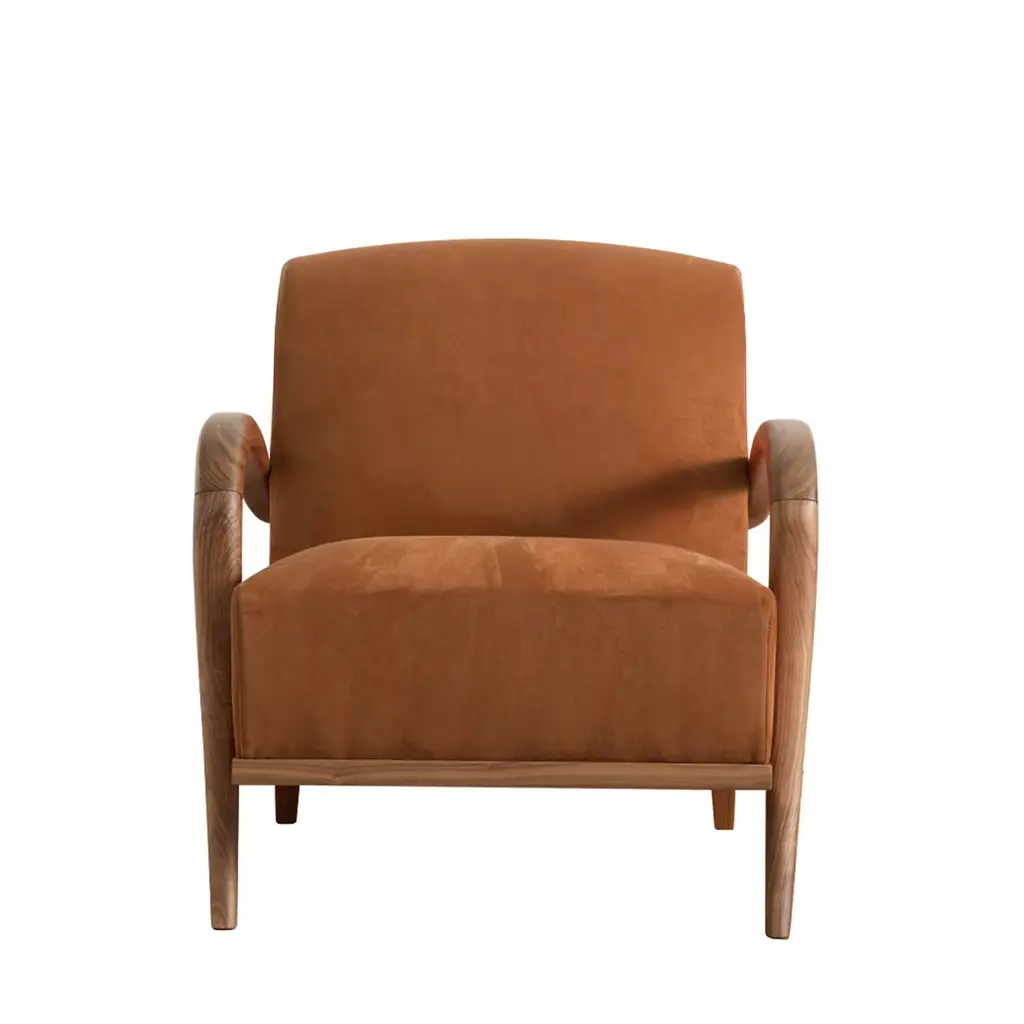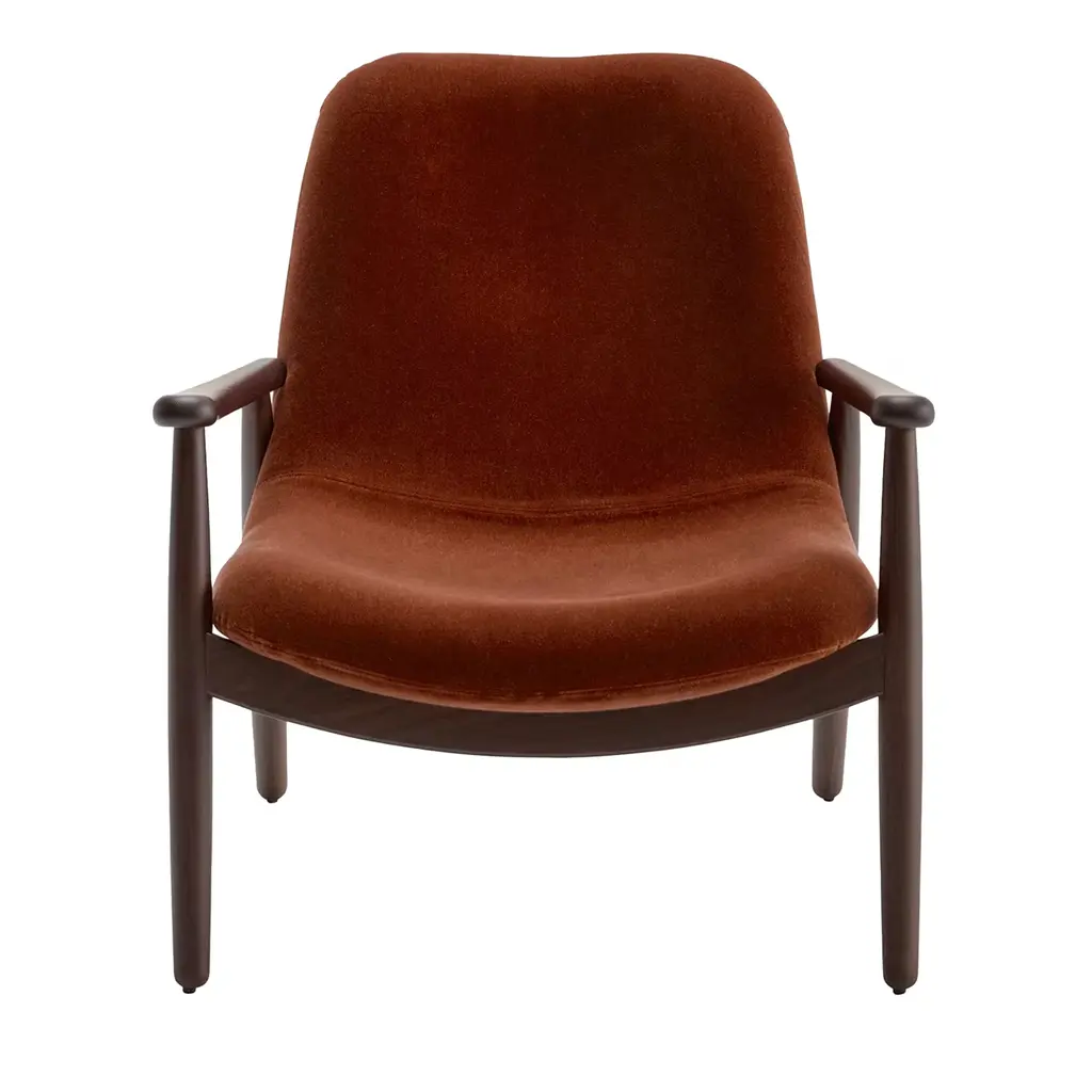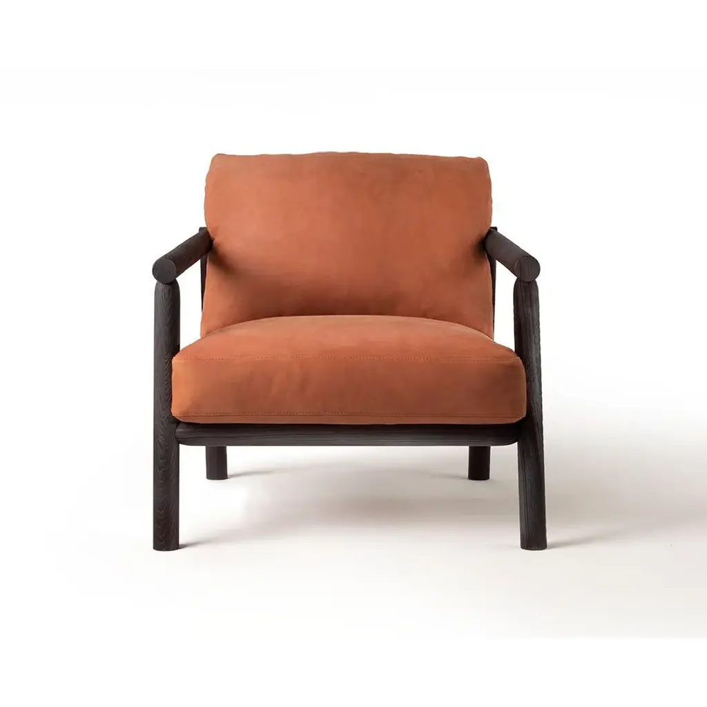 Warm and inviting, the Domino lounge chair is for true wood lovers. Crafted in Canaletto walnut with Modo10's Havana stain, the wood's natural veins take center stage. The chair is then generously stuffed and upholstered in the fabric of your choosing, shown here in paprika faux nubuck leather. The chair comes with hidden metal reinforcements in the feet.