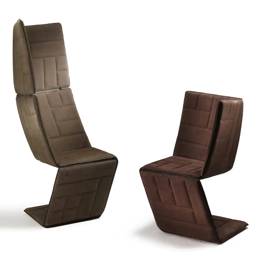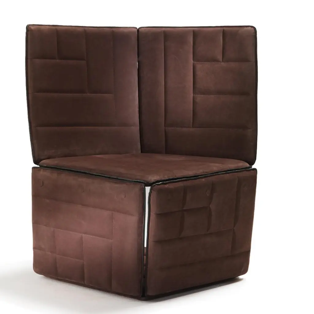 A stunning exercise in contemporary design, this modular chair is a striking addition to a modern home, where its deconstructed silhouette will be of strong visual impact in a living room, entryway or study. The metal frame is fully covered in nubuck leather with a tufted pattern of squares and rectangles. The diagonal base supports a seat (44 cm high) from which a two-element backrest stems. It is possible to pair this with the Parallel Tall Chair for a dynamic effect.