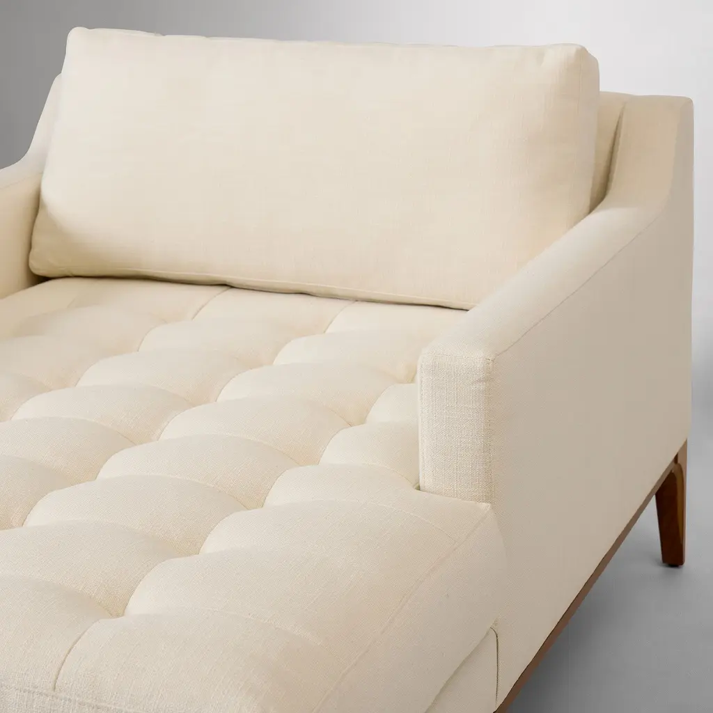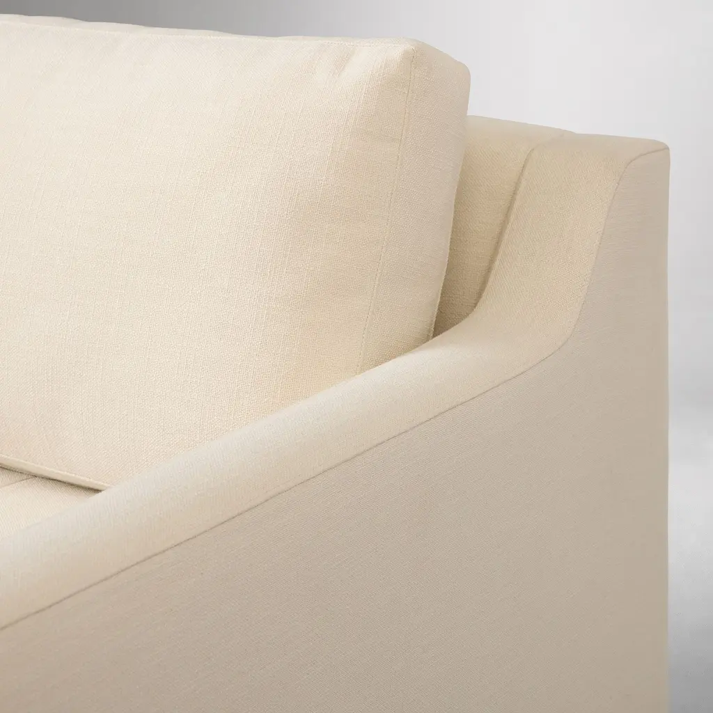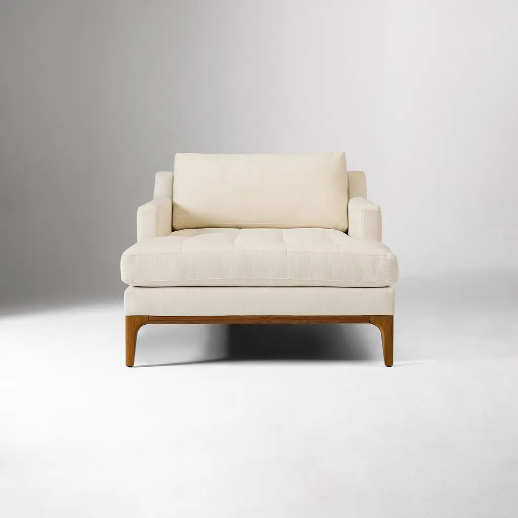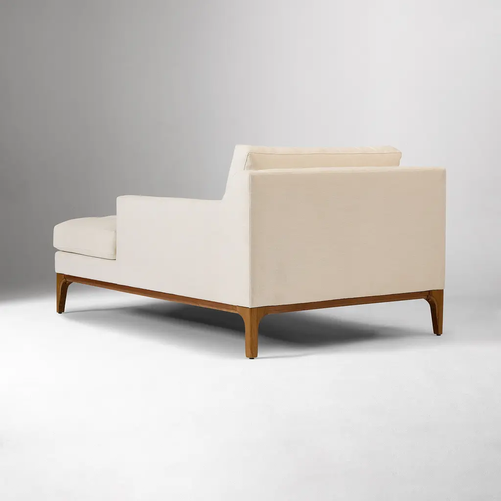 The grand-scale frame and sloped track arms. Streamlined cushion sits on a polished wood base. A cozy way to add extra seating for lounging or guests spending the night. Hand-built frames with hand-finished upholstery. Contract Grade, so you know it’s built to last.