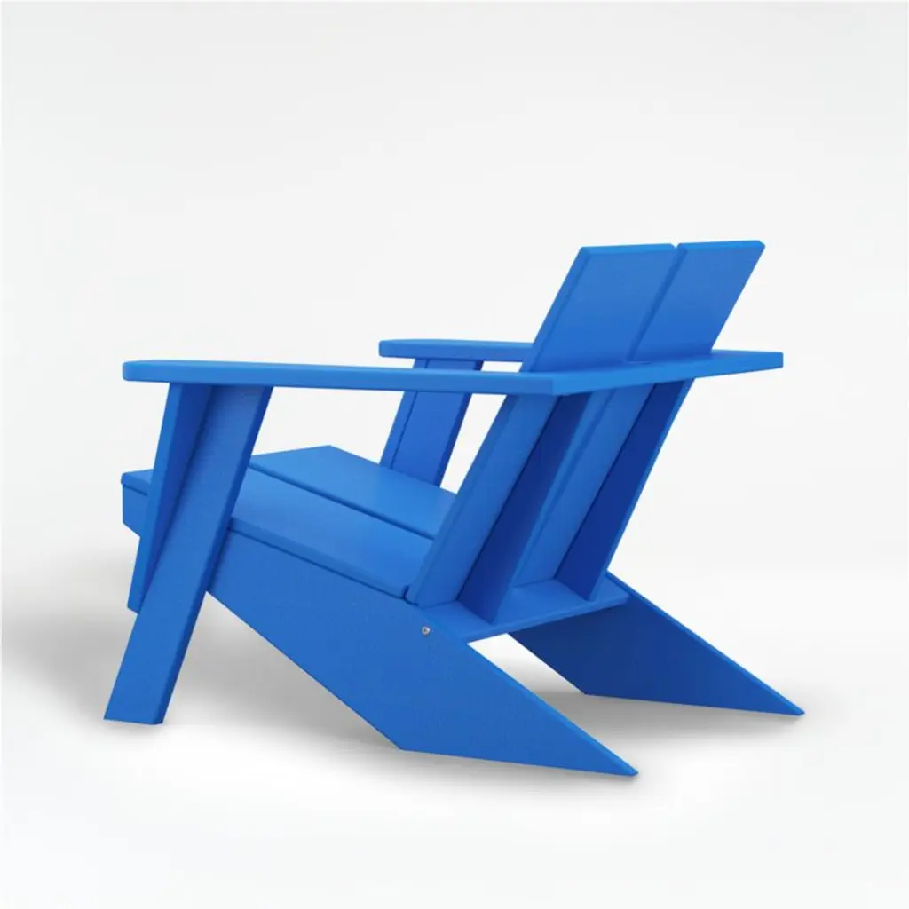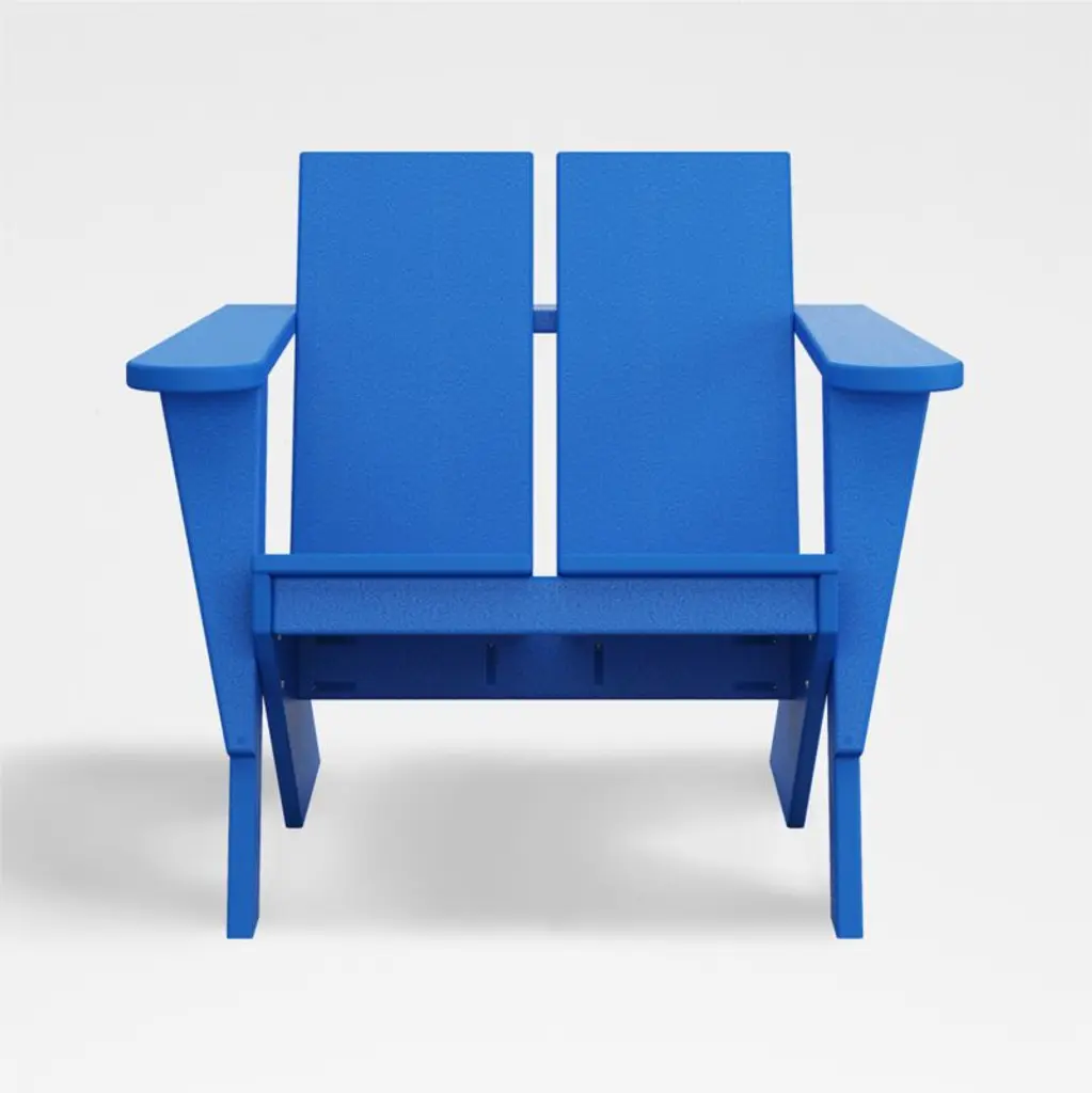 At ease with angles, Paso updates the classic Adirondack chair with modern lines and bold shapes in classic blue. Made of weather-resistant POLYWOOD, a proprietary blend of plastics, including recycled milk jugs and detergent bottles, the chair assumes its relaxed recline with a streamlined double-slat seat and back, plank-style rear legs, broad armrests and flange-accented front legs. Pair with our matching Paso ottoman for the ultimate outdoor lounge. A sculptural take on a summer staple, the Paso Adirondack chair is a Crate & Barrel exclusive.