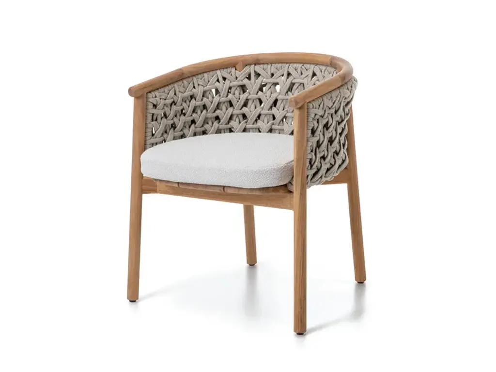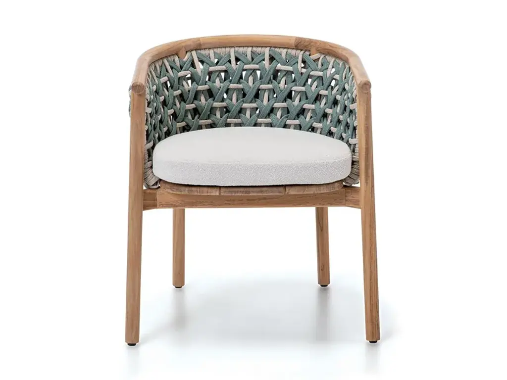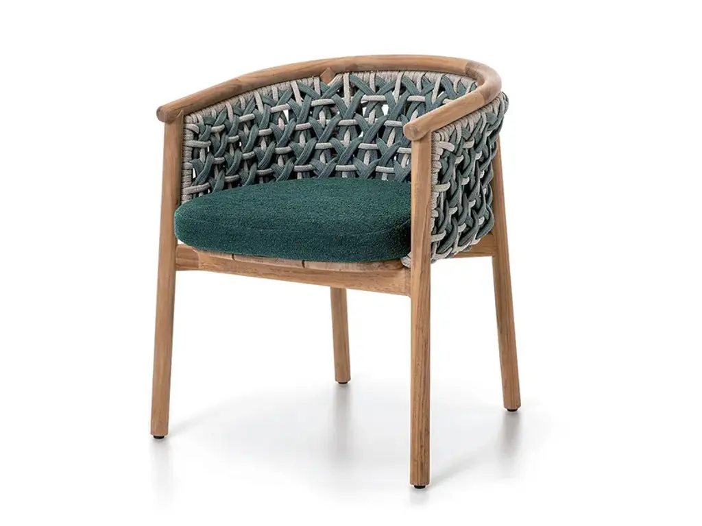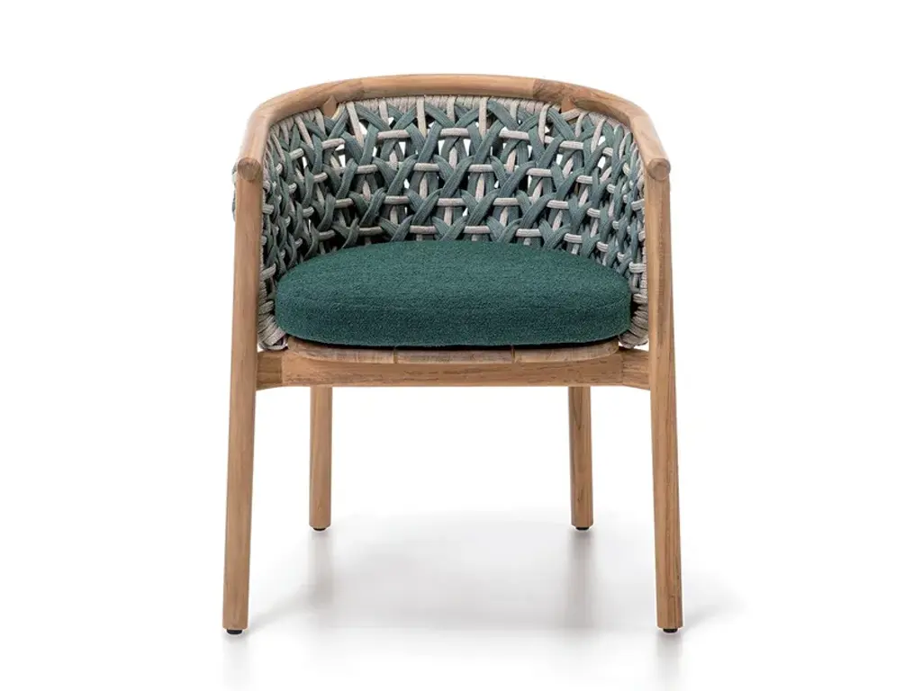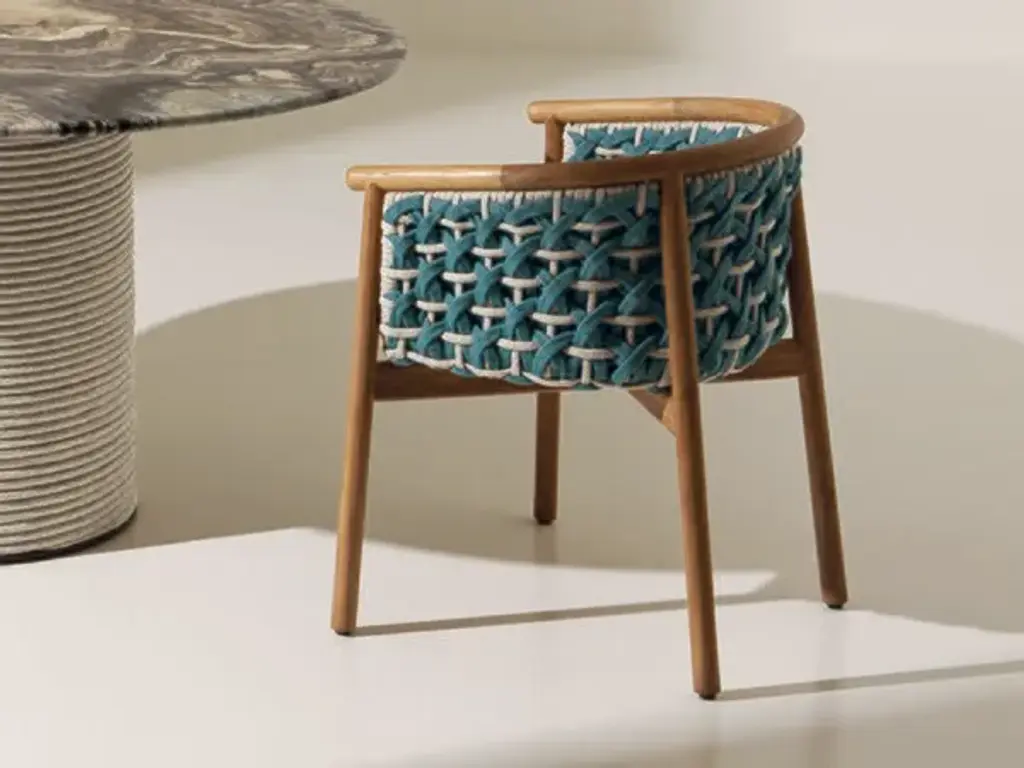Patio is a chair with armrest and with frame in natural teak and backrest in woven flat rope Laguna and flat rope Light Grey. Cushions in polypropylene Madre Perla.Patio is a new line of outdoor furnishings that stand out for their creative use of weaving teamed with the natural beauty of teak.Patio is a lounge collection with welcoming shapes and a cocoon function, conceived to hug the body in a comfortable embrace. Its name and special arched weave recalls the traditional inner patios so typical of Spanish architecture, where porticoes and loggias housed the various rooms in the house, opening out onto the uncovered courtyard with pools and fountains decorating the garden.“The Patio collection,” explains Studio Zanellato/Bortotto, “stems from our passion for the variety of weaves and patterns discovered on our travels. We designed a series of motifs as 3D surfaces that could be become the decoration and structure of a series of outdoor seating elements. The latter become true frames in wood and teak into which skilled craftsmen weave close patterns based on our suggestions, tests and inspirations, gathered with this new project in mind for Ethimo.”