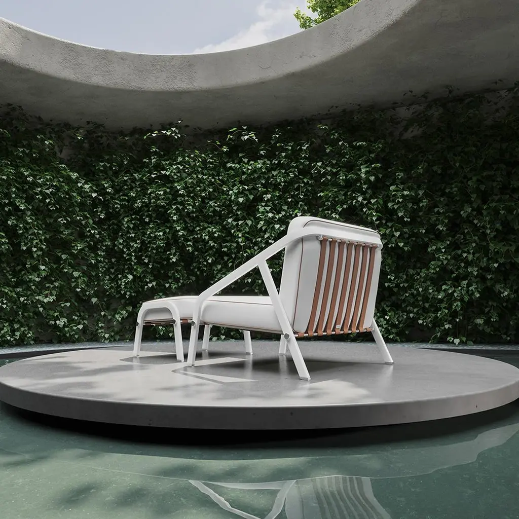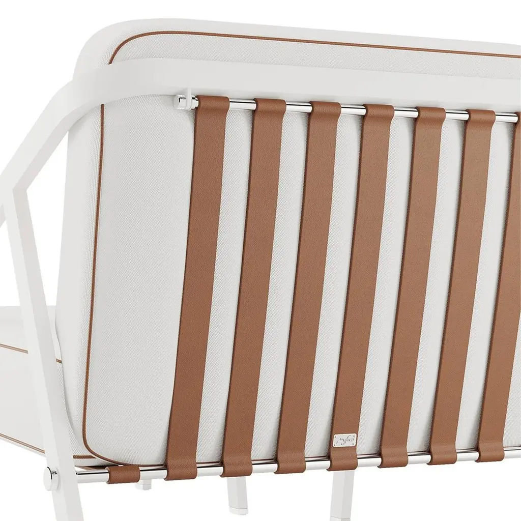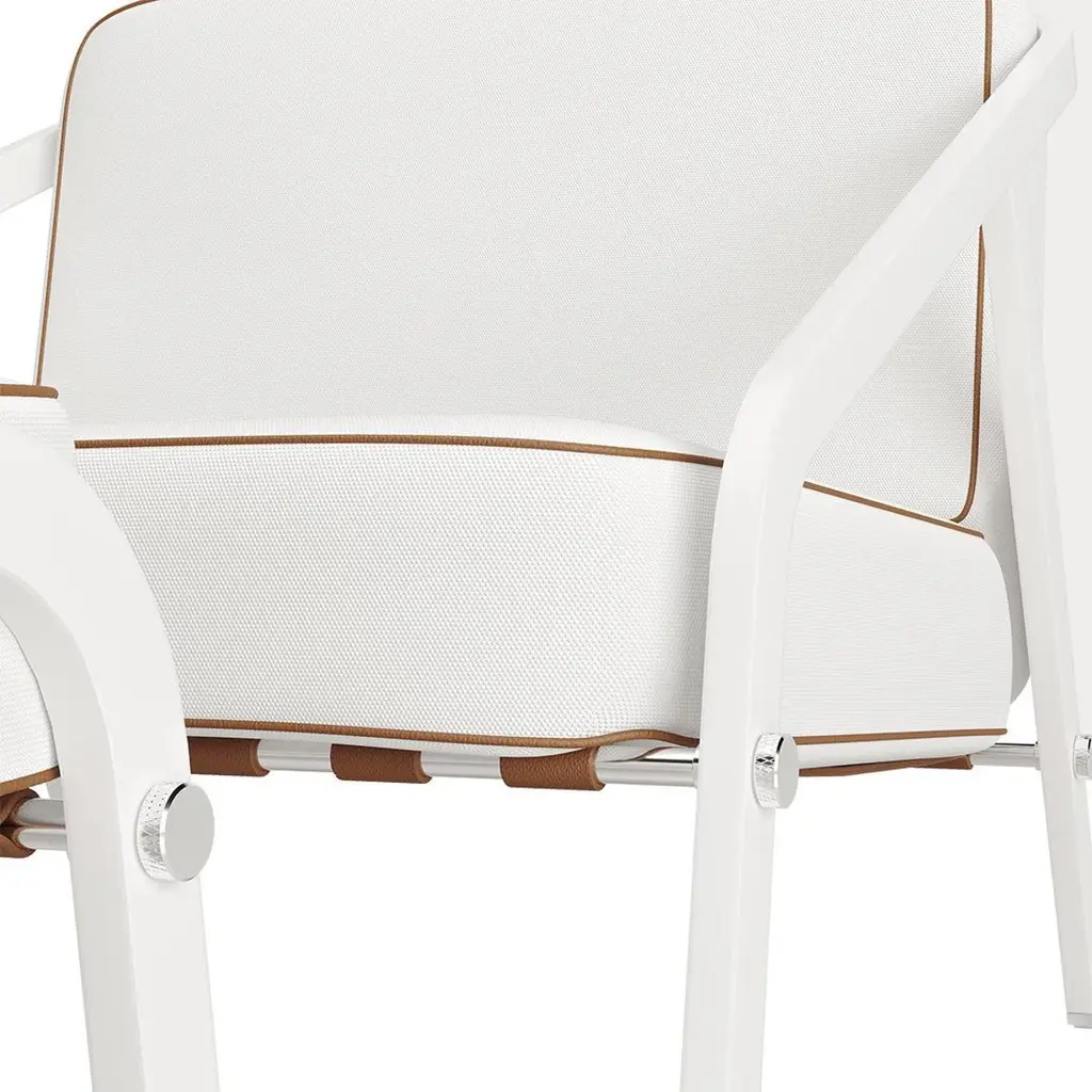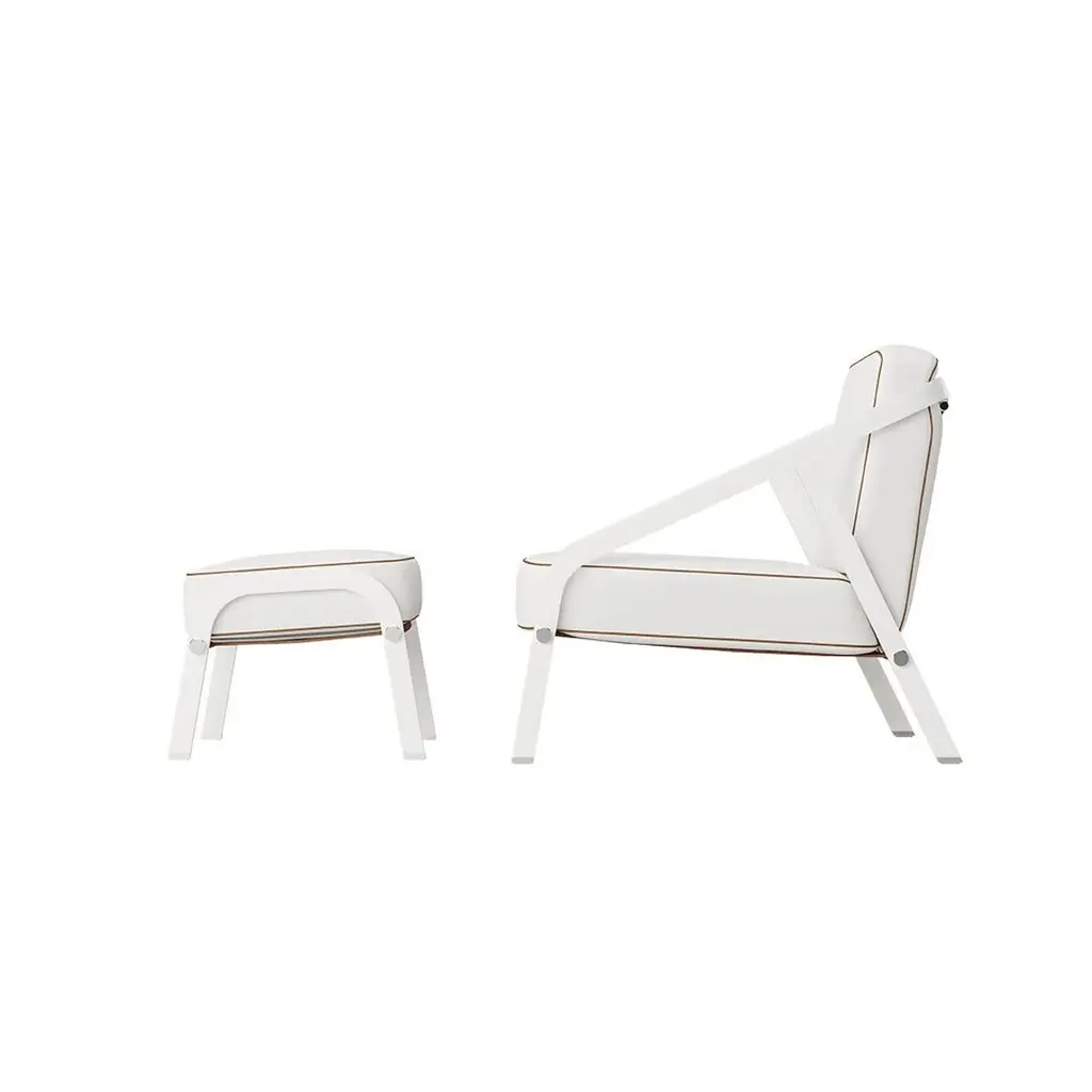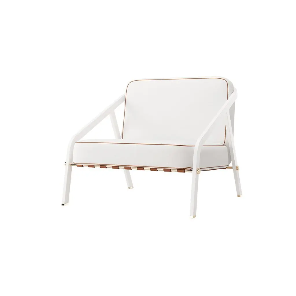 Ribbon - Outdoor lounge armchair Contemporary outdoor lounge armchair made with structure: White powder-coated aluminum, Metallic details: Nickel-plated, Upholstery: Acrylic fabric, Pipping: Outdoor synthetic leather, Straps: Outdoor Synthetic LeatherThe Ribbon lounge chair features a unique ribbon-shaped frame that adds a touch of elegance and sophistication to any outdoor space. Its contemporary design is sure to impress, while its durable aluminum frame ensures long-lasting performance.Its soft, water-resistant cushion and ergonomic design make it the perfect choice for the lounge area. The cushion fabric is removable and washable, ensuring always looks its best.Whether you are reading a book or enjoying a refreshing drink, the Ribbon Outdoor Lounge Chair is the perfect choice for a comfortable and stylish outdoor seating experience.