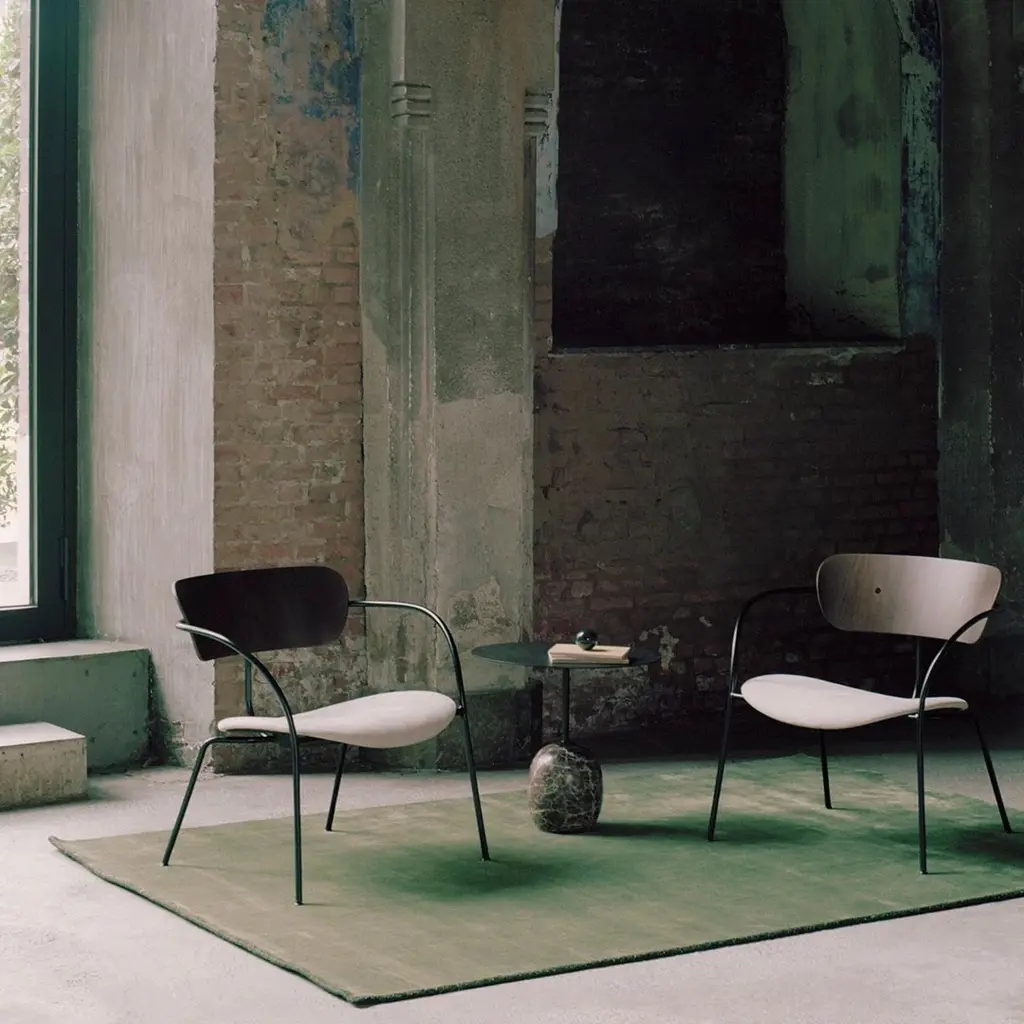 At first glance, the Pavilion lounge chair appears almost like a rope that's come undone. From the curvaceous wood veneer seat and back to the steel tubes that form the armrests and legs, it's a continuous flow of lyrical lines. A stackable chair that's airy from any angle, it's designed to be slightly laid back and with a wider seat than its cousin the Pavilion chair. In doing so, the Pavilion lounge chair is an open invitation to lean back, relax and stay a while. Black fittings are installed as a standard on the front of the backrest. Brass fittings are available upon request.