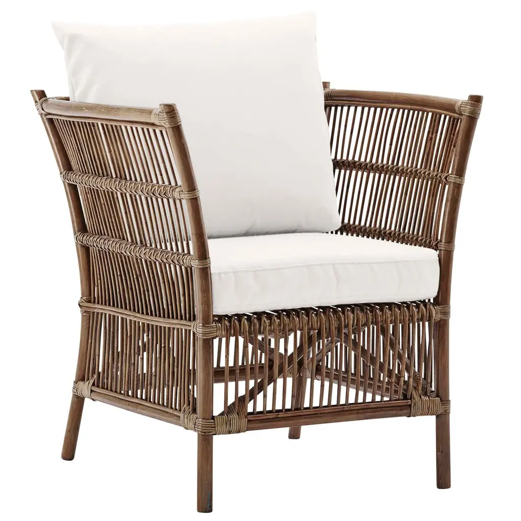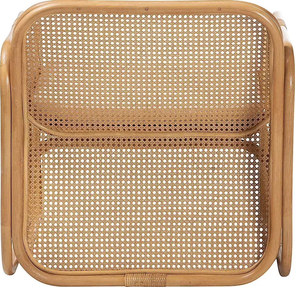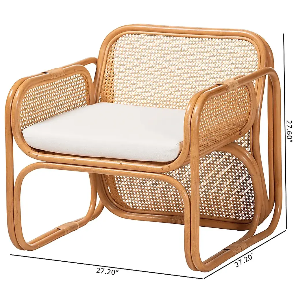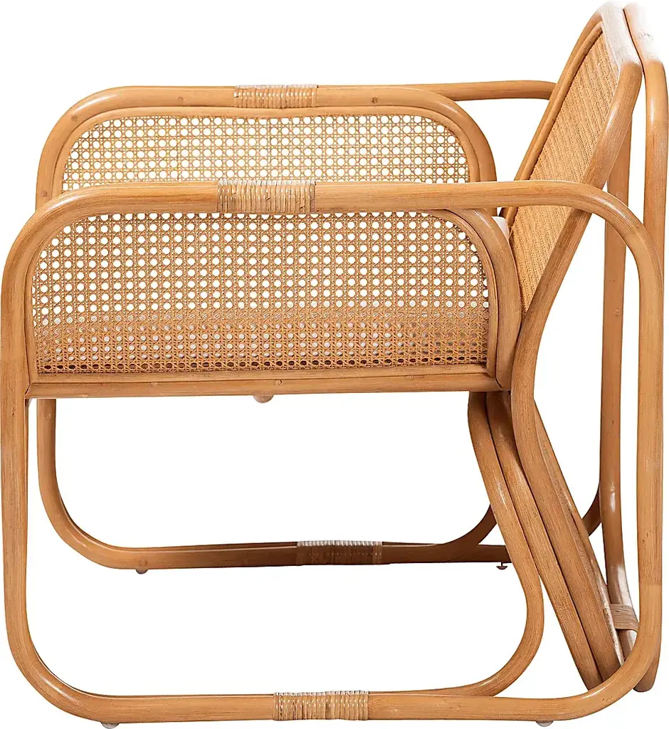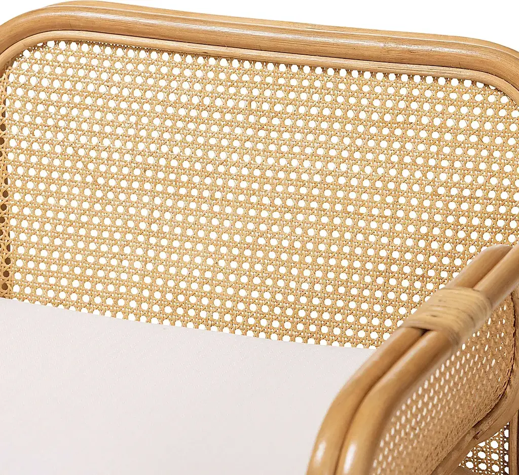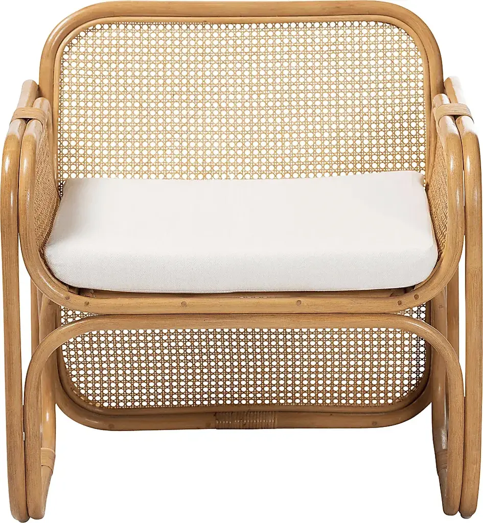 Bring a mood of tranquil leisure to your space with the breezy serenity of the Peachaid brown accent chair. This bohemian piece is handcrafted from sustainably sourced natural rattan. Its bold legs seamlessly integrate into the frame to form cozy armrests while woven rattan embellishments create an airy, relaxed feel. The Peachaid will arrive fully assembled and is fitted with a removable seat cushion padded with plush foam and upholstered in sumptuous fabric. Rattan is a product of nature and may have variations in areas such as, but not limited to, color, pattern, grain and texture. The hair-like strands of rattan/rattan-fiber are common due to the nature of the material.