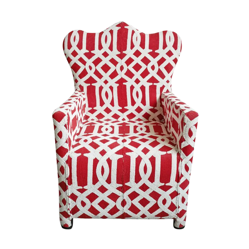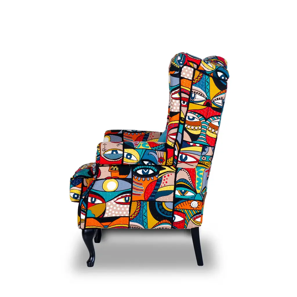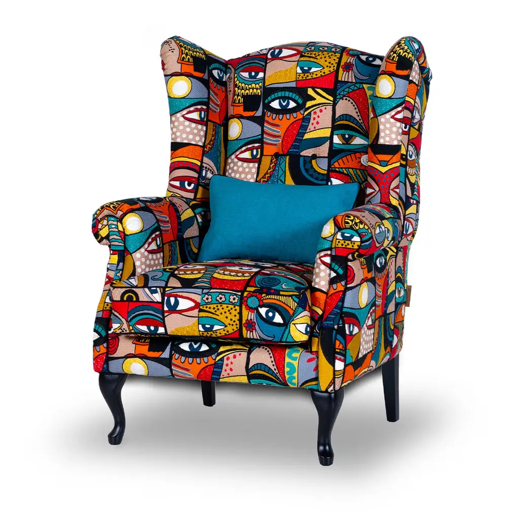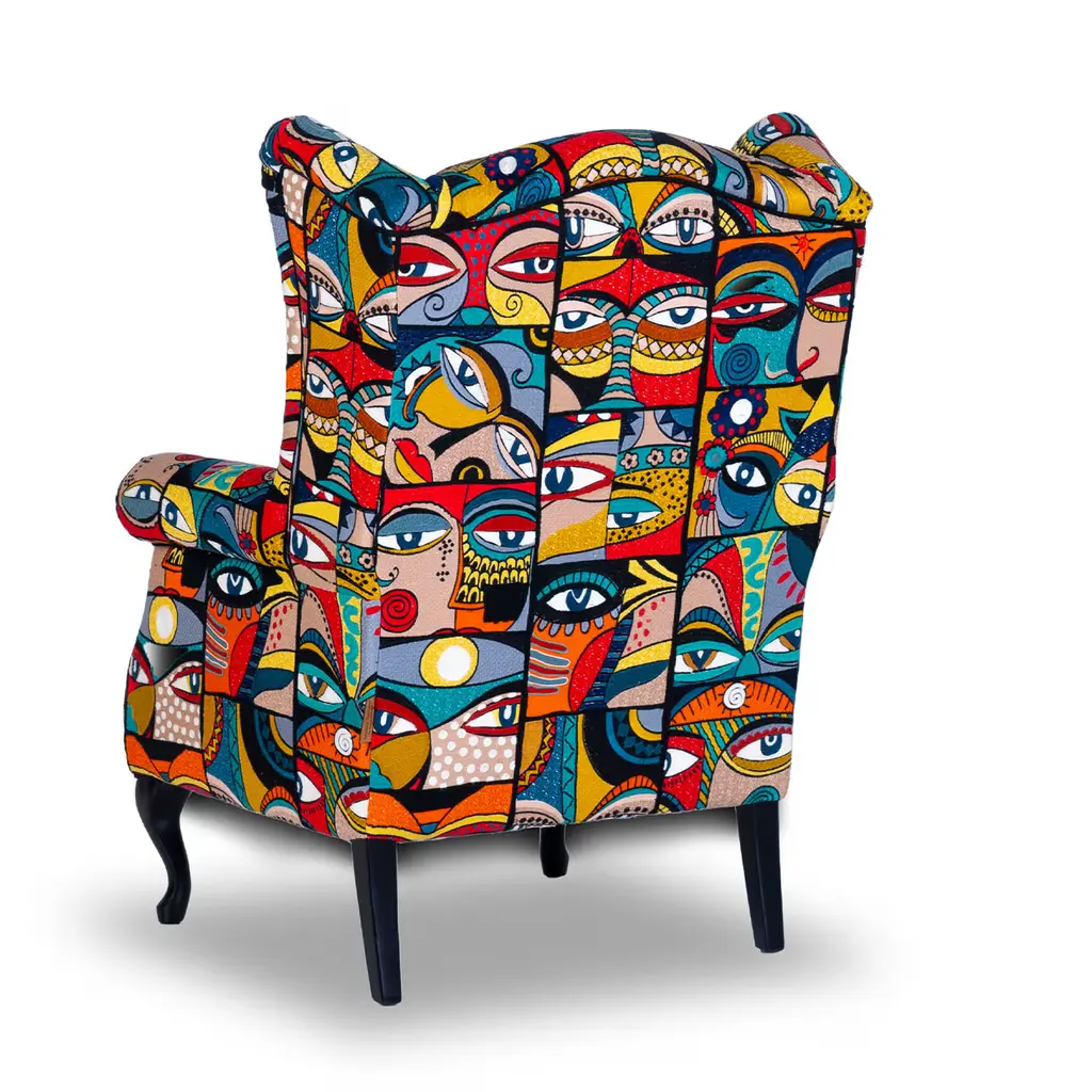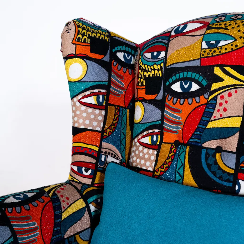 Inspired by the typical French bergère, Pia is a classic armchair with sinuous shapes and timeless design. The high backrest and the padded side ears make it irreplaceable in any environment, from the study to the living room, from the reading corner to the fireplace corner. The grosgrain border, customizable in tone-on-tone or contrasting colors, outlines the elegant shapes of the Pia armchair. Patchwork fabric art. Eyes, handmade fabric in Italy with artisan looms.