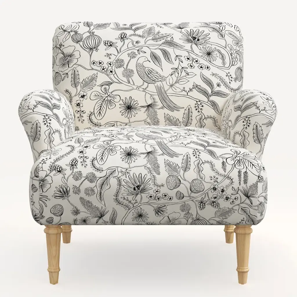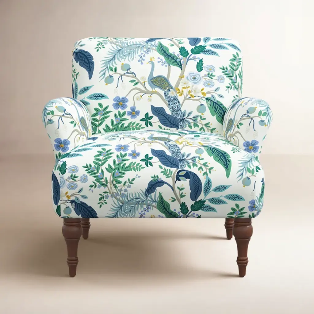 A superb object of functional decor, this armchair will be a stunning statement piece in a modern entryway, classic living room, or eclectic study. Its elegant silhouette is made of wood and is entirely upholstered for a comfortable seating experience. Its seat (45 cm high) is supported by tapered feet in a matte dark walnut finish with antique brass tips. The chair's upholstery is its standout element, with a jacquard print of majestic birds and flowers over a turquoise background.
