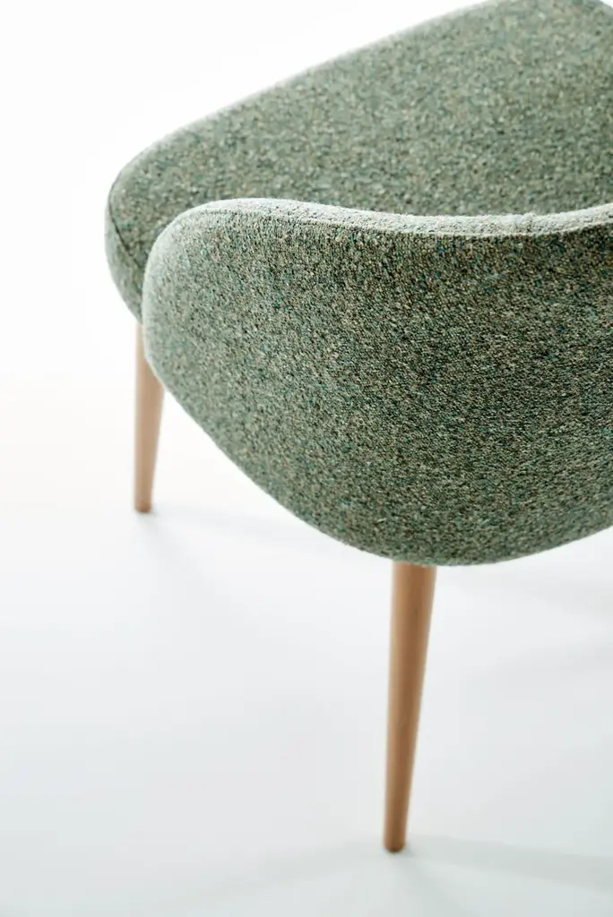 Armchair with a padded plywood back shaped to save space when it’s approached to the table, without sacrificing the comfort of the armrest. The seat is on elastic webbing and non-deformable polyurethane foam with different densities. Solid beech-wood conic legs stained or laquered. The covering is proposed in various options. The matching barchair completes the rangeA large and soft back that harmoniously drops towards the seat is the distinctive feature of Pitt, a collection of seats capable to take on now austere, now playful tones, depending on the chosen materials, colors and finishes. It’s extremely suitable for furnishing hotels restaurants and all environments where a refined style is required