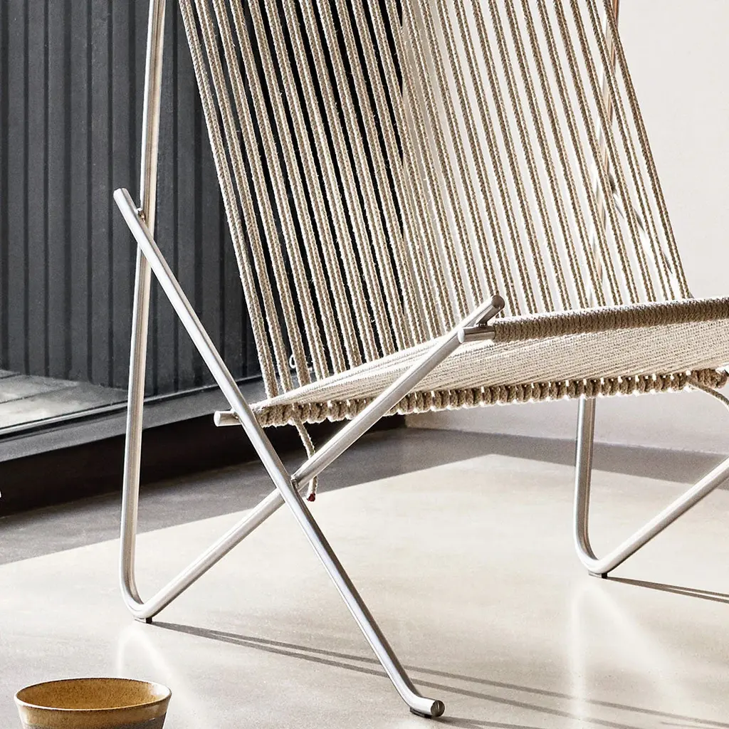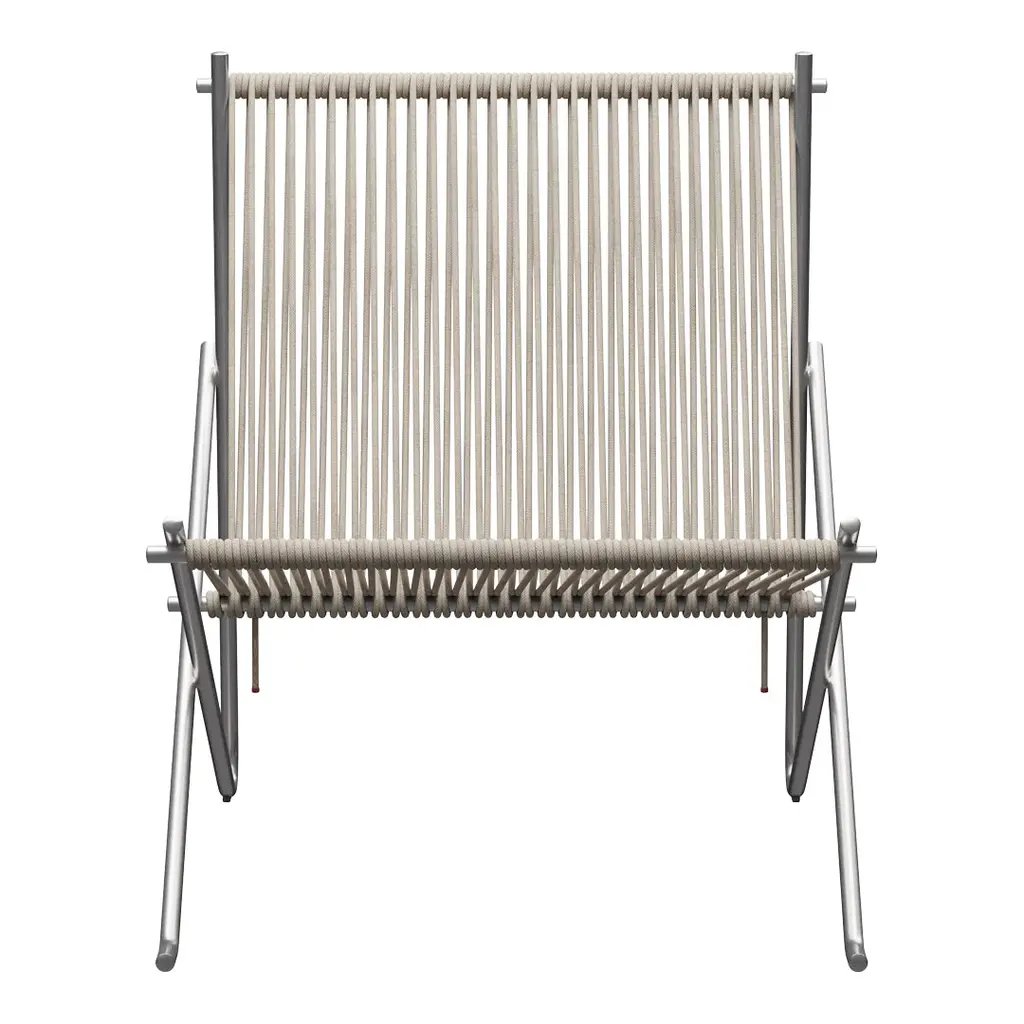 The striking PK4 is a modern, relaxed lounge chair that radiates Poul Kjærholm's distinctive elegance through a light, minimalistic expression in steel and flag halyard. It perfectly exemplifies Kjærholm's visionary approach where art and design intersect. Designed in 1952, the lounge chair was originally made as a limited edition for family and friends. The PK4 lounge chair consists of two materials - one unbroken halyard length and seven steel tubing pieces welded into a unified frame. Now available in three configurations: Black powder-coated steel with natural halyard; Stainless steel with natural halyard; or Stainless steel with black halyard. An additional cushion is available in three configurations: Natural canvas, Black canvas and Black Grace leather.