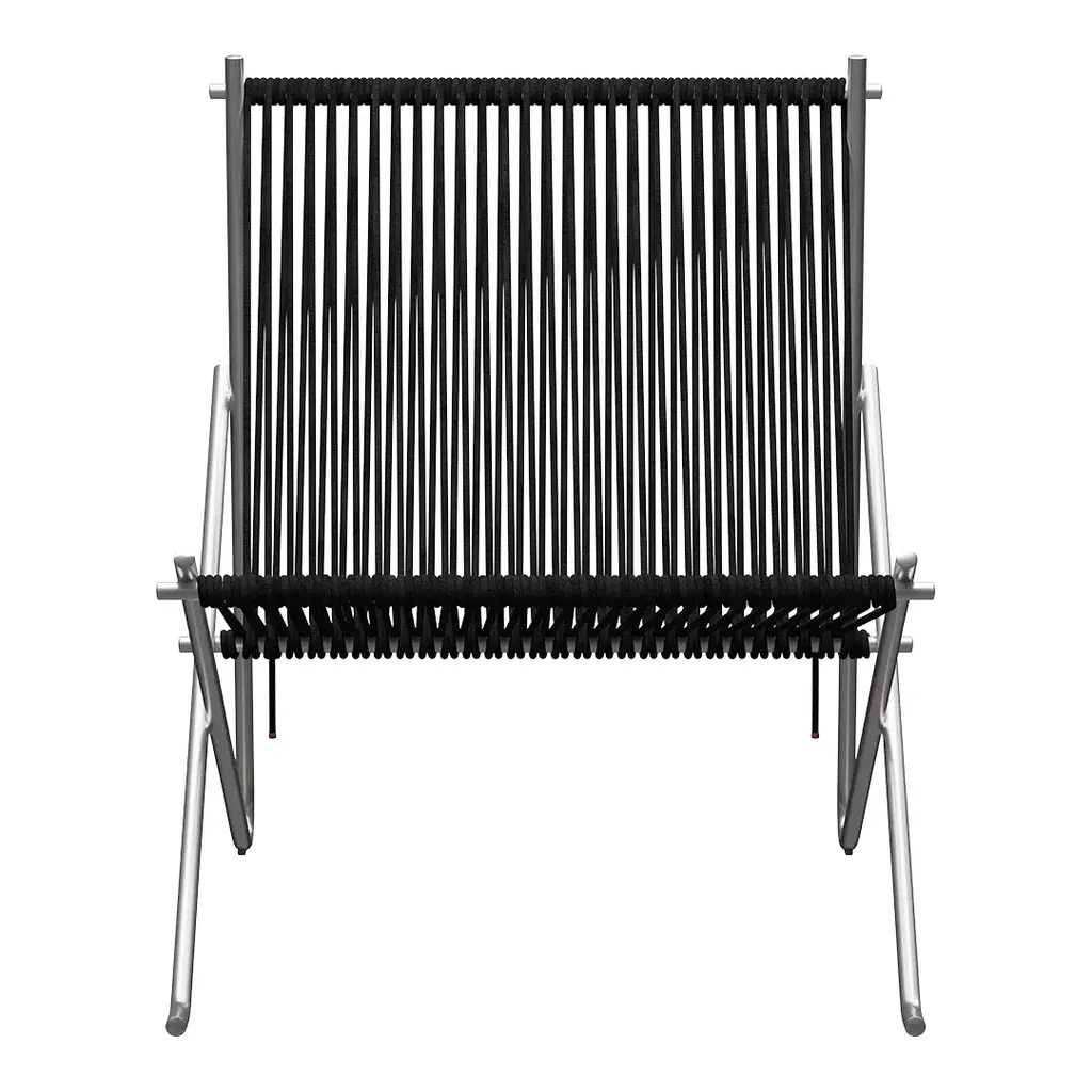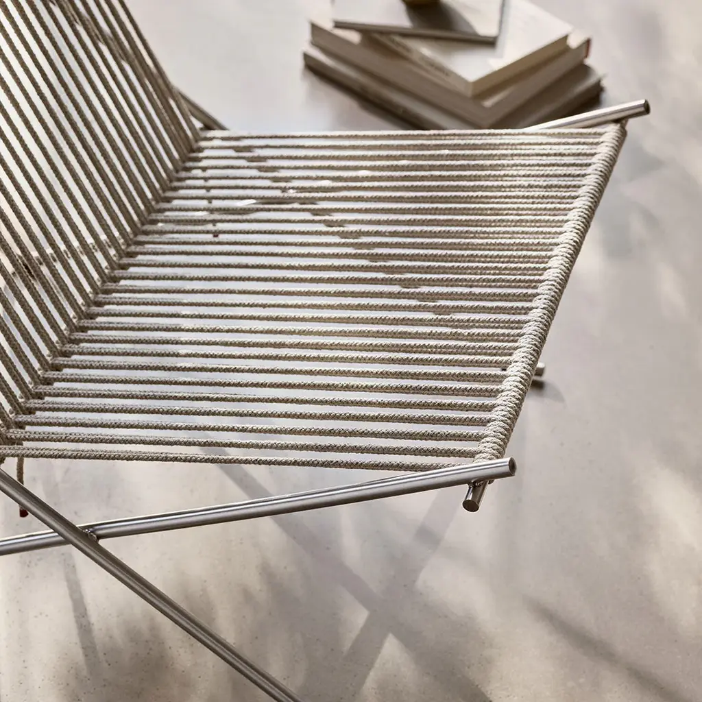 The striking PK4 is a modern, relaxed lounge chair that radiates Poul Kjærholm's distinctive elegance through a light, minimalistic expression in steel and flag halyard. It perfectly exemplifies Kjærholm's visionary approach where art and design intersect. Designed in 1952, the lounge chair was originally made as a limited edition for family and friends. The PK4 lounge chair consists of two materials - one unbroken halyard length and seven steel tubing pieces welded into a unified frame. Now available in three configurations: Black powder-coated steel with natural halyard; Stainless steel with natural halyard; or Stainless steel with black halyard. An additional cushion is available in three configurations: Natural canvas, Black canvas and Black Grace leather.