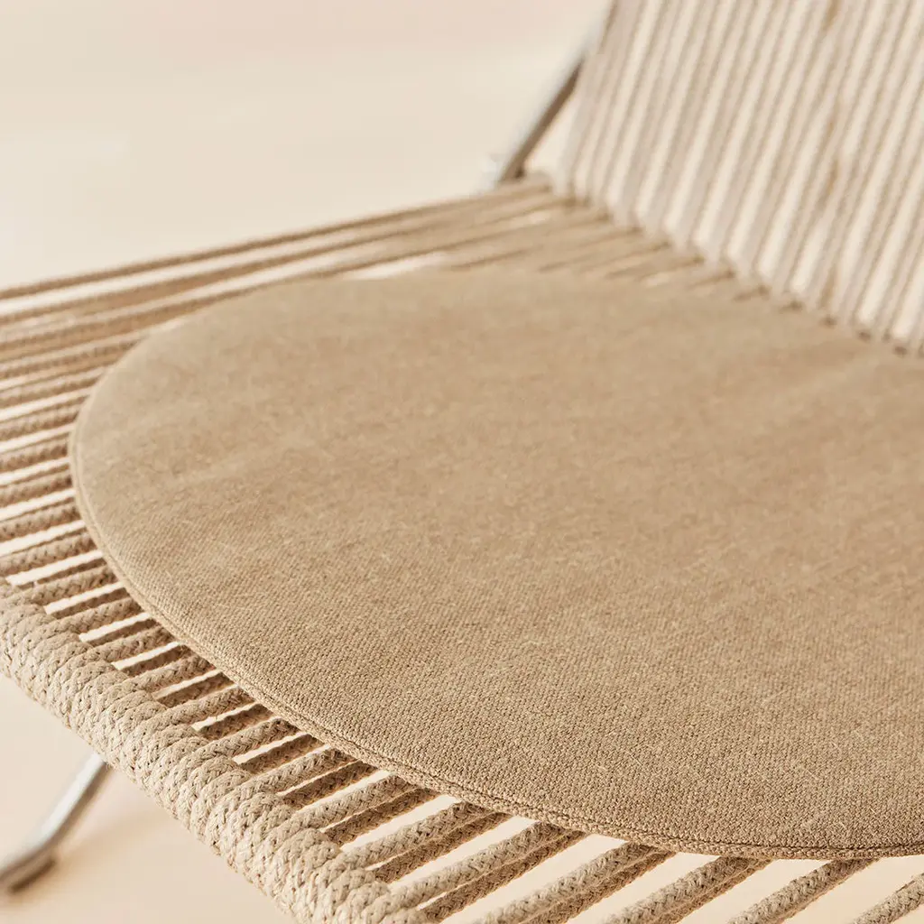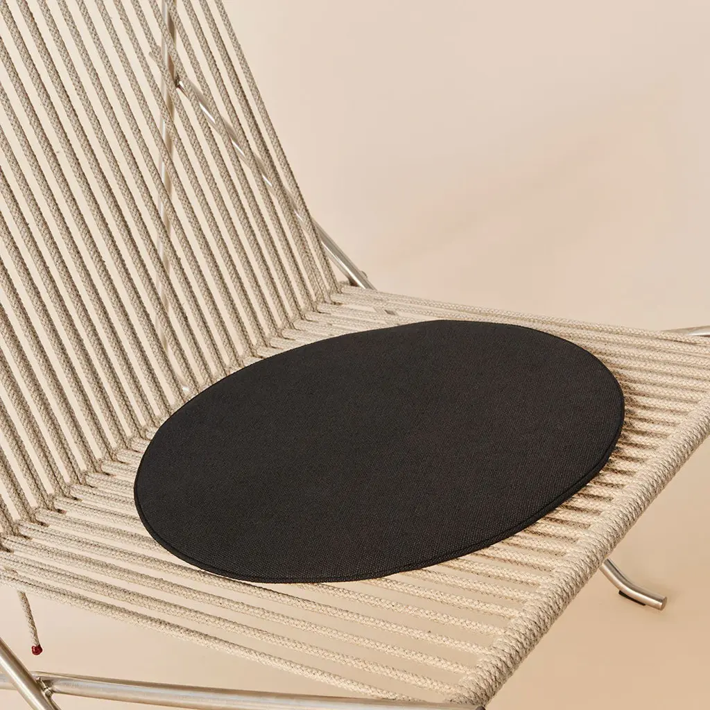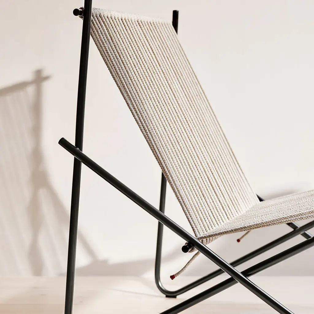 The striking PK4 is a modern, relaxed lounge chair that radiates Poul Kjærholm's distinctive elegance through a light, minimalistic expression in steel and flag halyard. It perfectly exemplifies Kjærholm's visionary approach where art and design intersect. Designed in 1952, the lounge chair was originally made as a limited edition for family and friends. The PK4 lounge chair consists of two materials - one unbroken halyard length and seven steel tubing pieces welded into a unified frame. Now available in three configurations: Black powder-coated steel with natural halyard; Stainless steel with natural halyard; or Stainless steel with black halyard. An additional cushion is available in three configurations: Natural canvas, Black canvas and Black Grace leather.
