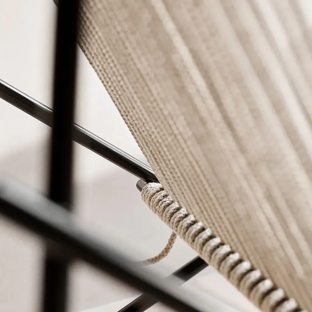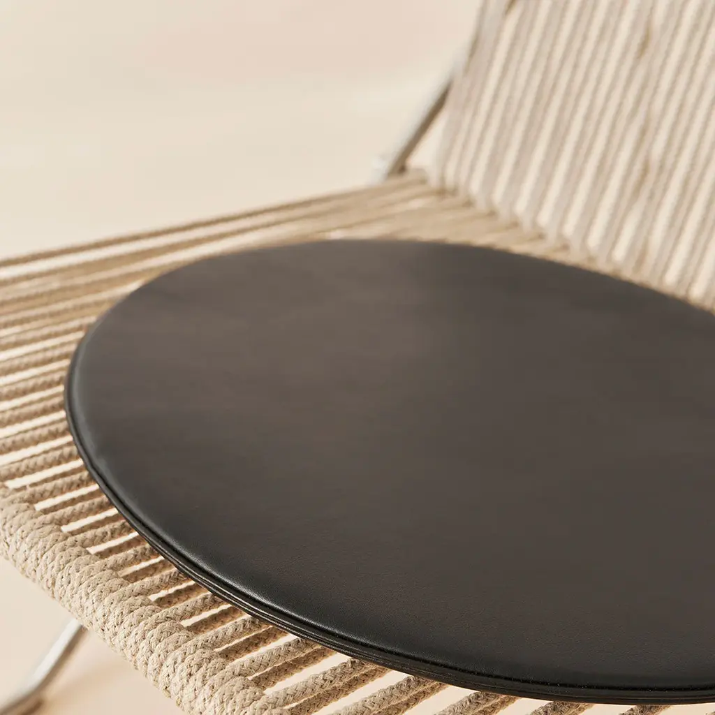 The striking PK4 is a modern, relaxed lounge chair that radiates Poul Kjærholm's distinctive elegance through a light, minimalistic expression in steel and flag halyard. It perfectly exemplifies Kjærholm's visionary approach where art and design intersect. Designed in 1952, the lounge chair was originally made as a limited edition for family and friends. The PK4 lounge chair consists of two materials - one unbroken halyard length and seven steel tubing pieces welded into a unified frame. Now available in three configurations: Black powder-coated steel with natural halyard; Stainless steel with natural halyard; or Stainless steel with black halyard. An additional cushion is available in three configurations: Natural canvas, Black canvas and Black Grace leather.