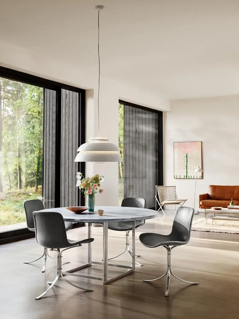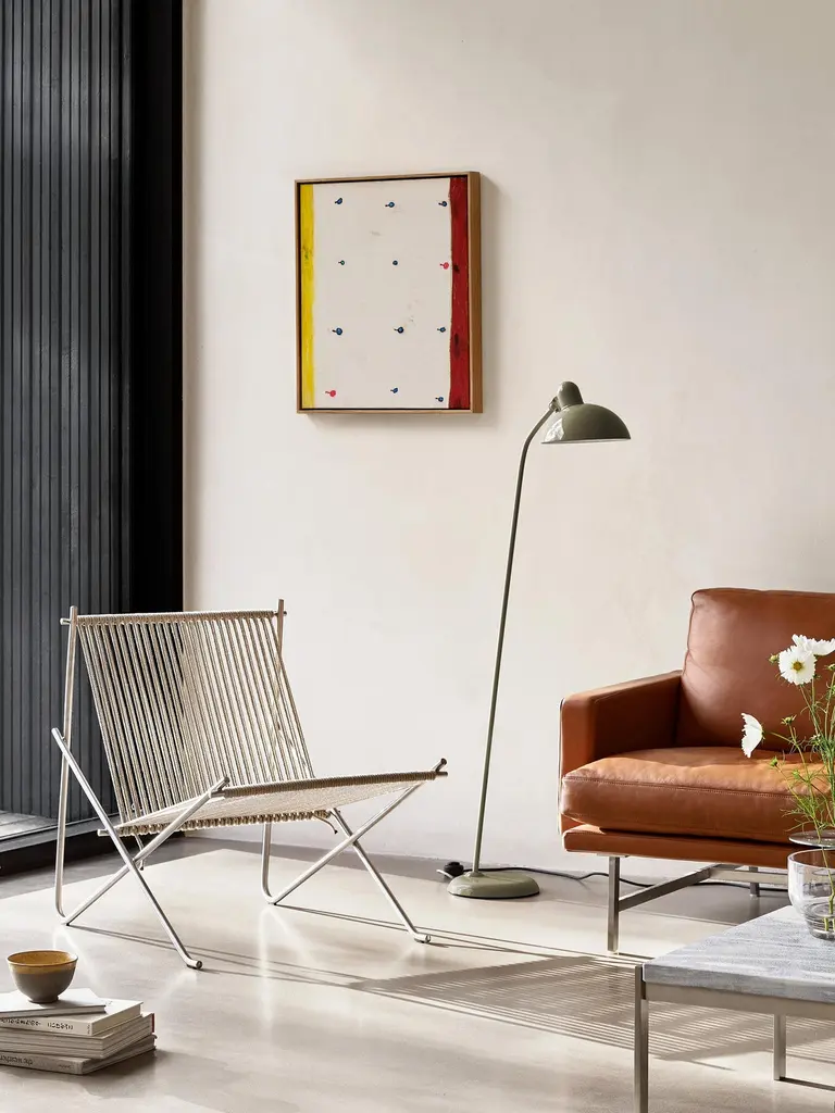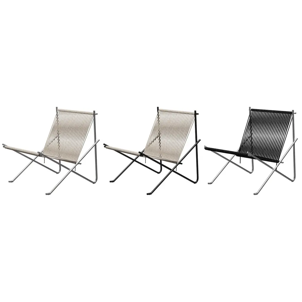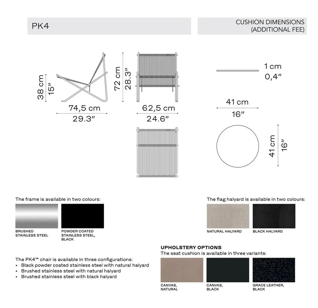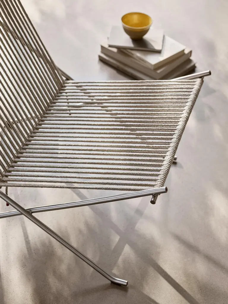 'PK4' Lounge Chair for Fritz Hansen in Natural Flag Halyard with Steel Frame.Established in 1872, Fritz Hansen has become synonymous with legendary Danish design. Combining timeless craftsmanship with an emphasis on sustainability, the brand’s re-editions of iconic pieces from such Danish Modern greats as Arne Jacobsen, Hans J. Wegner, and Vico Magistretti pay homage to the originals while thoughtfully incorporating innovation and responsibly sourced materials.Originially designed in 1952, the PK4 lounge chair perfectly exemplifies Kjærholm's visionary approach where art and functionality intersect. Executed in seven steel tubing pieces welded into a unified frame upon which 216 feet of flag halyard is hand-woven. Its minimalistic yet durable design makes PK4 a captivating addition to a wide variety of interior settings.Price per item. Available in unlimited quantities in choice of natural flag halyard with steel frame, natural flag halyard with black frame, or black flag halyard with steel frame. Also available with additional cushion in choice of black canvas, natural canvas, or black leather for additional fee. This listing is for the PK4 in natural flag halyard with steel frame.In stock lead time of 12-16 weeks. Out of stock can add an additional 8 weeks or more. Please note that lead times, cost and inventory availability are subject to change without notice. Please inquire for current lead times prior to placing time sensitive orders.Please note that all Fritz Hansen furniture pieces must ship directly from the manufacturer; as such, 1stDibs arranged shipping is not an option. Local pickup from our Los Angeles based showroom, however, is available. Kindly contact us for the most accurate shipping rates prior to purchasing.Made to order. All sales final.