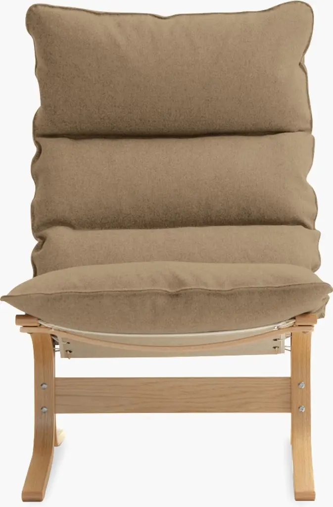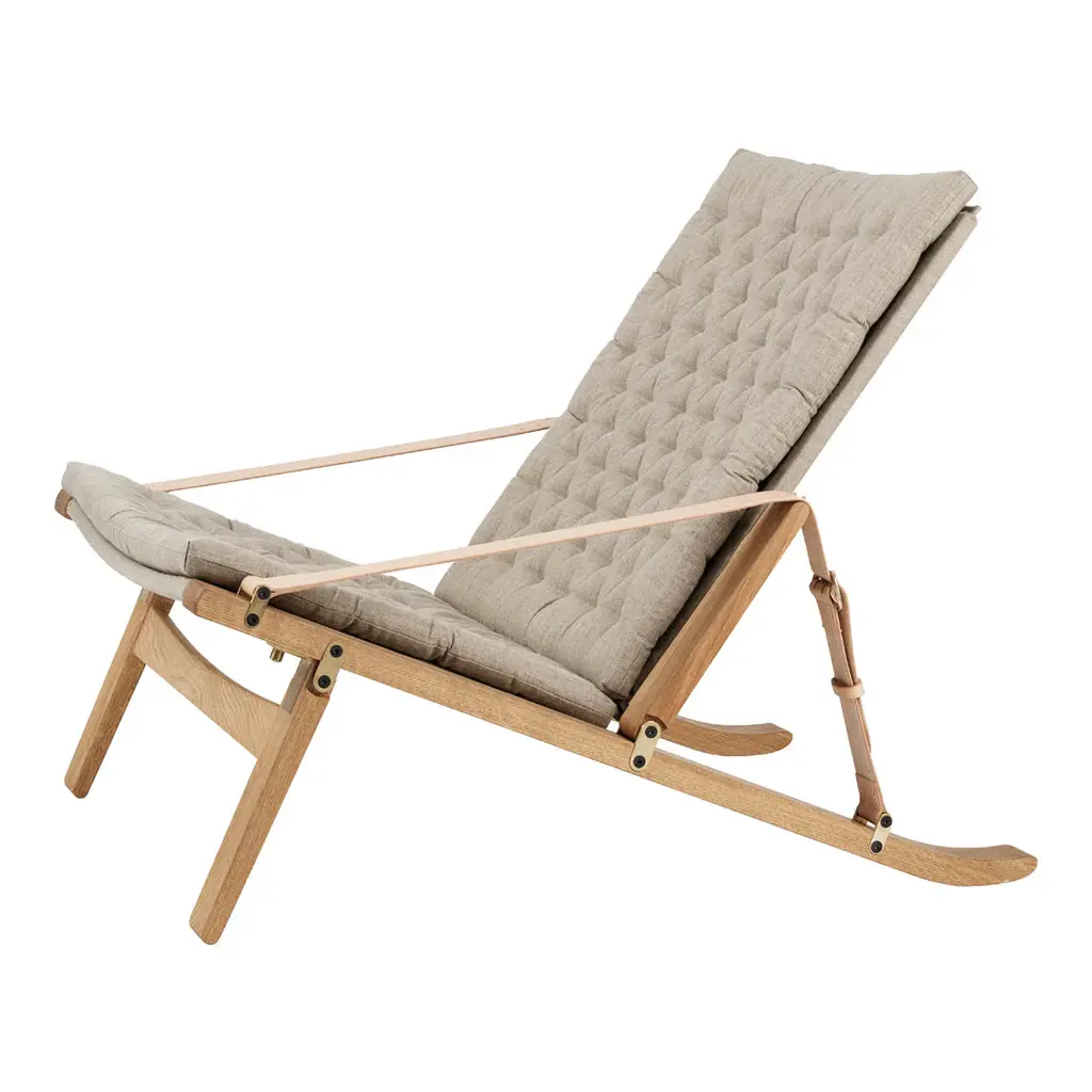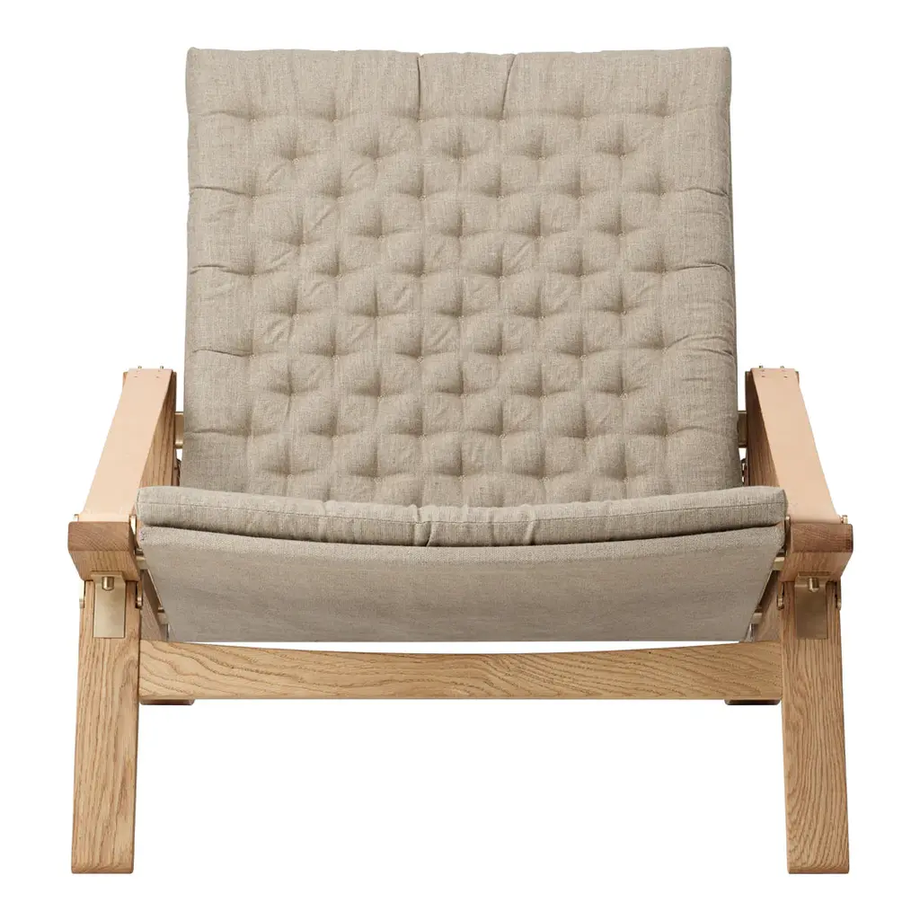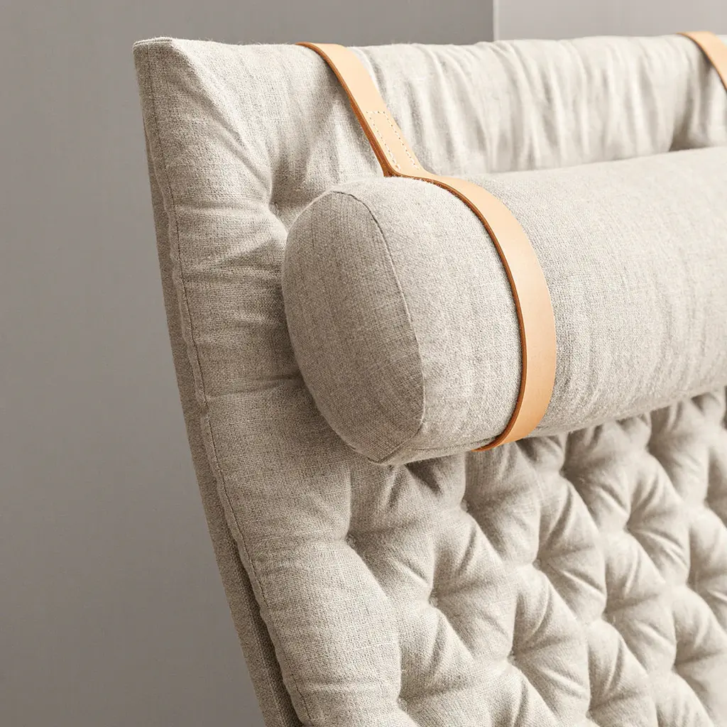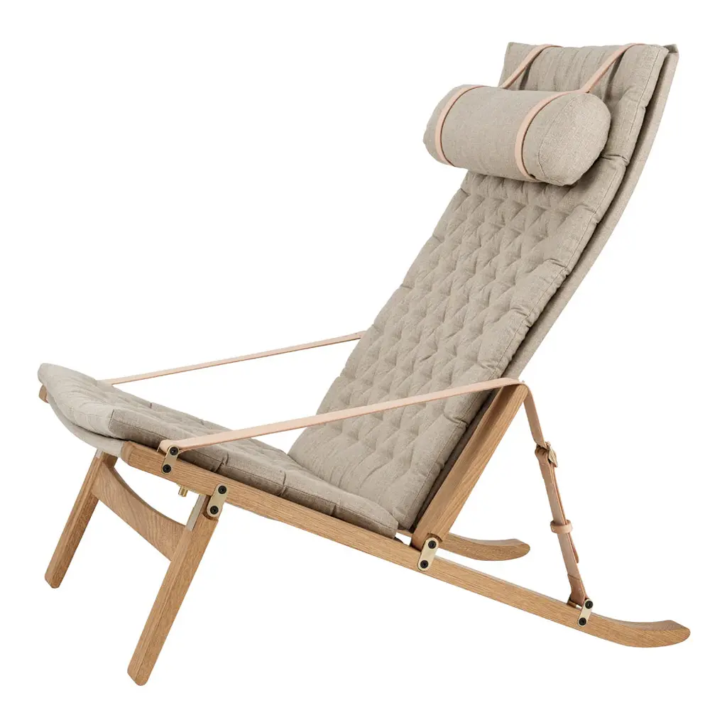 When designing the Plico Chair, Danish design duo Preben Fabricius and Jørgen Kastholm sought to create a chair that takes up as little space as possible when not in use while not compromising on comfort. Looking to highlight what other designers often seek to hide, they created a deceptively simple design with visible joints, beautiful brass fittings and accomplished craftsmanship. Available in a high and low back version, the solid oak frame and curved rear legs are shaped for stability. The back and seat, fitted with corresponding cushions, are upholstered in stitched linen canvas to provide an elegant expression and supreme sitting comfort. The adjustable backrest folds completely and saddle leather armrests complete the design, giving it a distinctive expression full of character. The Highback version of the chair includes a neck cushion.