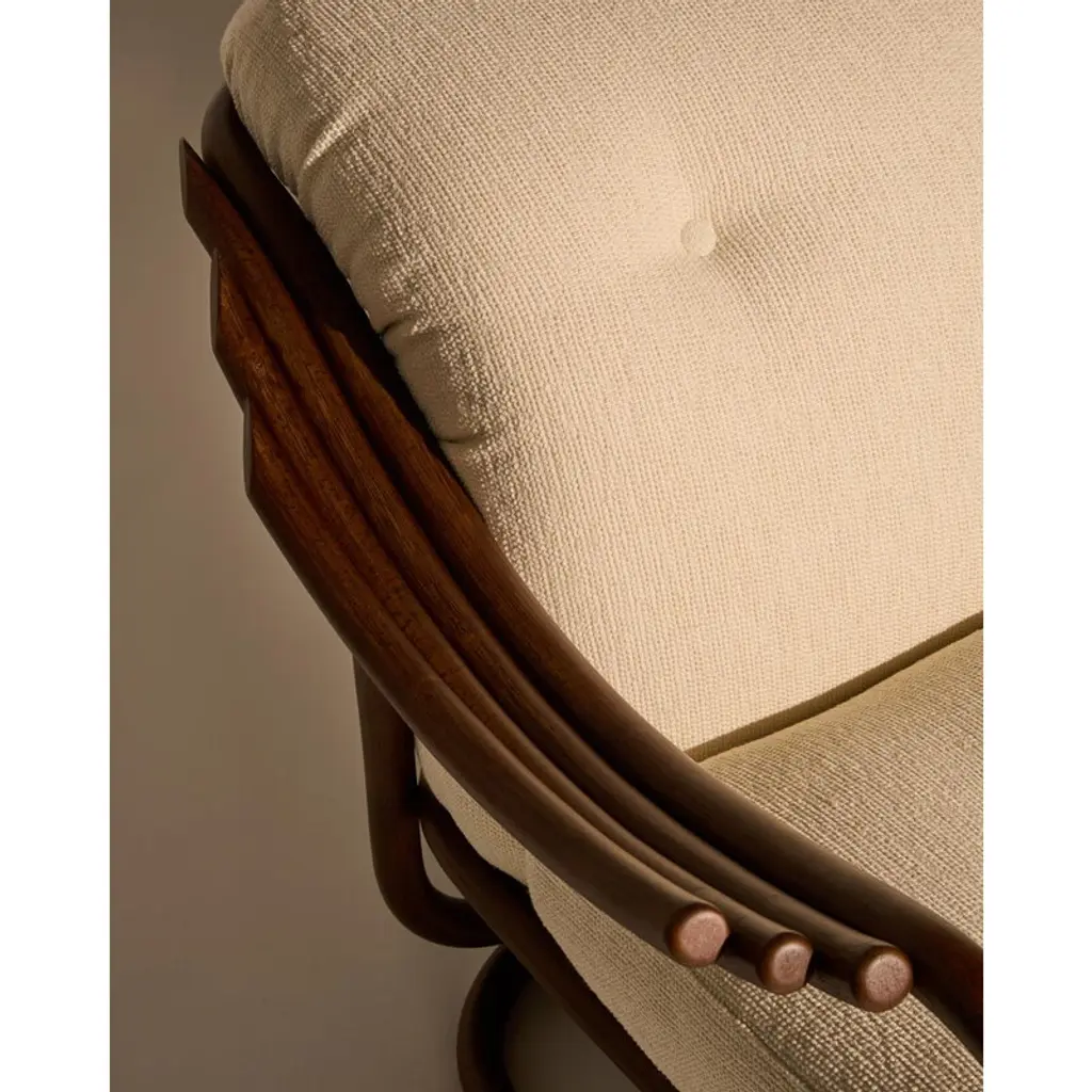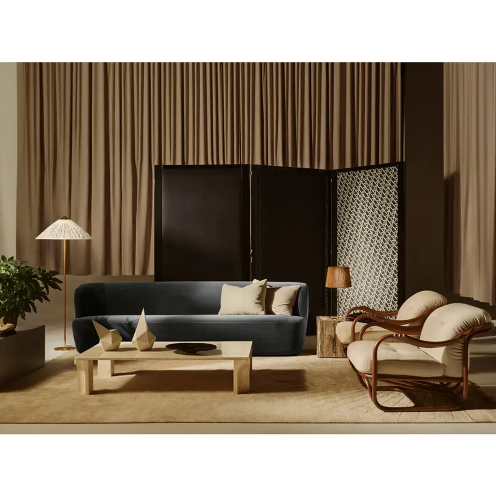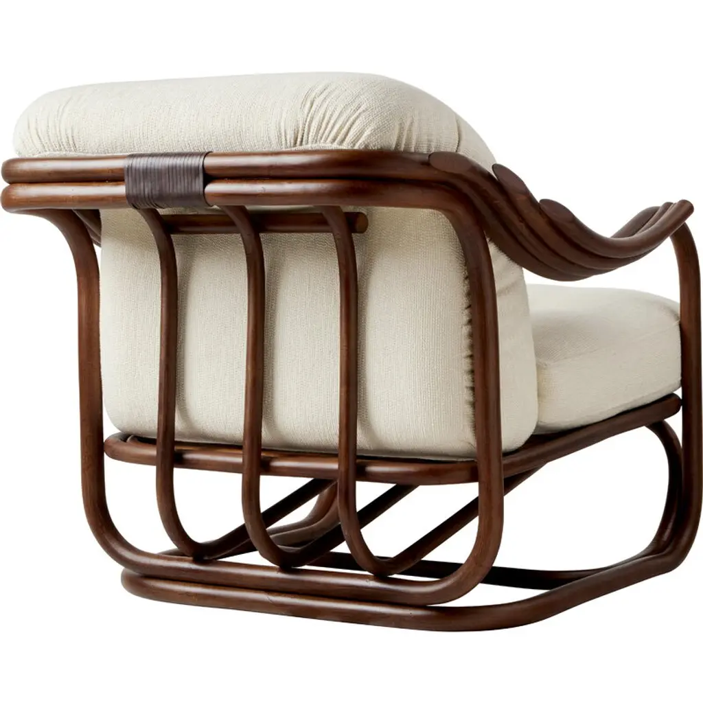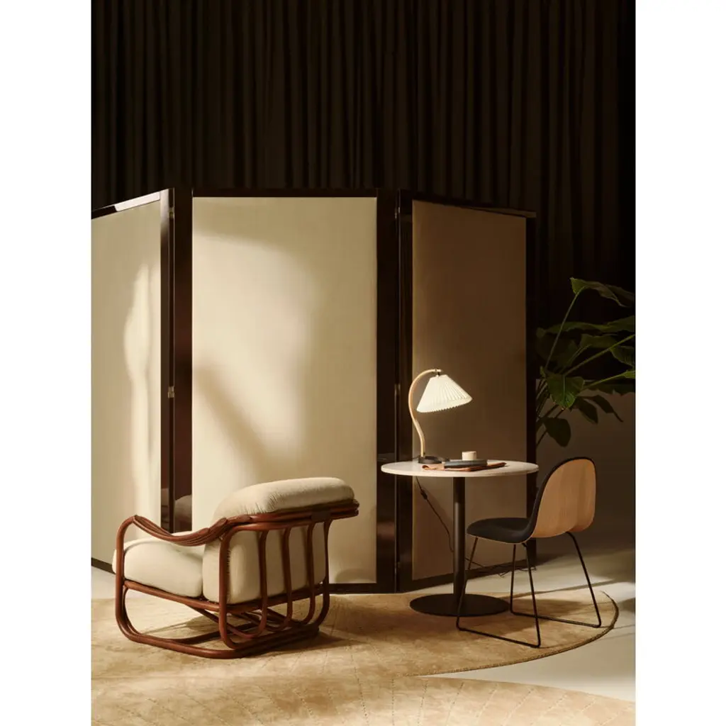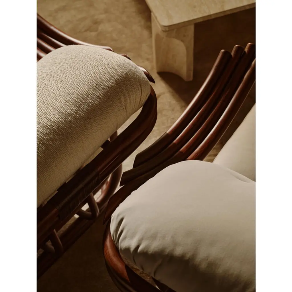 GUBI’s Poltrona Tria lounge chair showcases Italian architect and designer Carlo De Carli’s exploration of an entirely new material: rattan. It’s safe to say his first venture was a success — the gracefully curved lines of the Poltrona Tria create an exceptionally elegant and comfortable chair, whose natural look brings character to both private living rooms and public spaces alike. The name Poltrona Tria refers to the chair’s distinctive three-part armrests. The lounge chair's lightweight yet durable frame is made from natural rattan, steam-bent by hand and finished in a semi-gloss chestnut tone. GUBI has introduced several modern updates to the original 1970s design. The former fabric webbing has been replaced with rattan, creating a more cohesive appearance while also improving support and comfort. On top of the rattan seat rest plush cushions upholstered in GUBI’s luxurious Bbouclé wool blend that adds a soft and sophisticated touch to the overall look of the lounge chair.