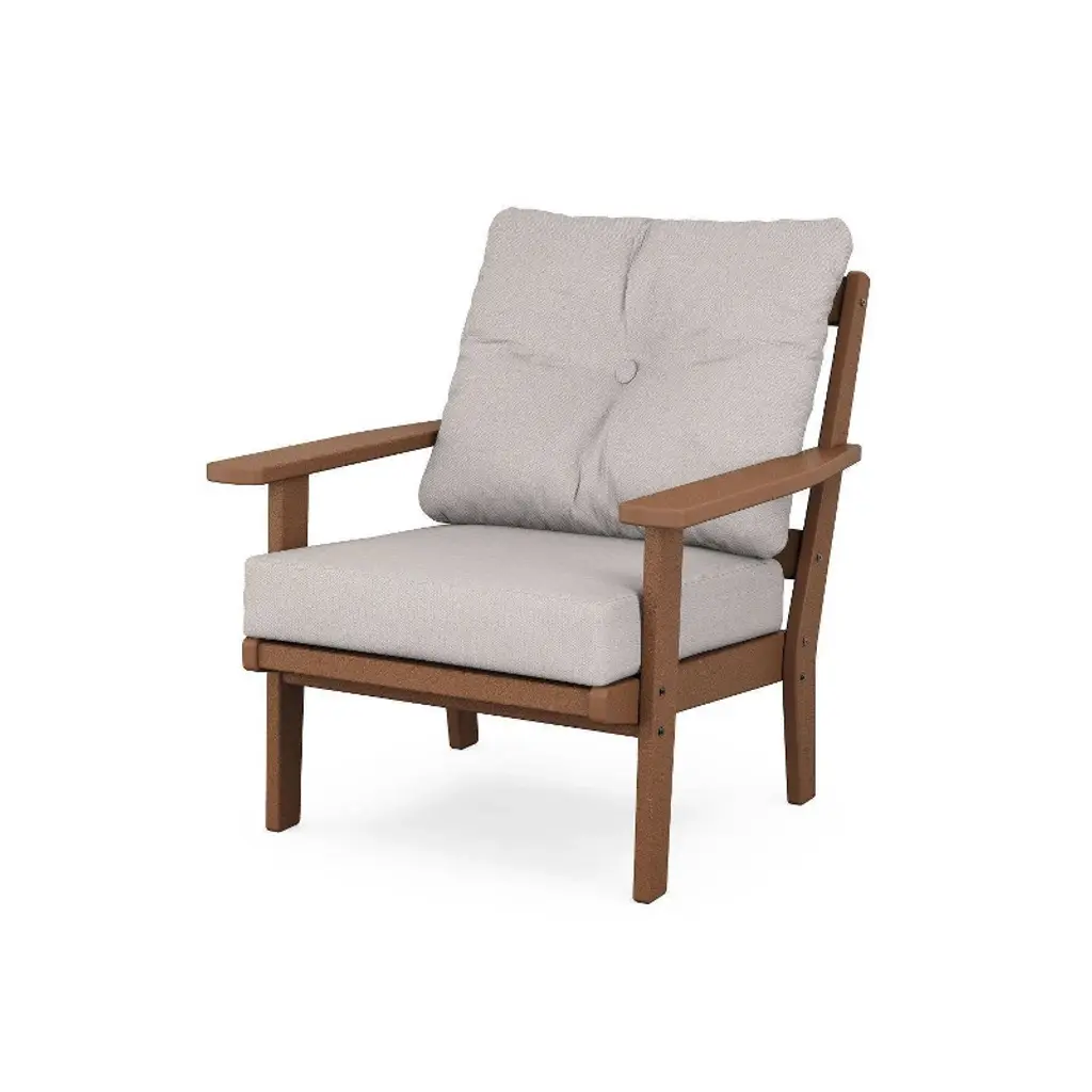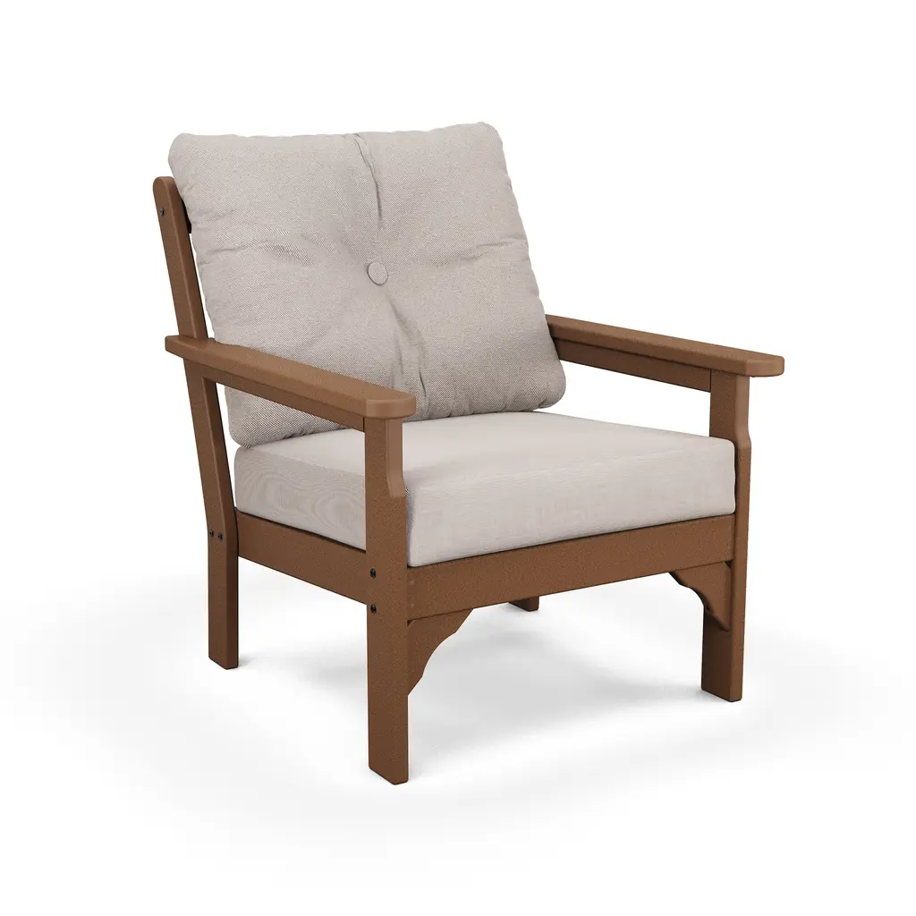 Plush cushions, an ergonomically inclined back and an eco-friendly construction make the Vineyard Deep Seating Chair by POLYWOOD® a must have this summer. Whether unwinding at the end of the day with a glass of wine or enjoying family time around the pool, the button backed all-weather fabric cushion will provide the right amount of support and relaxation. The fade resistant seat cushions are the perfect addition to the ultra weather-resistant recycled plastic lumber frame featuring stainless steel hardware. Say goodbye to high-maintenance patio furniture and say hello to the best in outdoor luxury with Vineyard Deep Seating.