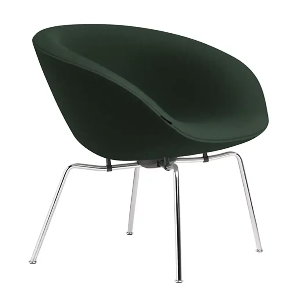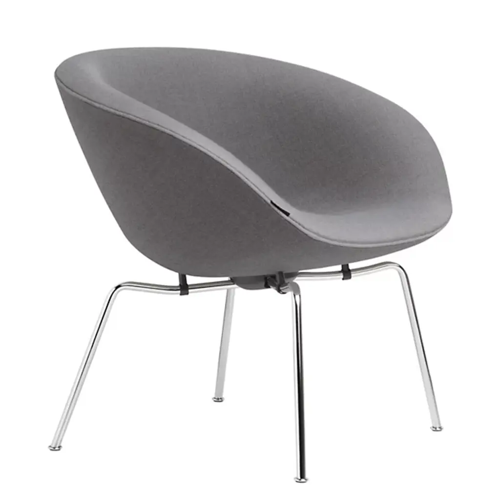 The Pot Lounge Chair from Fritz Hansen is a delightful Scandinavian modern design originating from the Arne Jacobsen original implemented for the renowned SAS Royal Hotel in Copenhagen. This redesign puts a new spin on the classic lounge chair, giving a confident and enduring appeal perfect for public lounge areas or residential gathering spaces. A sleek, four-legged frame extending from a central hub supports the seat, and an upholstered, shell-style seat offers both arm and back support. The full upper shell contrasts with the slender, strong stand, keeping the design of its original seat in mind while improving both the build quality and comfort of the iconic chair while providing the same inviting character.