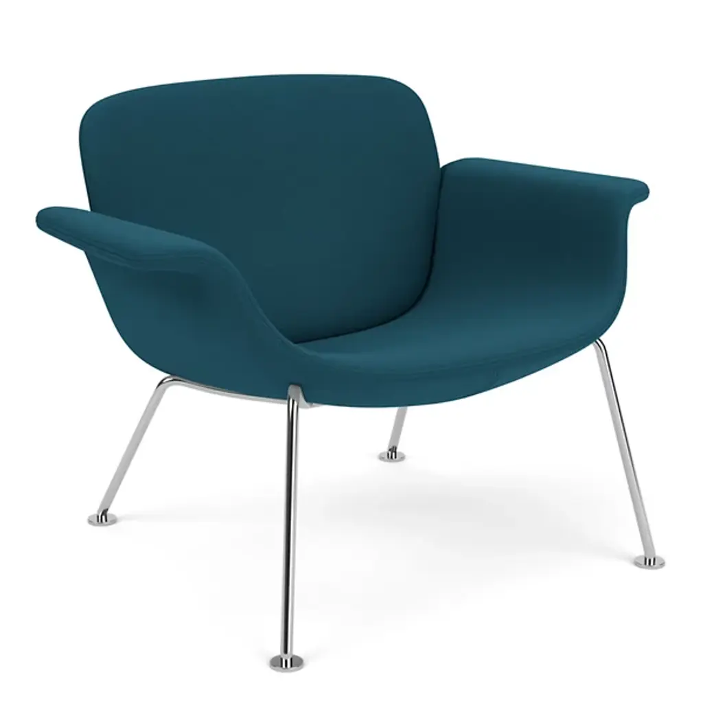The Pot Lounge Chair from Fritz Hansen is a delightful Scandinavian modern design originating from the Arne Jacobsen original implemented for the renowned SAS Royal Hotel in Copenhagen. This redesign puts a new spin on the classic lounge chair, giving a confident and enduring appeal perfect for public lounge areas or residential gathering spaces. A sleek, four-legged frame extending from a central hub supports the seat, and an upholstered, shell-style seat offers both arm and back support. The full upper shell contrasts with the slender, strong stand, keeping the design of its original seat in mind while improving both the build quality and comfort of the iconic chair while providing the same inviting character.