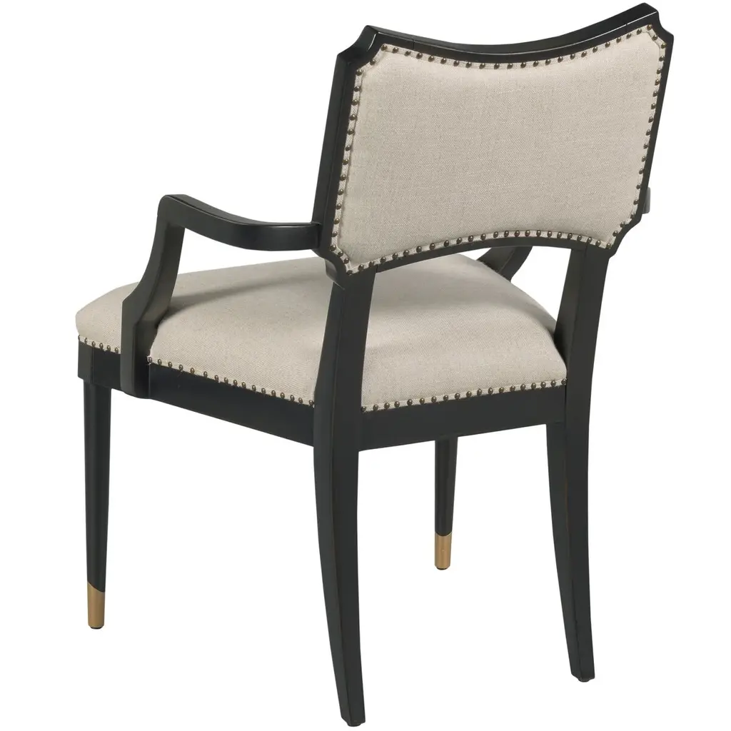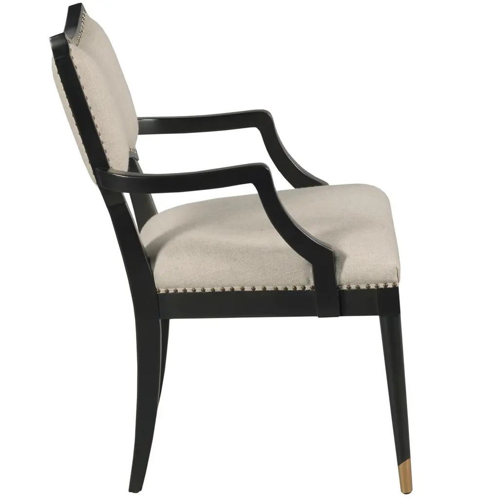French Empire seating inspired this armchair's refined balance of smooth curves and straight lines. The pale shade of stain-resistant upholstery accentuates the lustrous black finish of the frame, as do the brass nailhead trim and front-leg ferrules. Webbed seat support and high-density foam cushioning ensure that the chair is as comfortable as it is elegant.