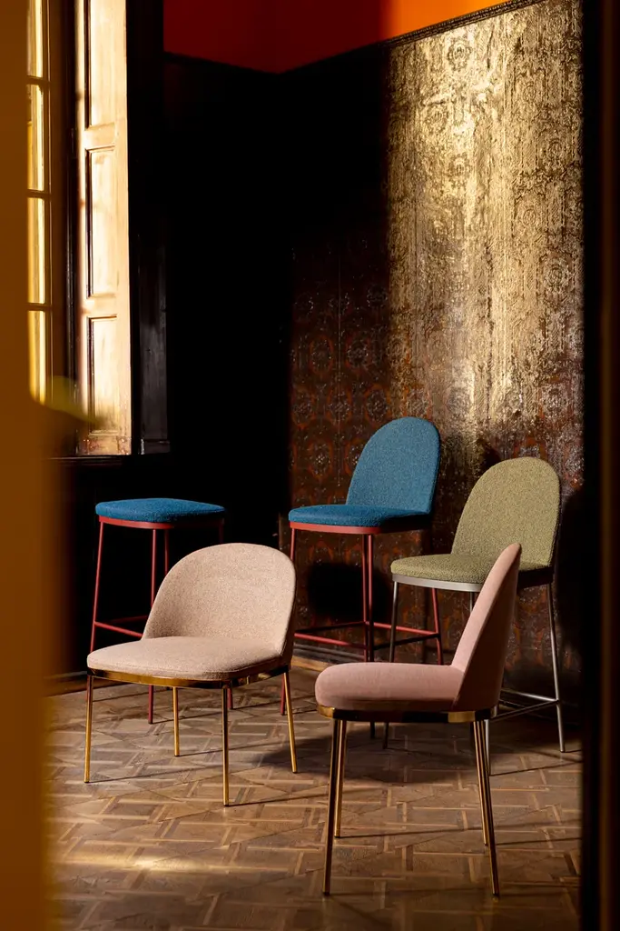 The Precious armchair design is an attempt to slim down the cross-section to the lowest limit possible in order to create a lightweight, elegant product that would defy the laws of physics. The product’s minimalist shape nevertheless is combined with solidity, making it suitable for heavy-duty use, such as in the contract industry. A perfect combination, therefore, and not a contraposition between crisp, clear-cut shapes and solidity. In line with the trending taste and love for “precious” materials, the Precious collection offers a rich variety of fabrics and finishes and pays meticulous attention to detail.The legs of the armchairs are extremely slender and the chrome-plated or painted steel plate forming the base of the seat sports a minimalist design reminiscent of the shape of a thin ring or wedding ring.Injected flame-retardant flexible poliurethane foam (complying with Cal TB117 free of flame retardants) over internal steel frame. Available, without surcharge, polyurethane complying with BS 5852, crib 5. Varnished or chromed stainless steel base as per finishes below.Polypropylene gliders.Available in fabric or leather. The Precious collection covers are not removable.