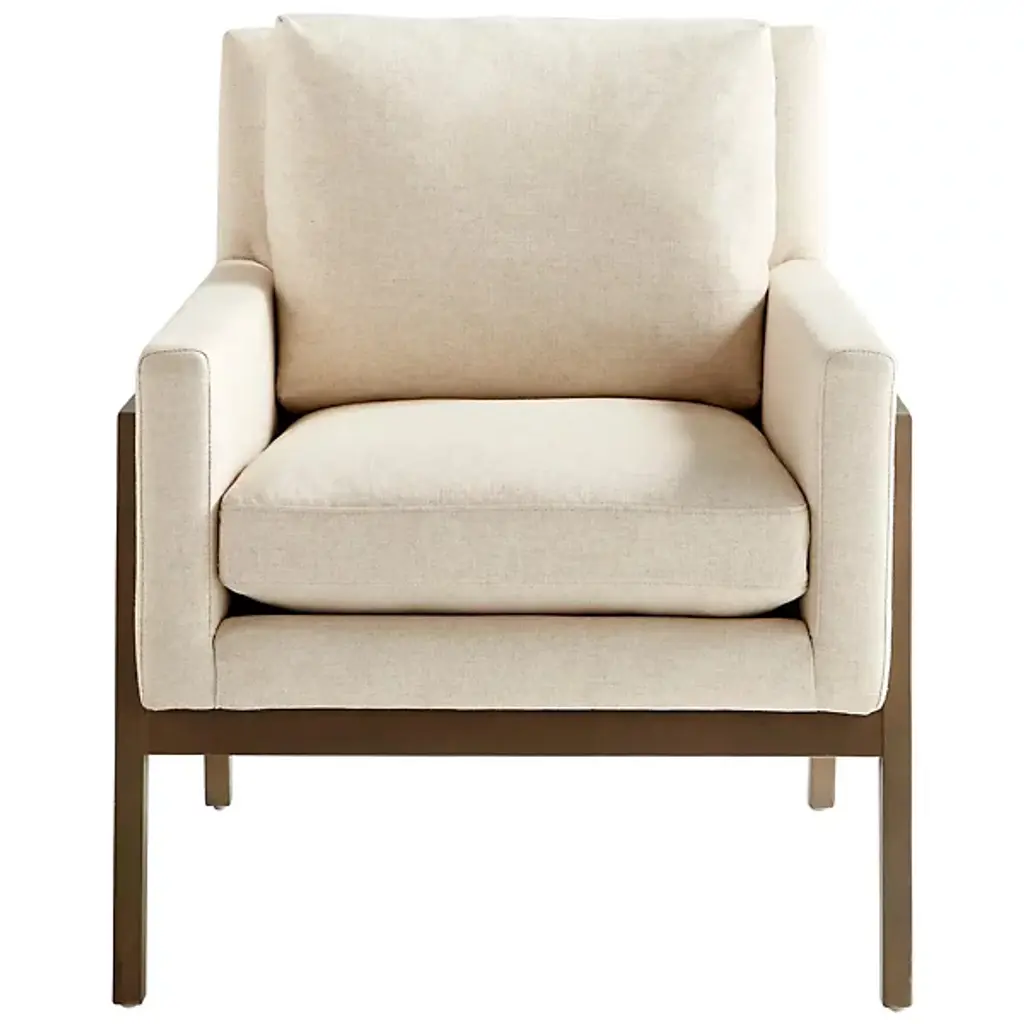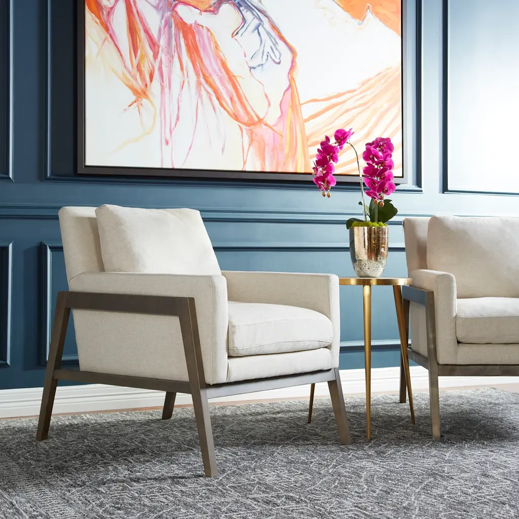 Complete the look of your living room or den whilst adding a new level of comfort, with the Presidio accent chair. Perfectly at home in contemporary or transitional aesthetics, the frame of this piece is crafted from solid wood in a natural mocha finish, and upholstered in a solid cream hue that is filled with foam. It features a cushioned back and flared arms. To care for this piece, we recommend only spot cleaning as needed.