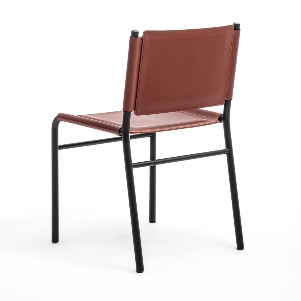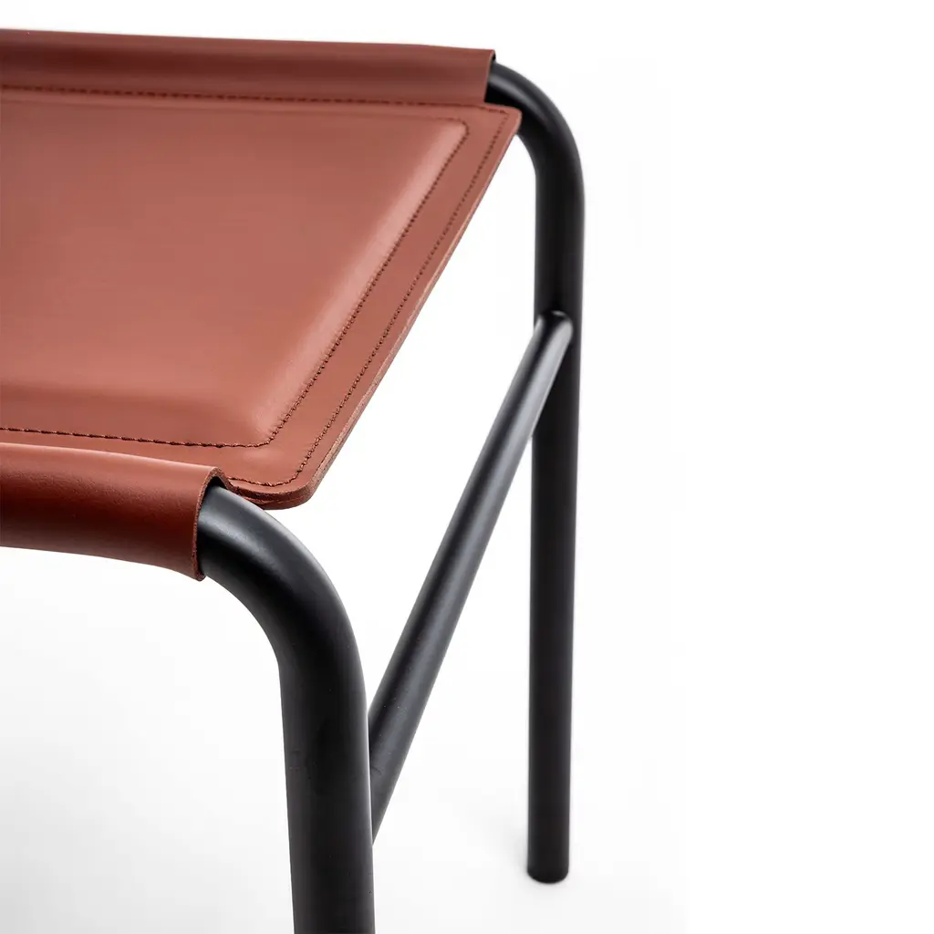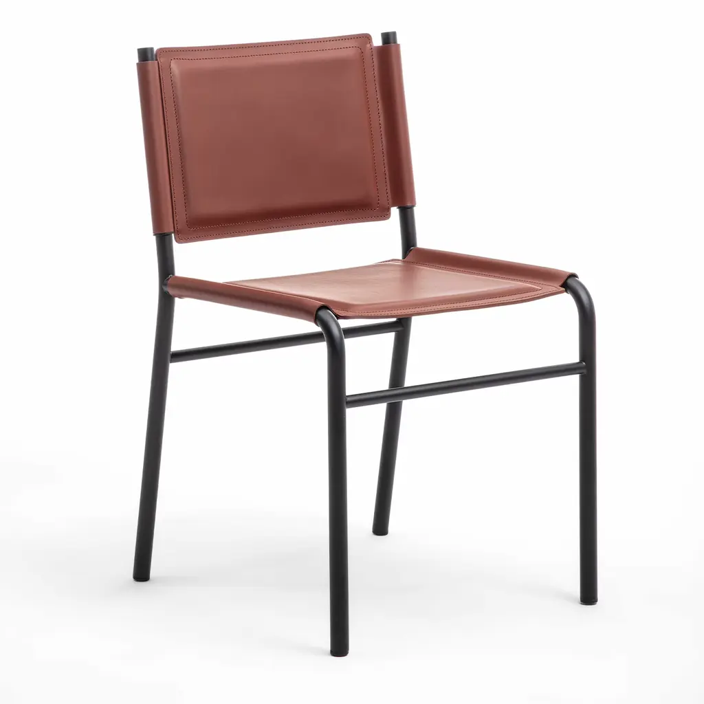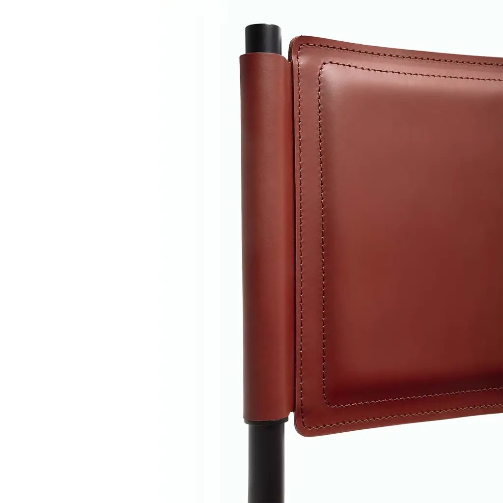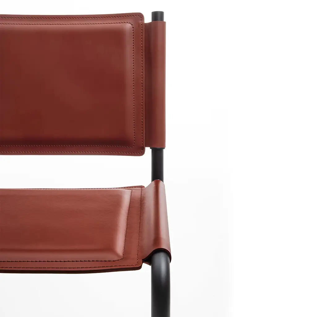 The Pris Chair features a sleek black-painted tubular metal structure, combining modern design with refined craftsmanship. The seat and backrest are generously padded and upholstered in luxurious red leather, offering both comfort and sophistication. A perfect fusion of bold elegance and contemporary style, this chair adds a striking touch to any refined interior.