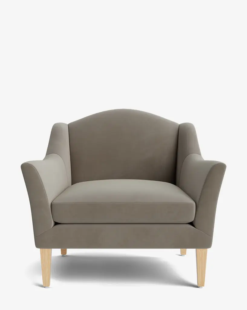 Made to order with a classic silhouette, the Prudence Chair has tapered oak legs that hold its frame with elegantly curved arms and a rounded top. Designed to complement and elevate your home, the chair is available in a selection of high-quality fabrics that highlight its timeless structure.