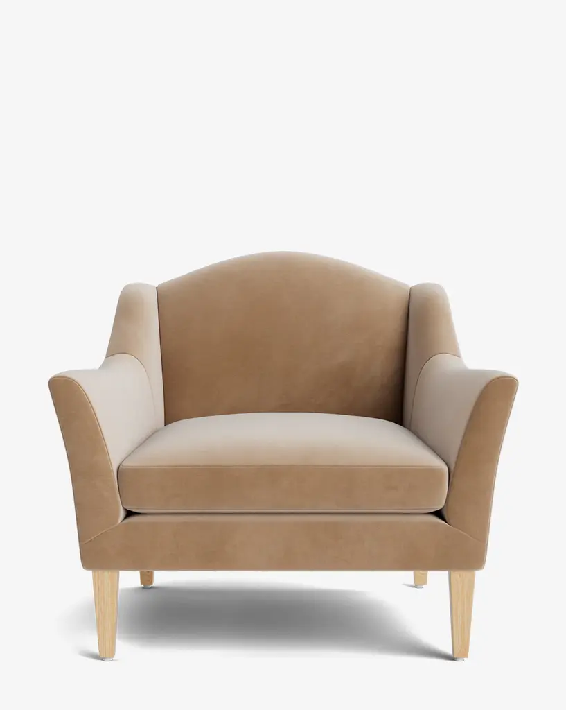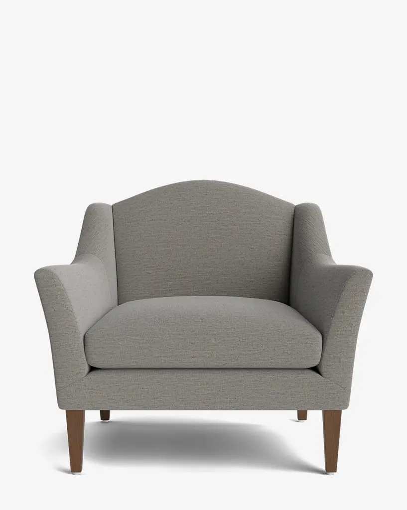 Made to order with a classic silhouette, the Prudence Chair has tapered oak legs that hold its frame with elegantly curved arms and a rounded top. Designed to complement and elevate your home, the chair is available in a selection of high-quality fabrics that highlight its timeless structure.