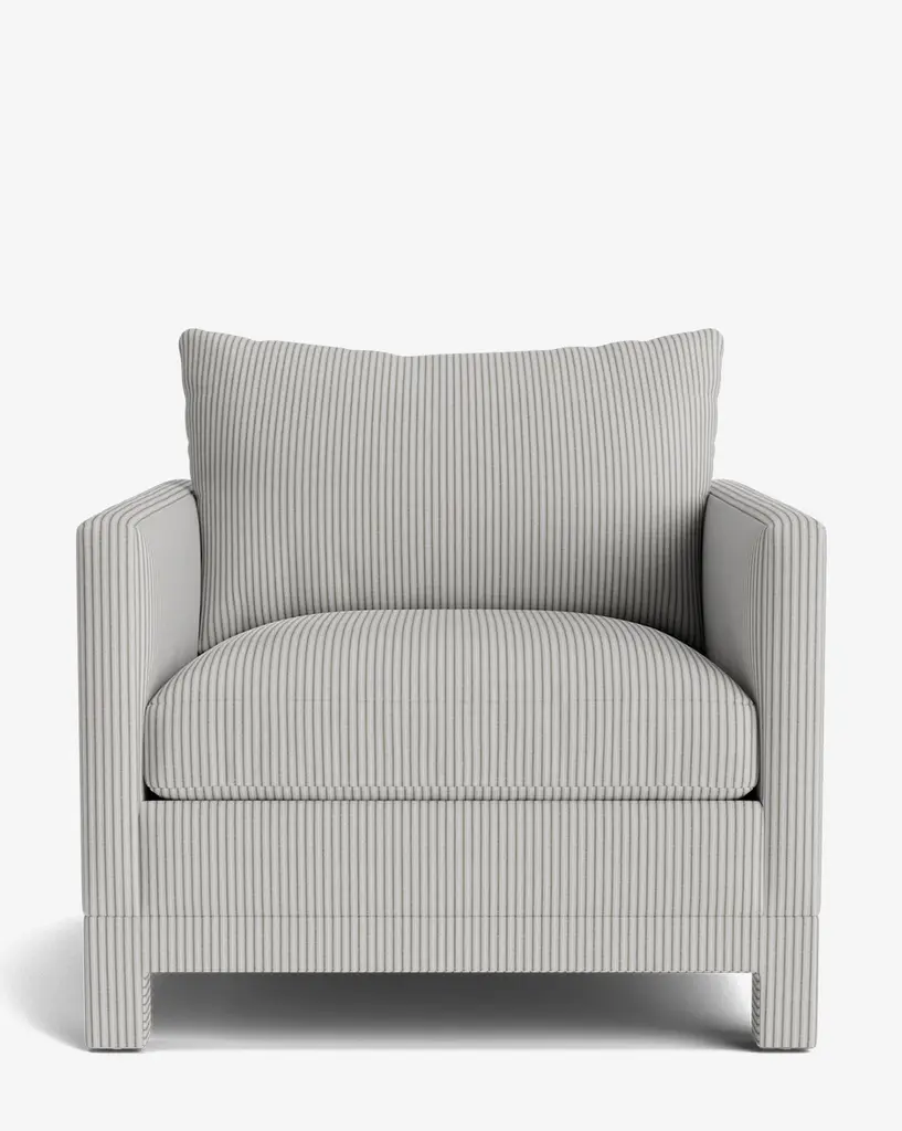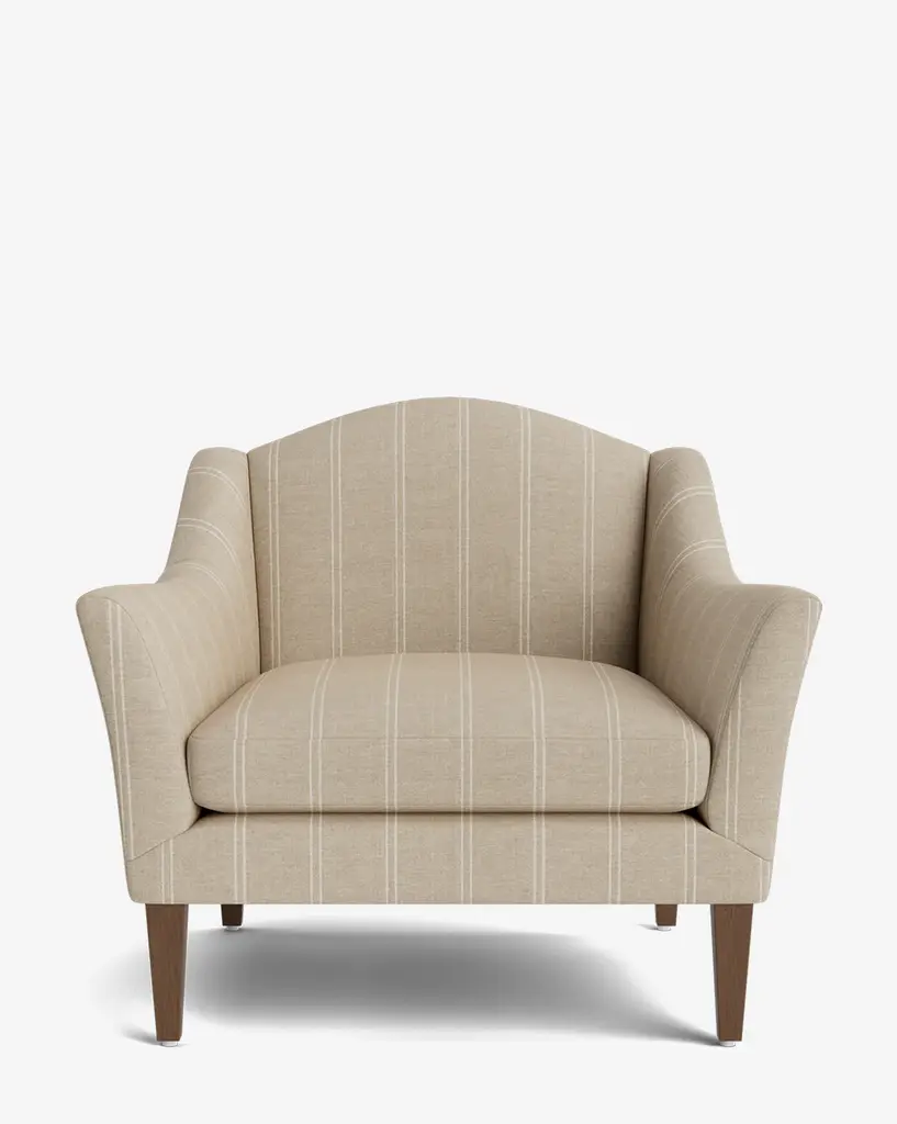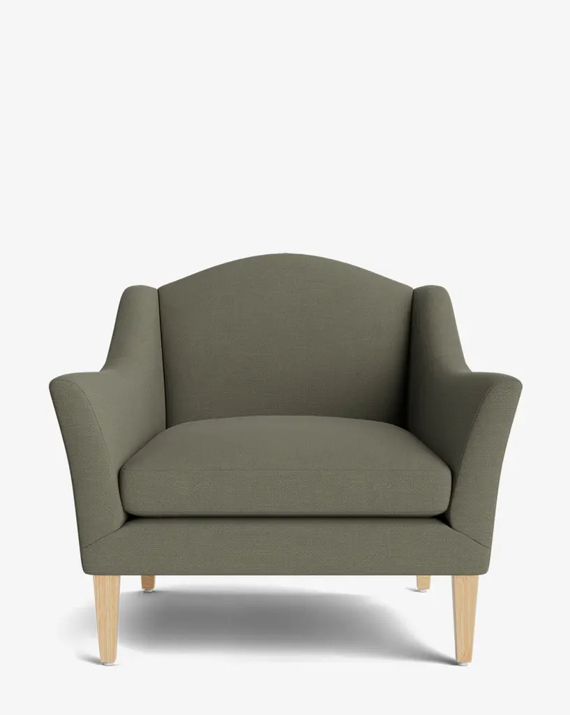 Made to order with a classic silhouette, the Prudence Chair has tapered oak legs that hold its frame with elegantly curved arms and a rounded top. Designed to complement and elevate your home, the chair is available in a selection of high-quality fabrics that highlight its timeless structure.
